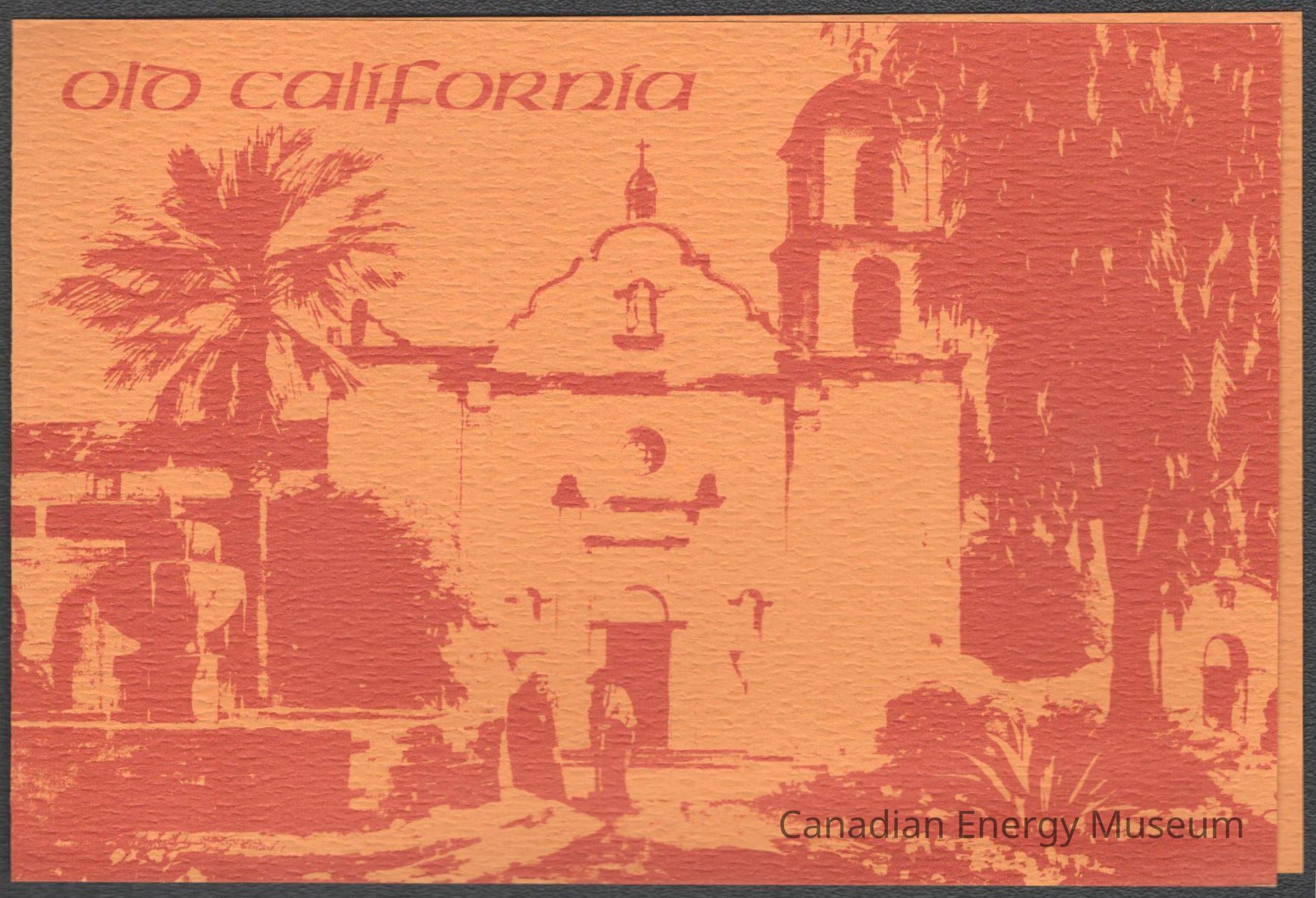 A landscape greeting card, with a printed welcome to the "Old California" Party, 26 August, 1971. The front cover features an illustration of a Spanish-colonial-style building and the text "Old California". The interior reads: "The Long Beach Club; Welcomes You; to the; "Old California" Party; Music by; Oscar Amezcua Mariachis; Guadalajara, Mexico; August 26, 1971; 8:30 p.m.-10:00 p.m.; Barcelona Room".