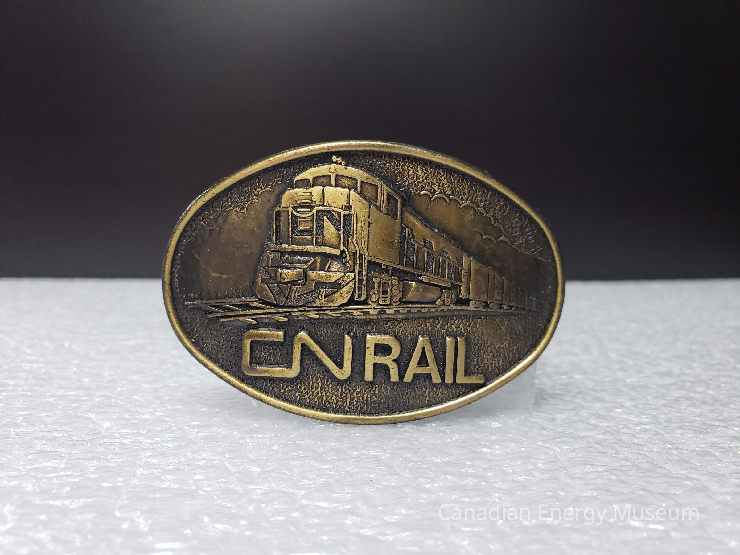 Old Description (Kelsey Dalrymple, 6/3/2020): CN Rail. Oval brass belt buckle with train on face.Collection