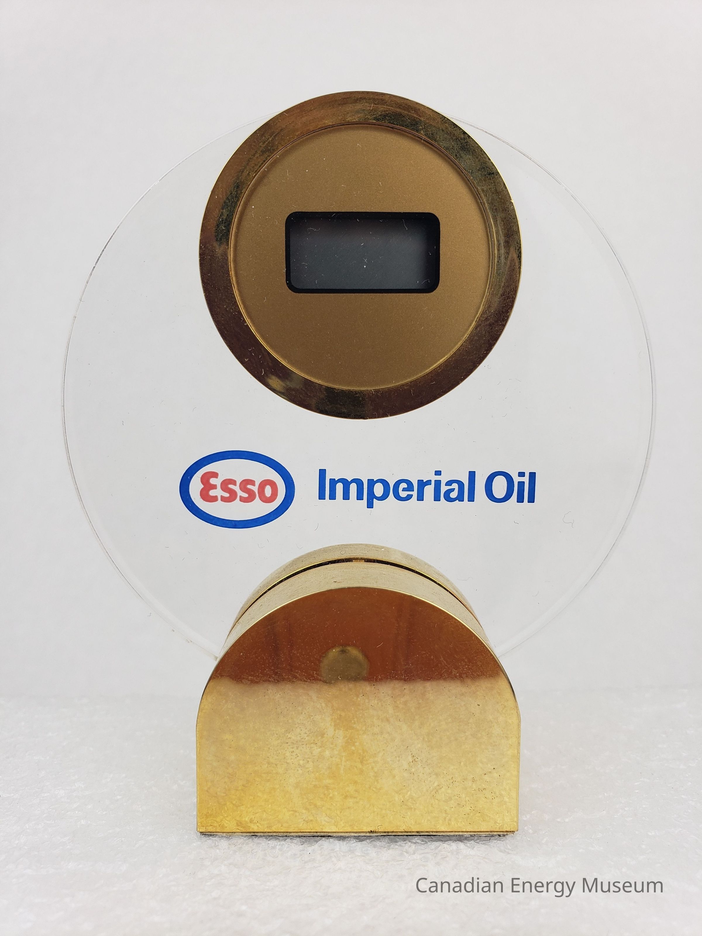 Description: A small desk clock, with a clear plastic centre disk bearing branding, an arch-shaped gold-coloured plastic base, and a gold-coloured plastic digital display surround. The branding is the oval text ESSO logo in blue and red to the lower-left of the clear disk, and "Imperial Oil" in blue to the lower-right.