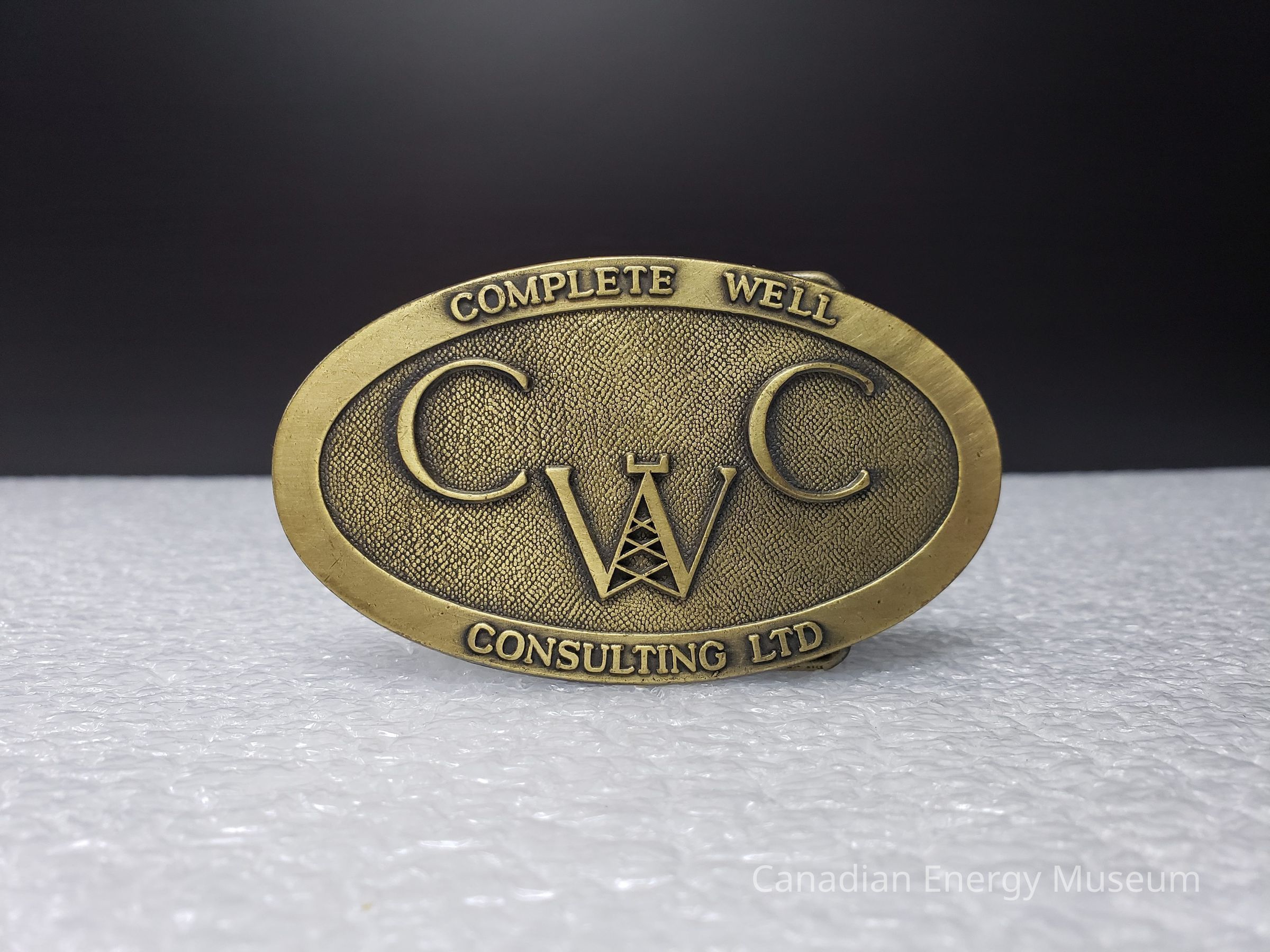 Old Description (Kelsey Dalrymple, 3 June 2020): Complete Well Consulting Ltd. Oval brass belt buckle. W is in the shape of a rig.Collection