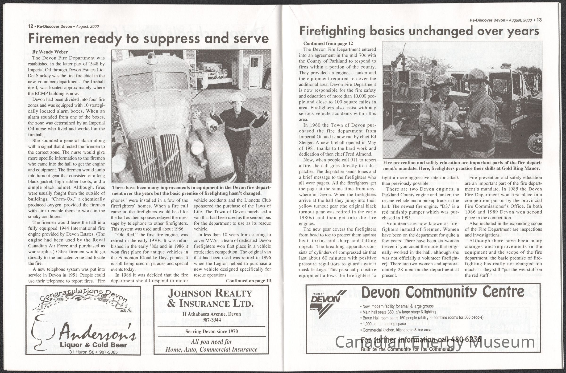 A large-format booklet produced by the Town of Devon for its 50th anniversary. The publication contains brief articles on the town's history and key events/developments.