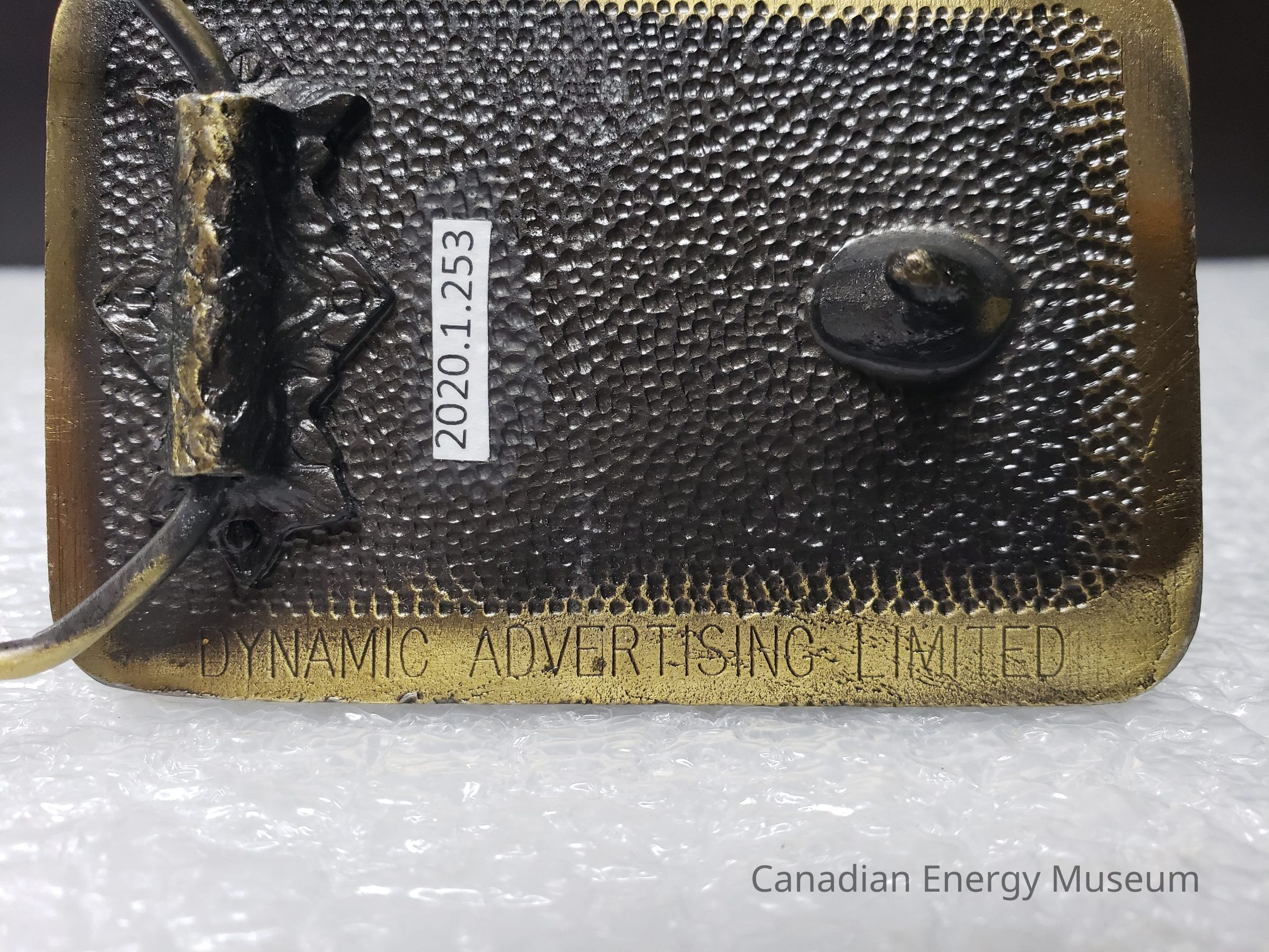 Back Elements: The back has an smooth border slightly brighter coloured than the centre of the buckle. along the bottom of the border is engraved text "DYNAMIC ADVERTISING LIMITED". Within the border the buckle has small little dots creating a rough texture design. The hook is slightly curved and there is a hexagon hook attached at one point with the attachment point being a leafy design.