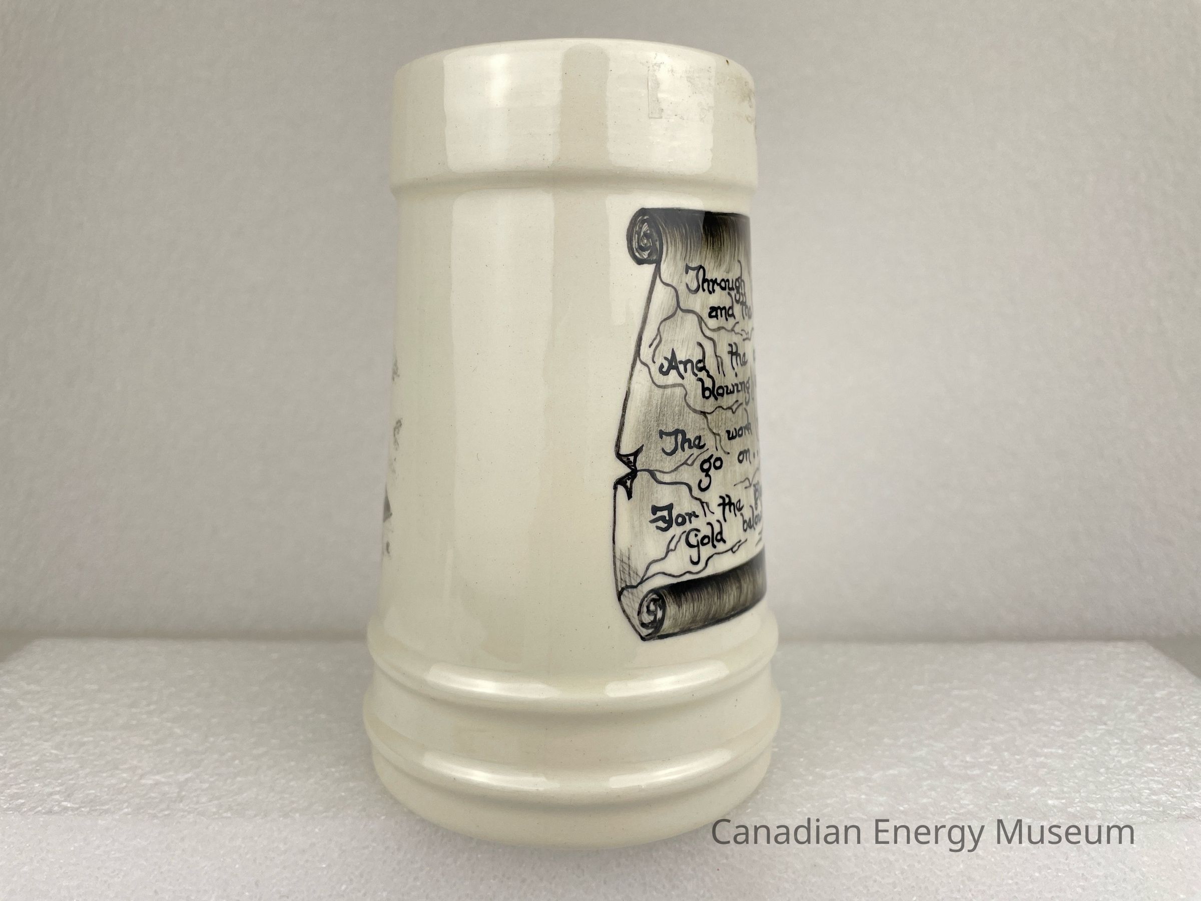 A large ceramic beer tankard hand-painted by McKenzie Originals. The background of the tankard is glazed white with black painted illustrations on either side. On one side of the tankard is a painted image of an oil rig site with multiple buildings, an oil derrick, machinery, a cloudy sky, all resting on a rectangular patch of earth. The other side of the tankard features a painted image of a scroll that has been decorated to look old and cracked. On the scroll is black stylized text reading, "Through ice and the sleet And the cold blowing snow, The work must go on..... For the Black Gold below!"