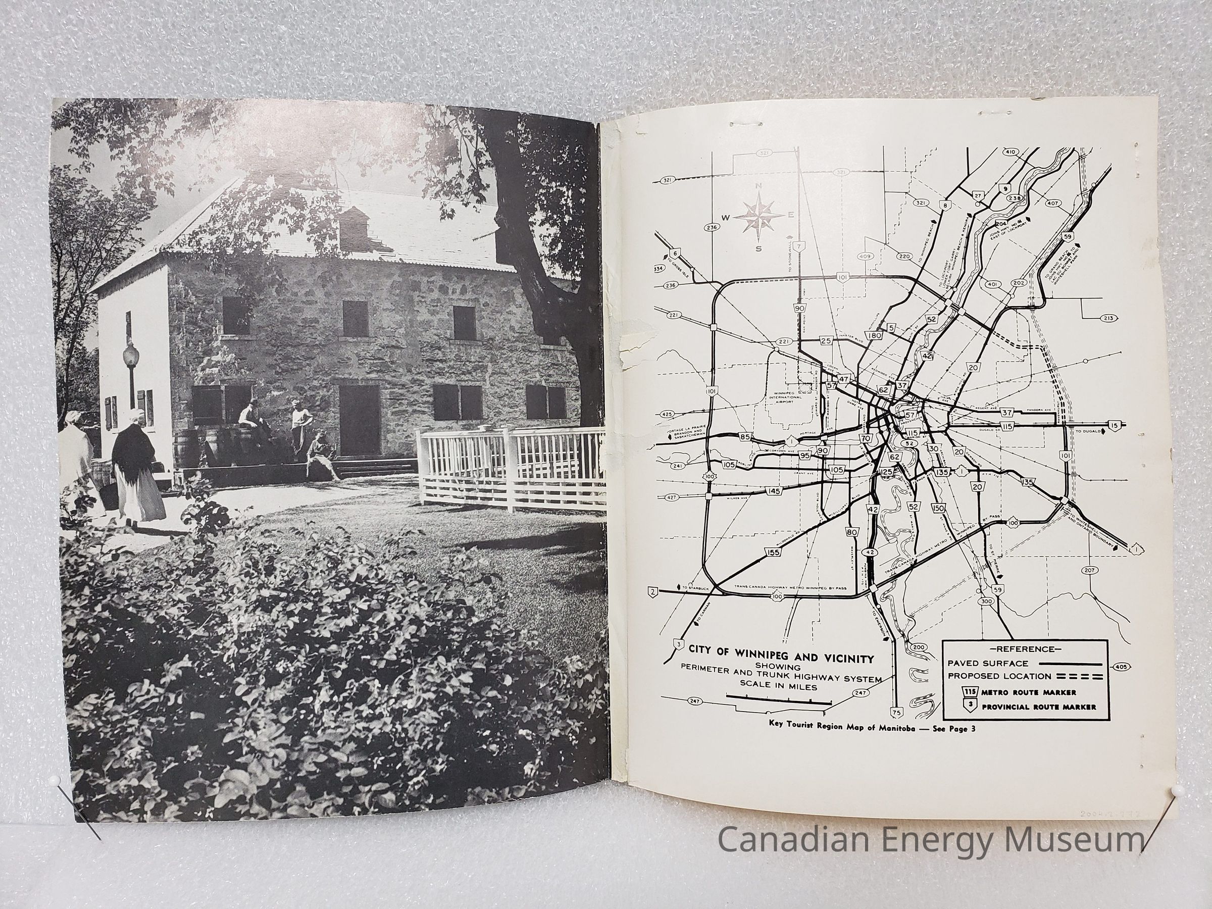 On the inside of the cover is a greyscale photograph of a historical house (left), and a black and white roadmap of the City of Winnipeg and vicinity (right).