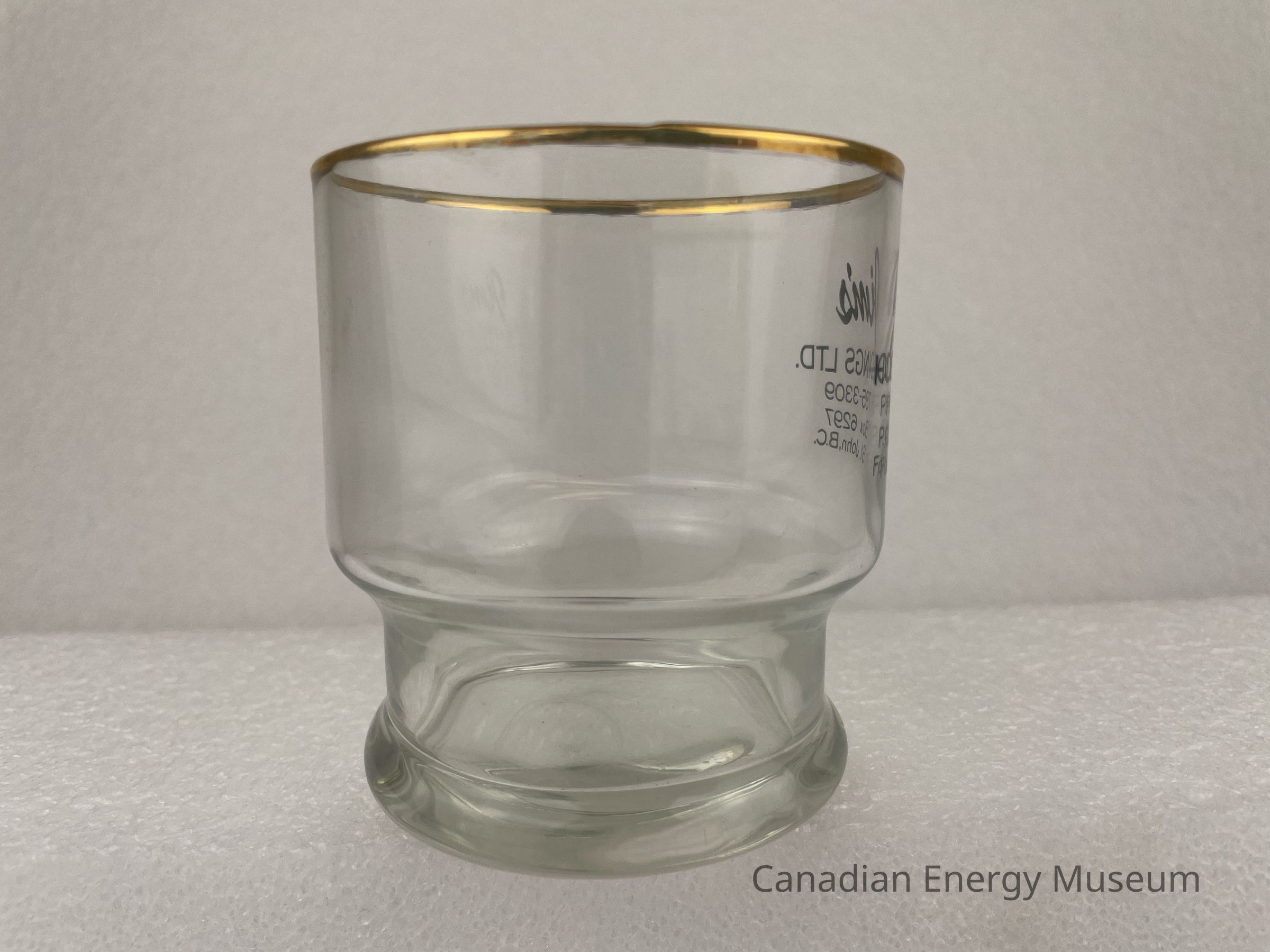 A clear whisky glass with a gold rim branded to Jim's Holdings Ltd. The body of the glass is slightly curved and has a smaller footed base. The design features cursive black text, "Jim's", and smaller, black, sans-serif text underneath that reads, "HOLDINGS LTD. / PH. 785-3309 / P.O. Box 6297 / Fort St. John, B.C."Collection