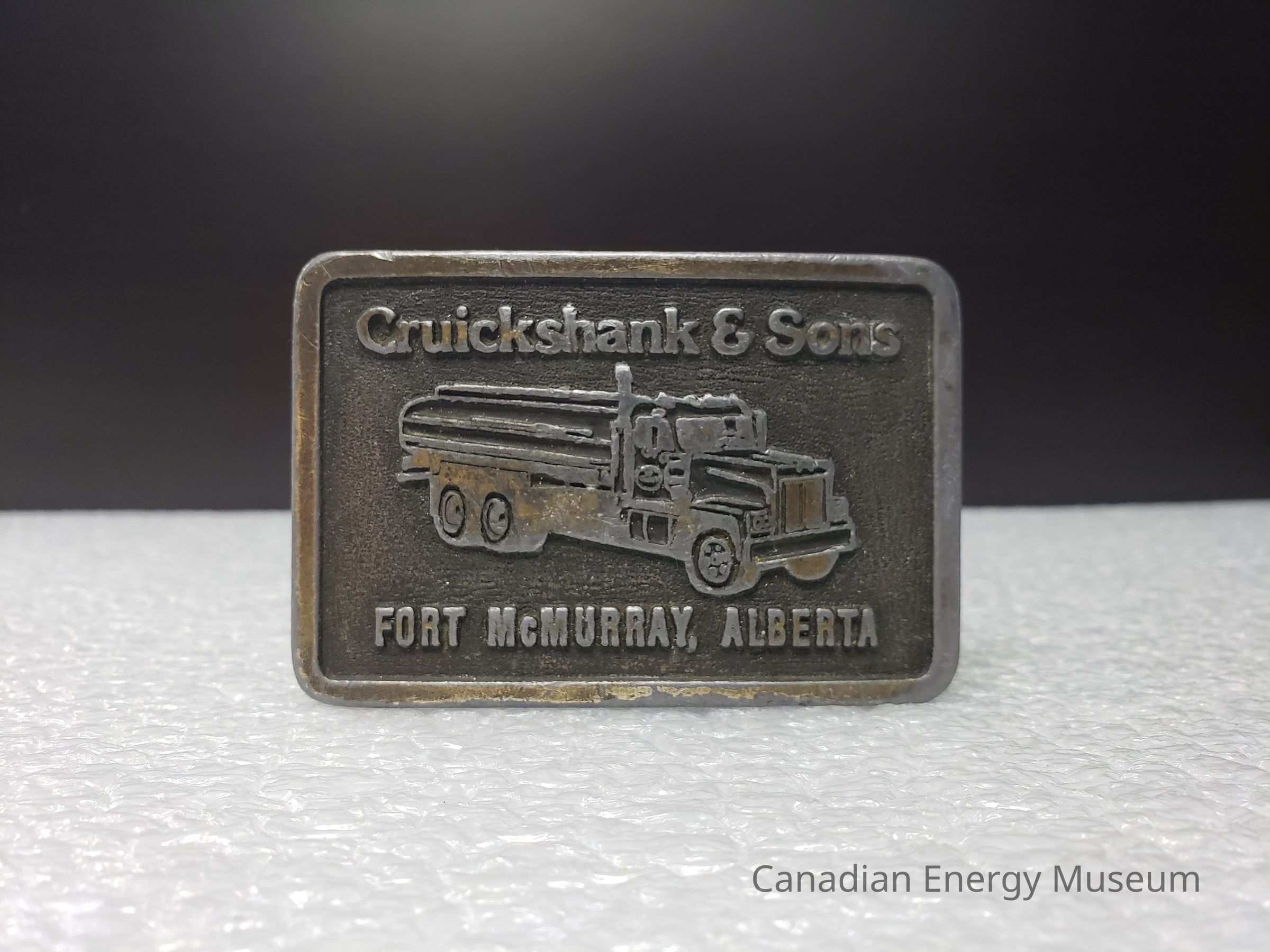 Old Description (Kelsey Dalrymple, 3 June 2020): Cruickshank & Sons. Fort McMurrary, Alberta. Rectangular brass belt buckle with truck on face.Collection