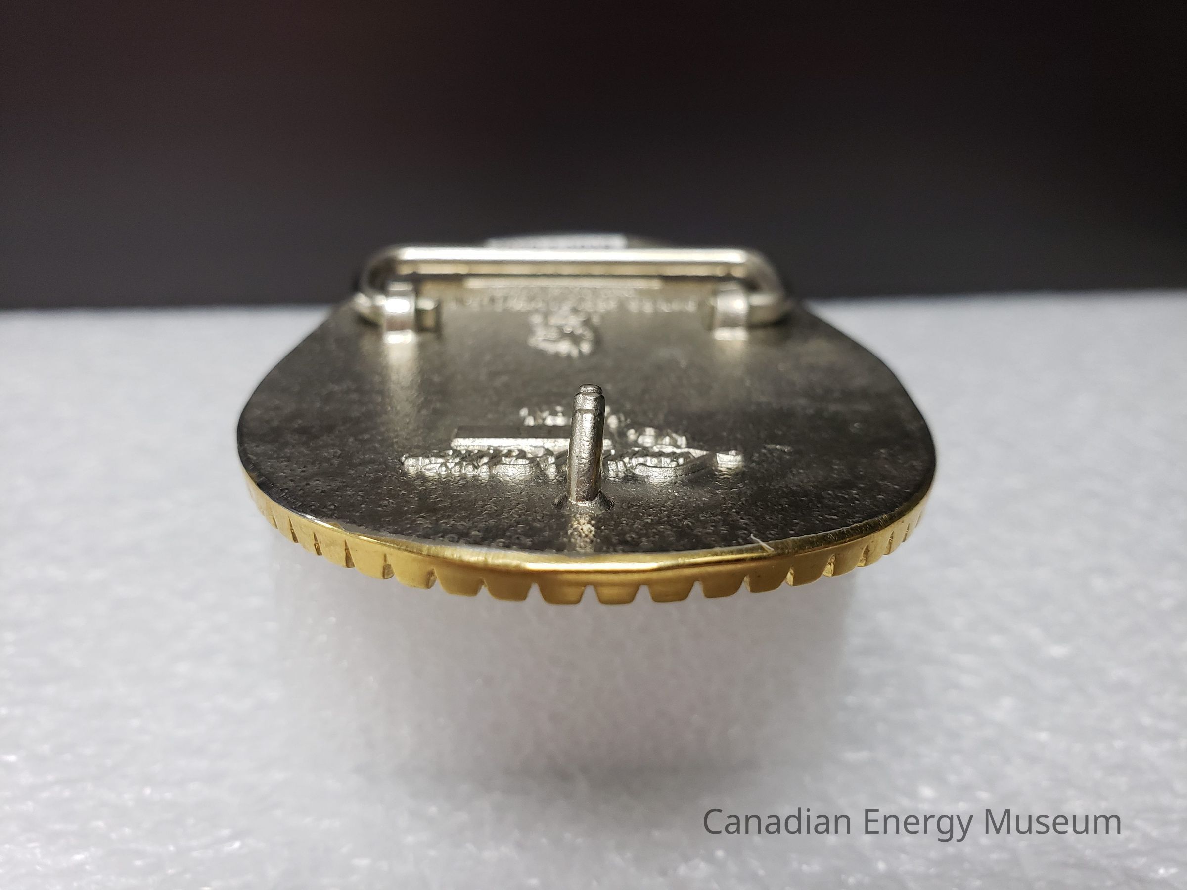 Old Description (Kelsey Dalrymple, 23 July 2020): Totco. Silver and gold oval brass belt buckle with rig and offshore rig on face. Limited edition number 663. 24 karat gold plated. (Donated by Diane Naismith)Collection