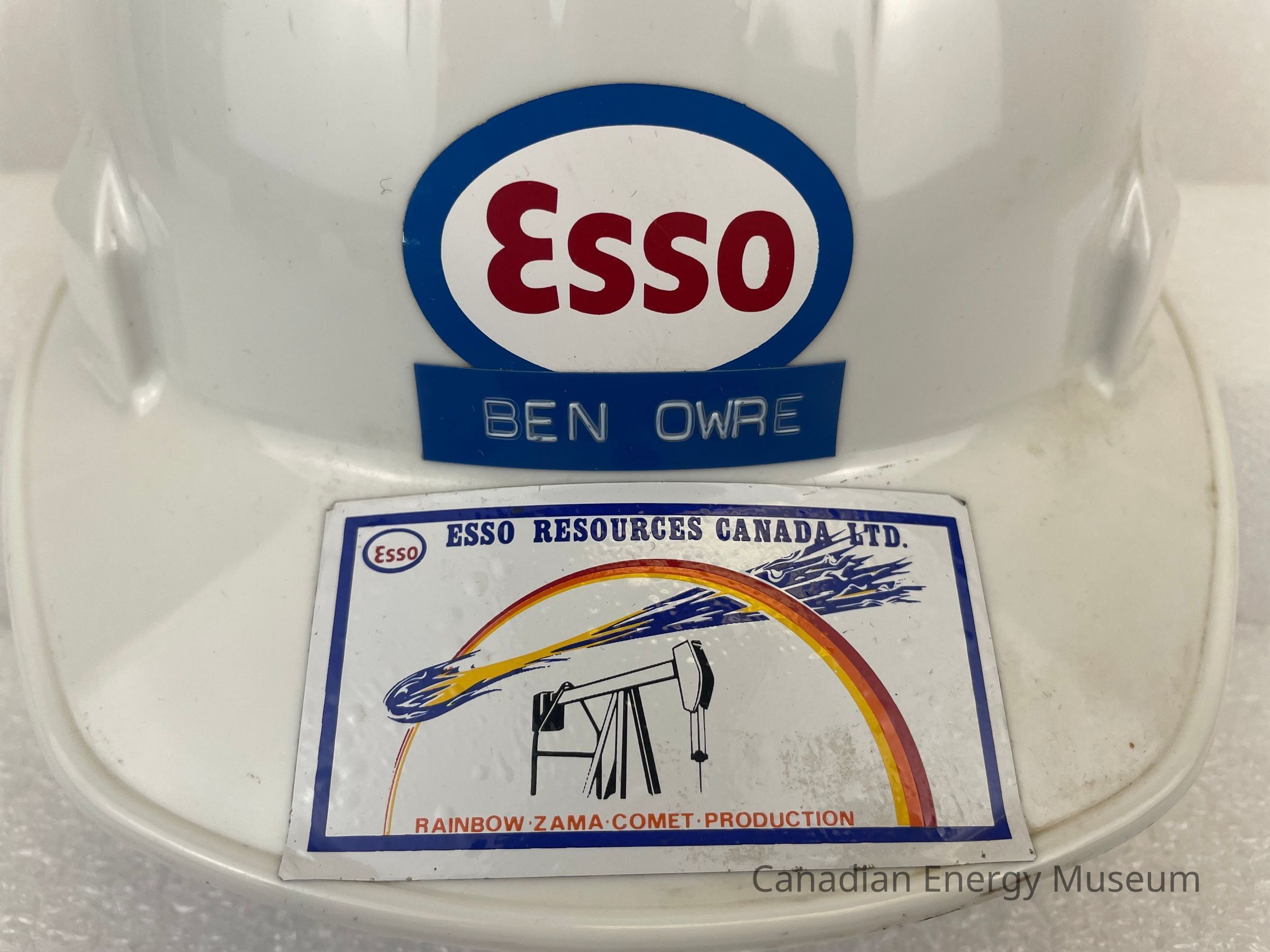 The front of the hat displays three stickers. The top sticker displays a tattered sticker branded to Esso. Beneath it, somewhat layered over the Esso sticker, is a blue label with white embossed text reading, "BEN OWRE". The last sticker is placed on the brim of the hat. It is a large rectangular sticker branded to Esso, with a white background. A dark blue outline of a rectangle borders the sticker, and features a large image of a comet soaring over a pump jack and a red, orange and yellow rainbow arching over the scene. Blue text at the top reads, "ESSO RESOURCES CANADA LTD." Red text at the bottom reads, "RAINBOW . ZAMA . COMET . PRODUCTION".