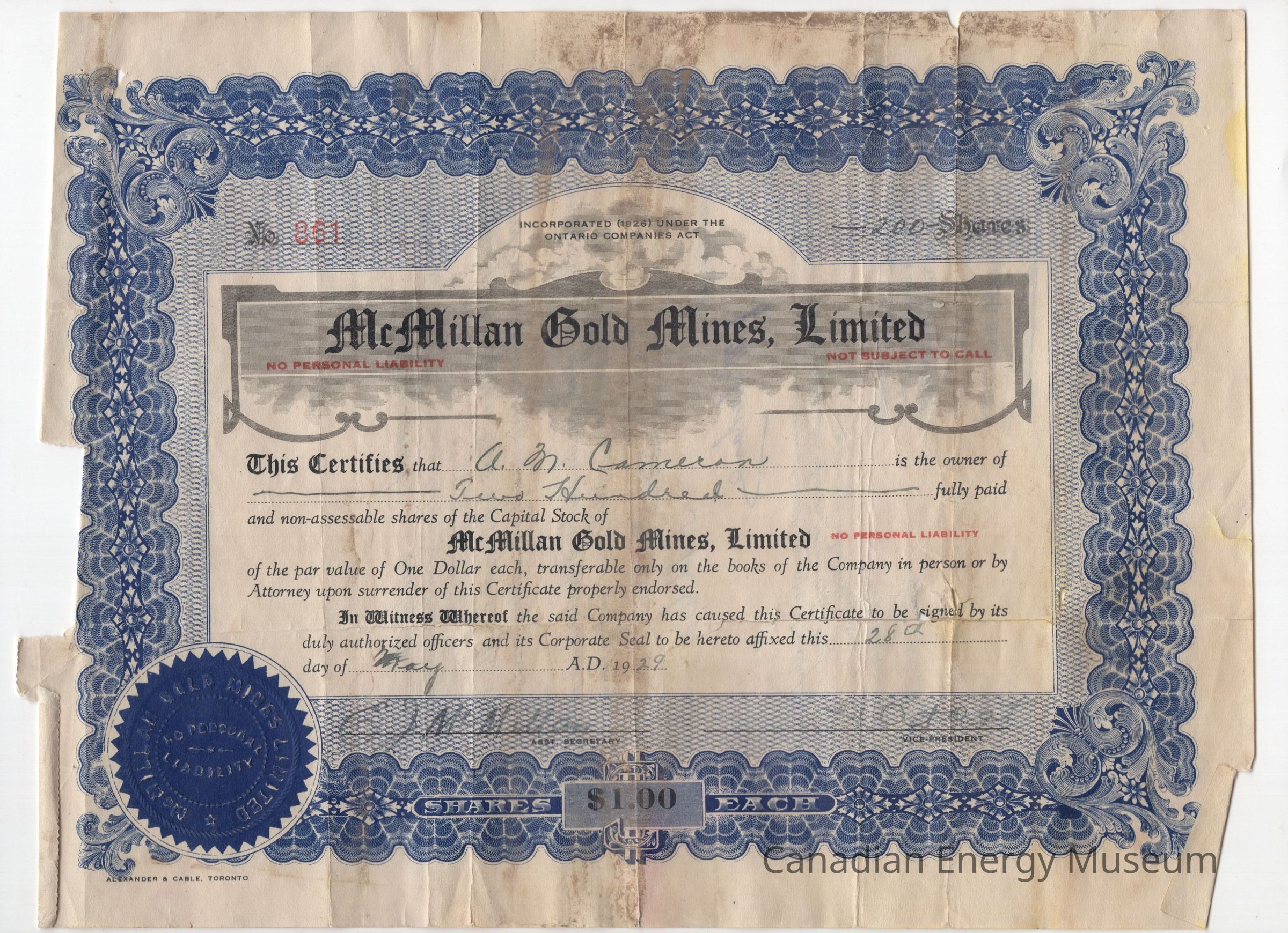 [Share Certificate] McMillan Gold Mines Limited, 200 Shares, 28 May, 1929Entry/Object ID