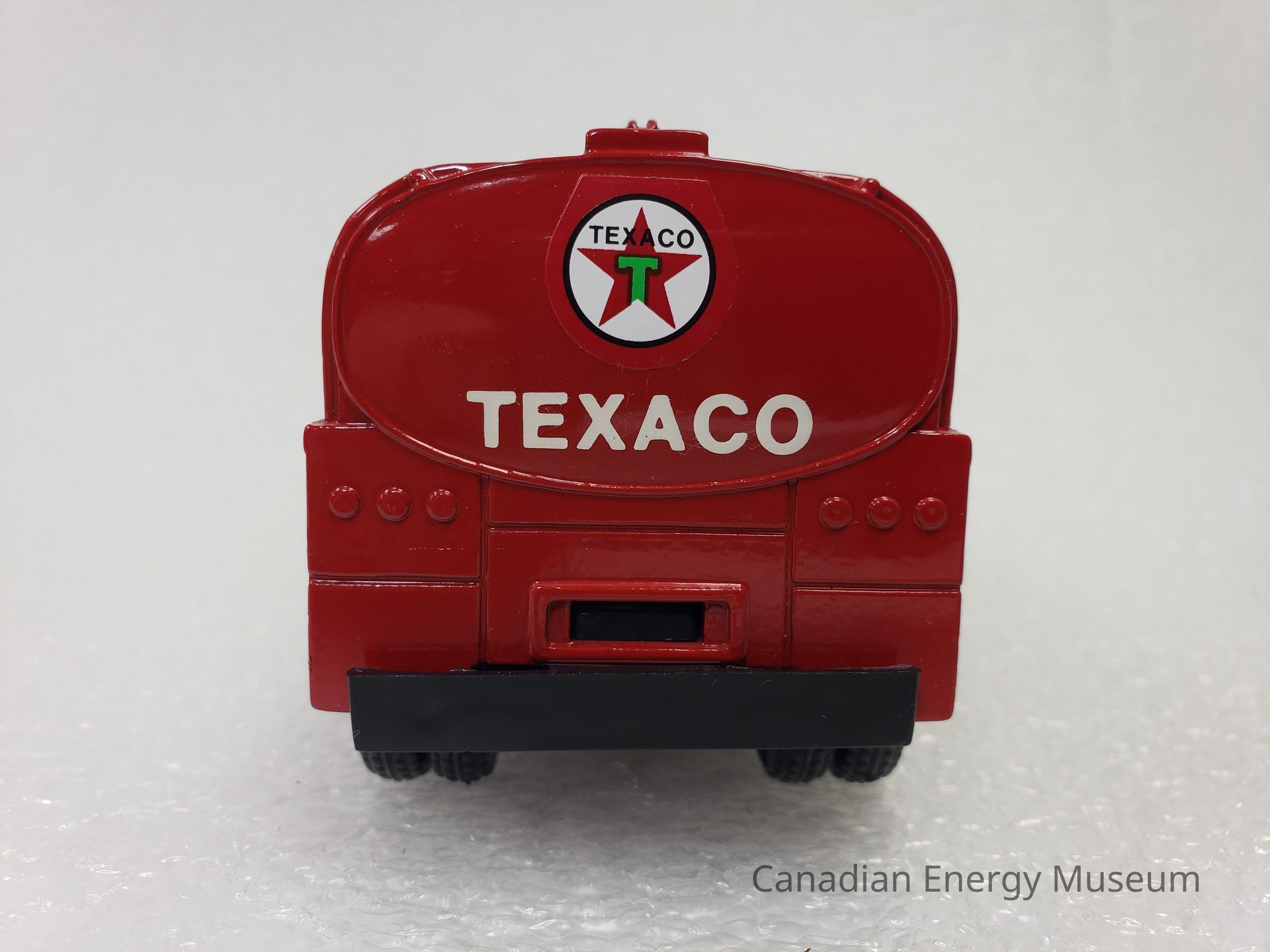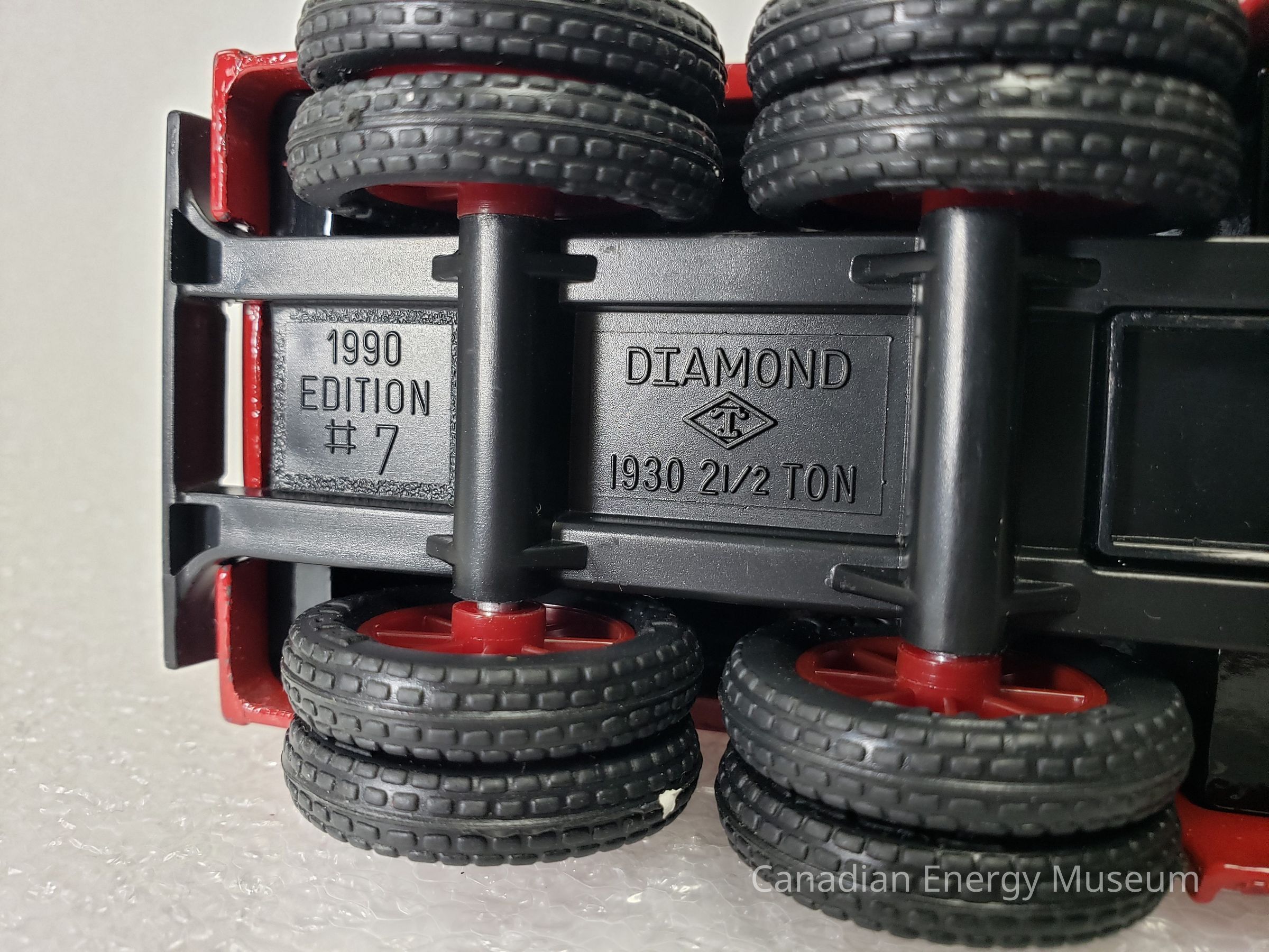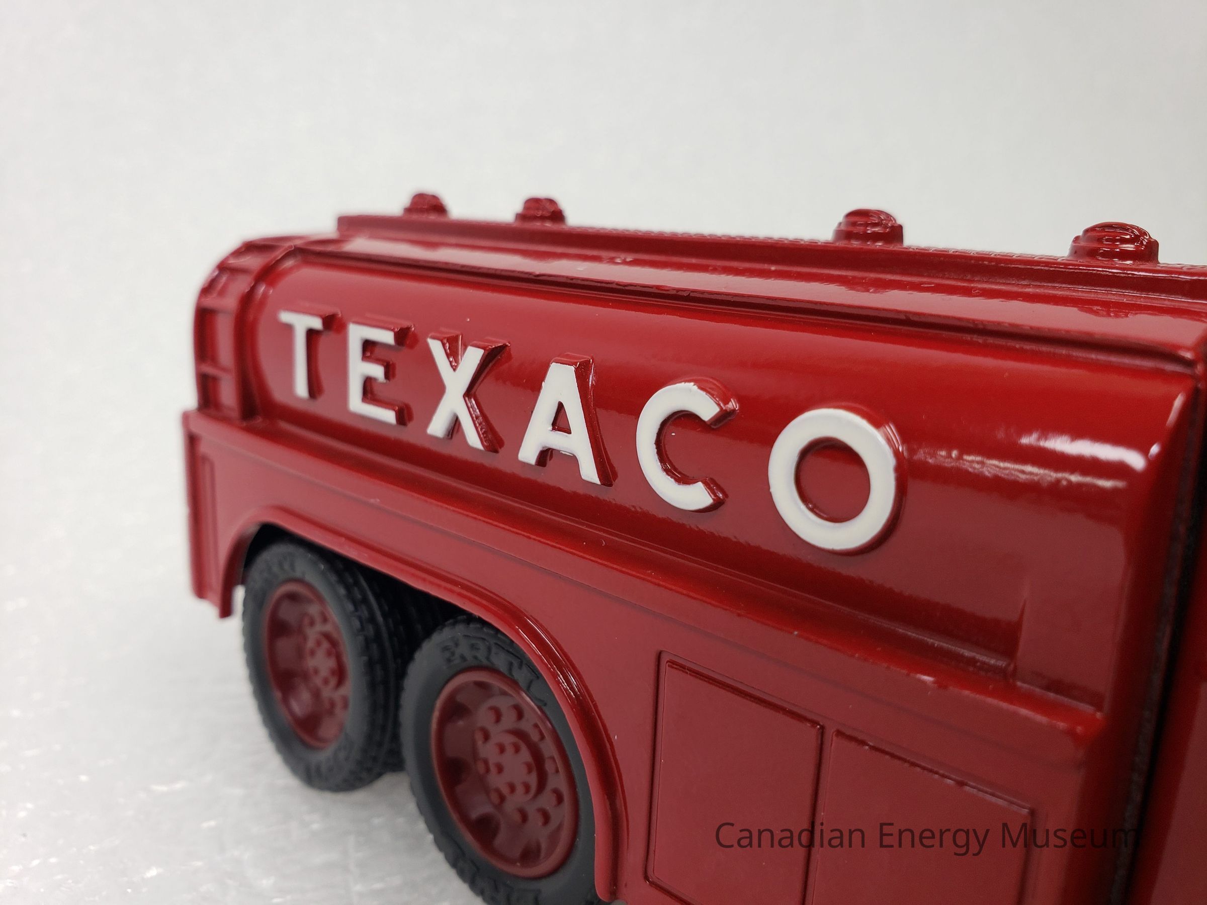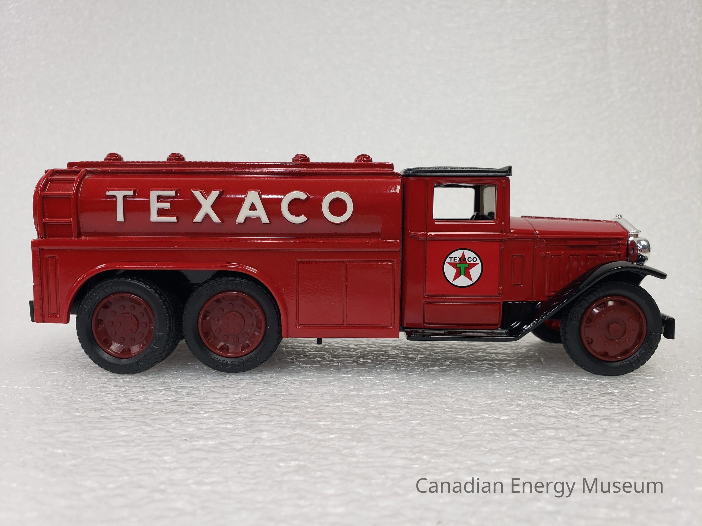 This particular model is a replica of a 1930 Diamond T Fuel Tanker (produced by Diamond Reo Trucks), which is one of the vehicles used by Texaco Jobbers (the middleman between the company that refines the petroleum products and buyers and retailers) and other distributors when delivering products in the 1930s. It is also the model of fuel tanker that was used to transport the first oil produced by Leduc #1.