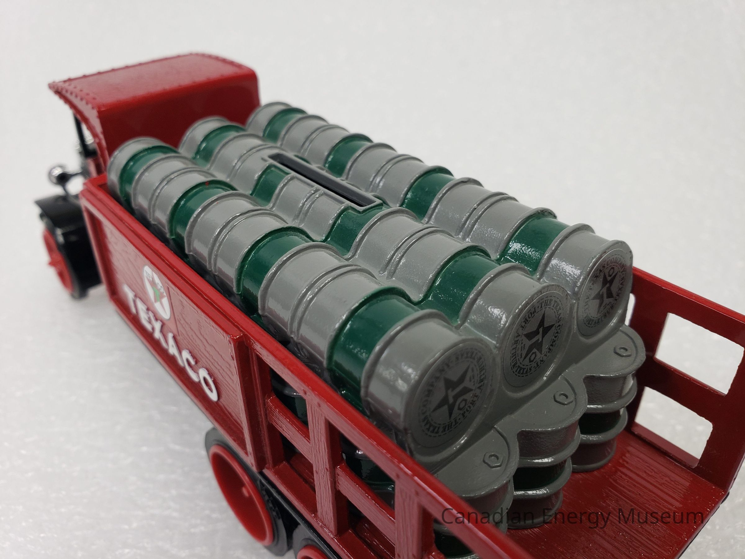Old Description (Kelsey Dalrymple, 2/18/2020): Still bank in the shape of a replica 1925 Kenworth stake truck and trailer. Truck is red and black, with a red mock-wood bed. Grey and green barrels in back of truck have slot in top for coins. Truck is labeled Texaco with the Texaco logo on the bed andCollection
