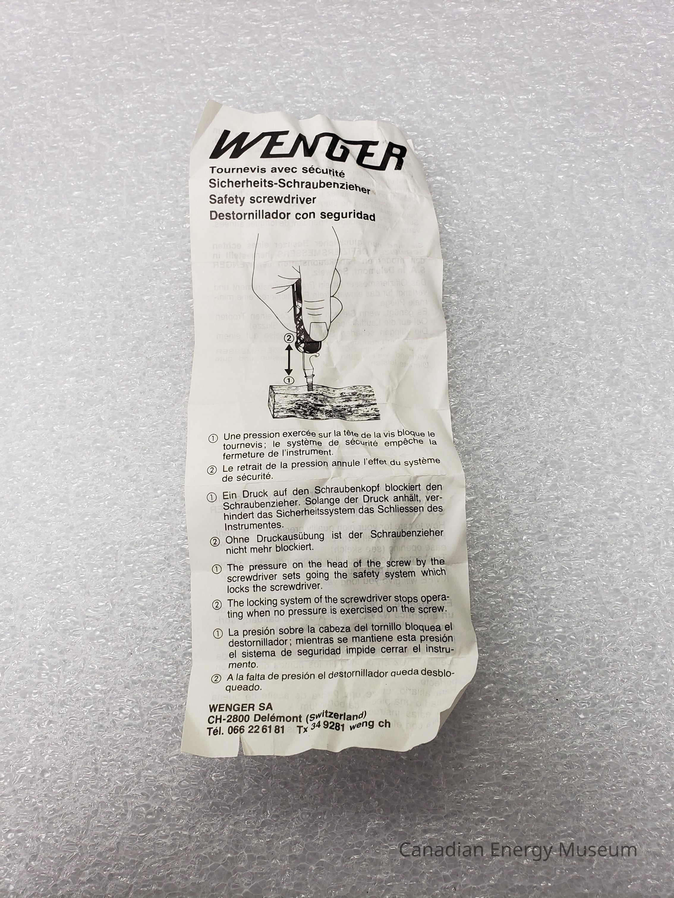 Packaging Box: Card box, with white and red print. Red body with white text predominantly. Front: "The genuine WENGER SWISS ARMY KNIFE; Fully guaranteed". Side A: "Das echte Schweizer Offiziermesser; WENGER; Volle Garantie". Side B: "Le véritable COUTEAU SUISSE; WENGER; Garantie totale". Back: Flat color illustration of the pocket knife cover with logo, and a yellow sticker identifying it as a 'Safety Screwdriver'. Top Flap: "Wenger SA Delémont Switzerland". Bottom Flap: Yellow sticker with typewritten numbers "1 08 11" covering the same print as the top flap.Collection