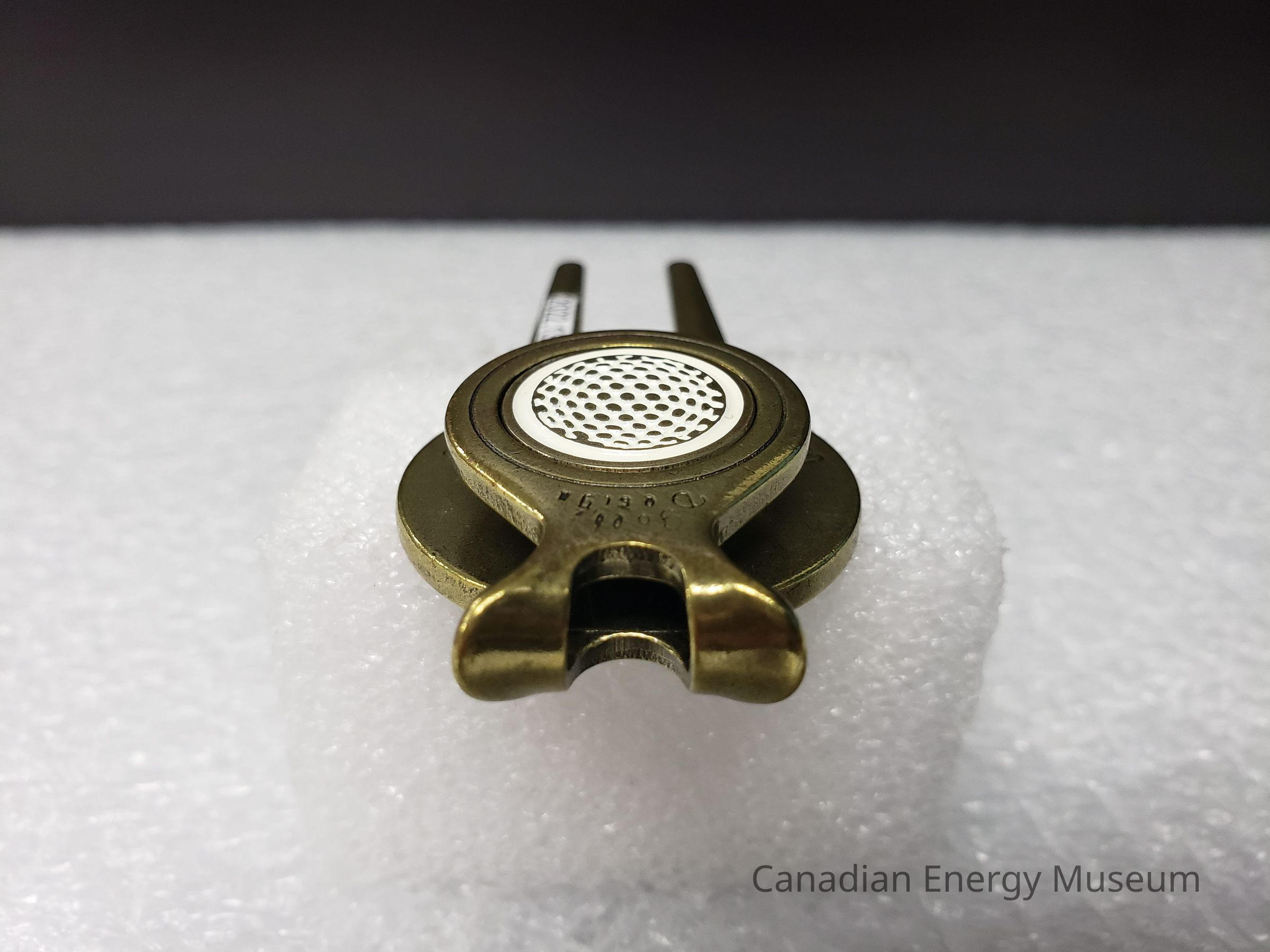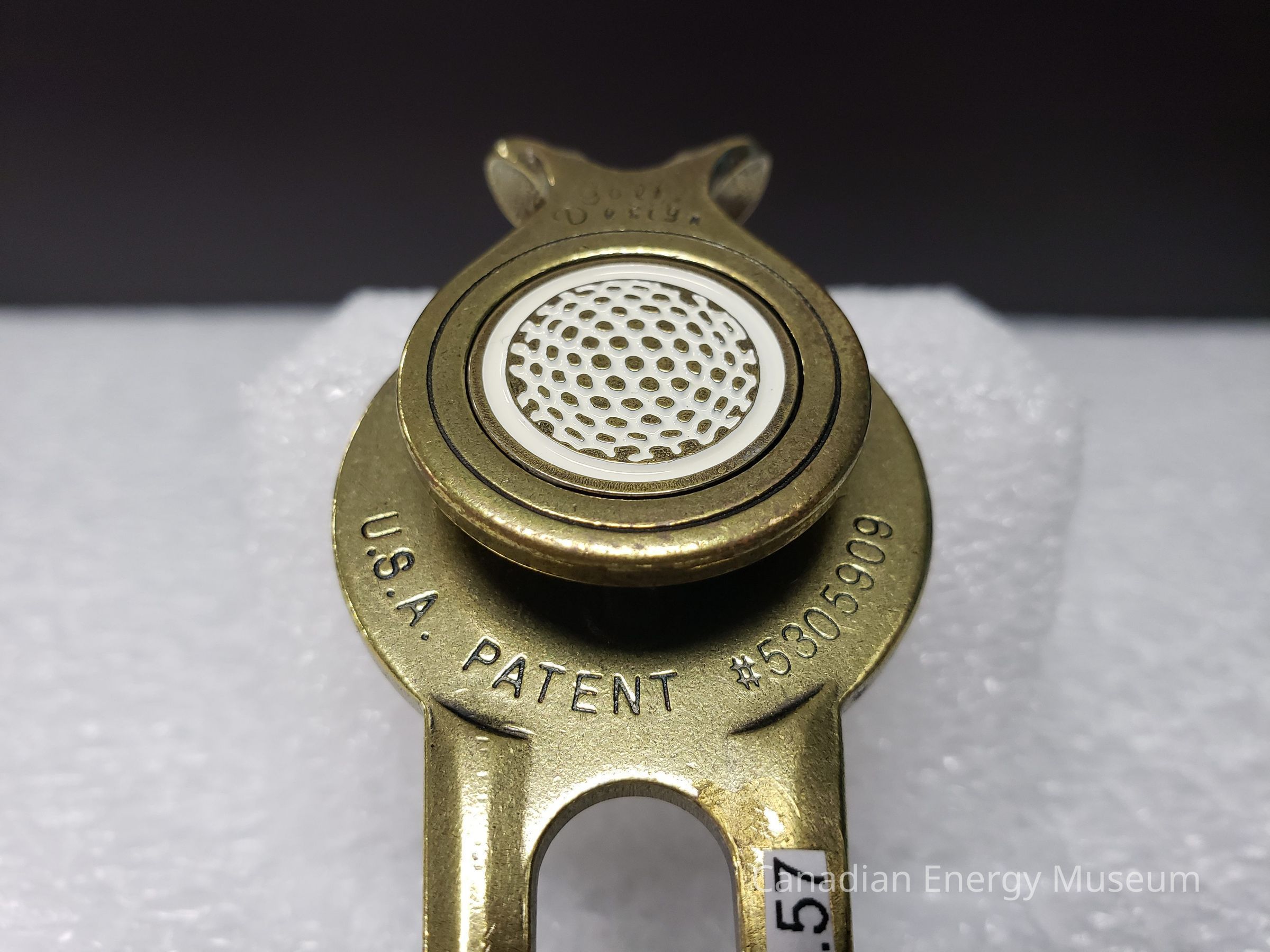 The tool has a hooked piece of metal at the top that curves behind to a smaller circle forming a belt clip. making the rest of the belt clip a smaller circle of metal. An above the circle says " " and has a white enamel golf ball with the cast metal making the golf ball details. One the back of the clip it has "U.S. PATENT #5305909" engravedCollection