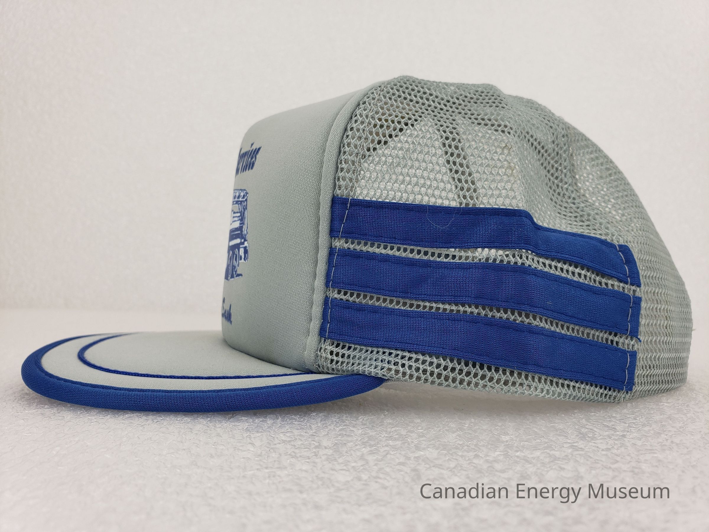Design: The cap features a printed design on the front (crown), as well a double piping on the brim and three horizontal bands of blue fabric on the body. The printed design consists of the following elements: The blue text "A.J. Flushby Services: at the centre-top; a blue and while illustration of a well service truck in the middle-centre; and the blue script text "Lashburn, Sask" at the middle-bottom.
