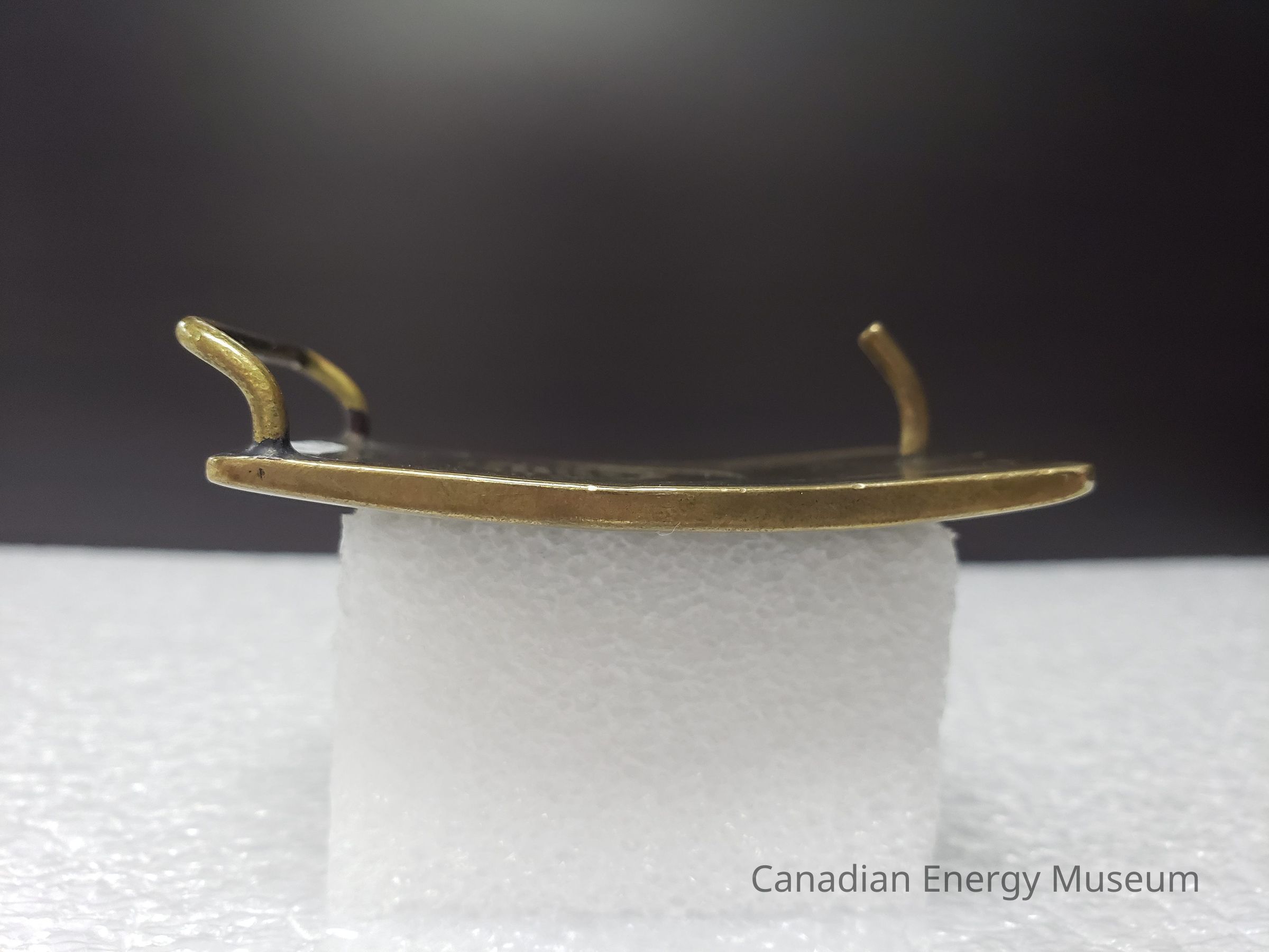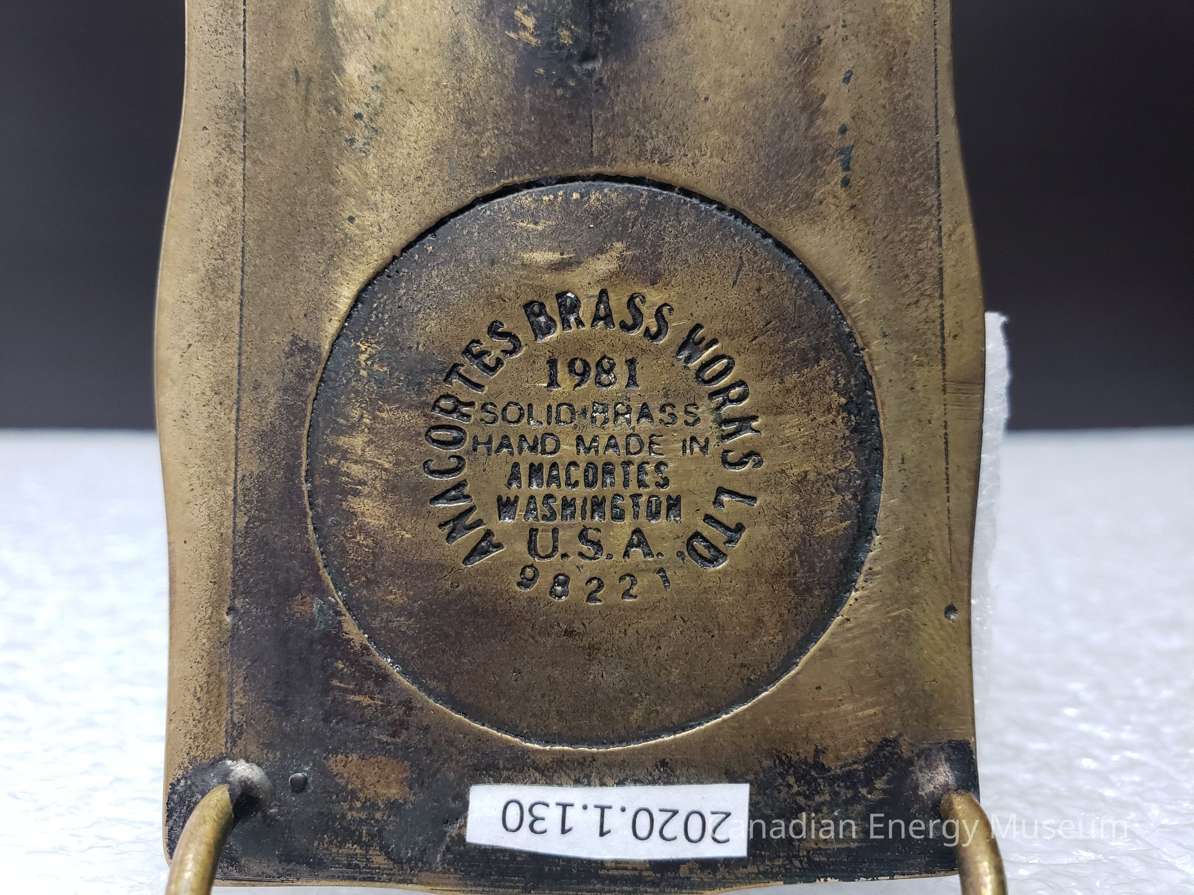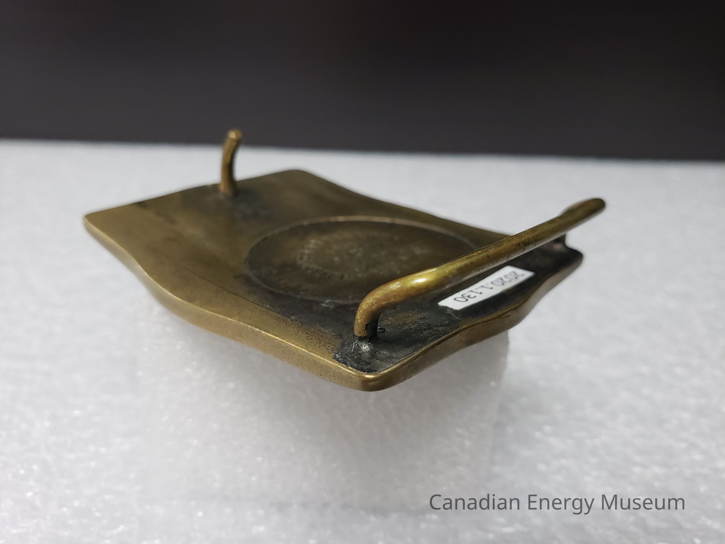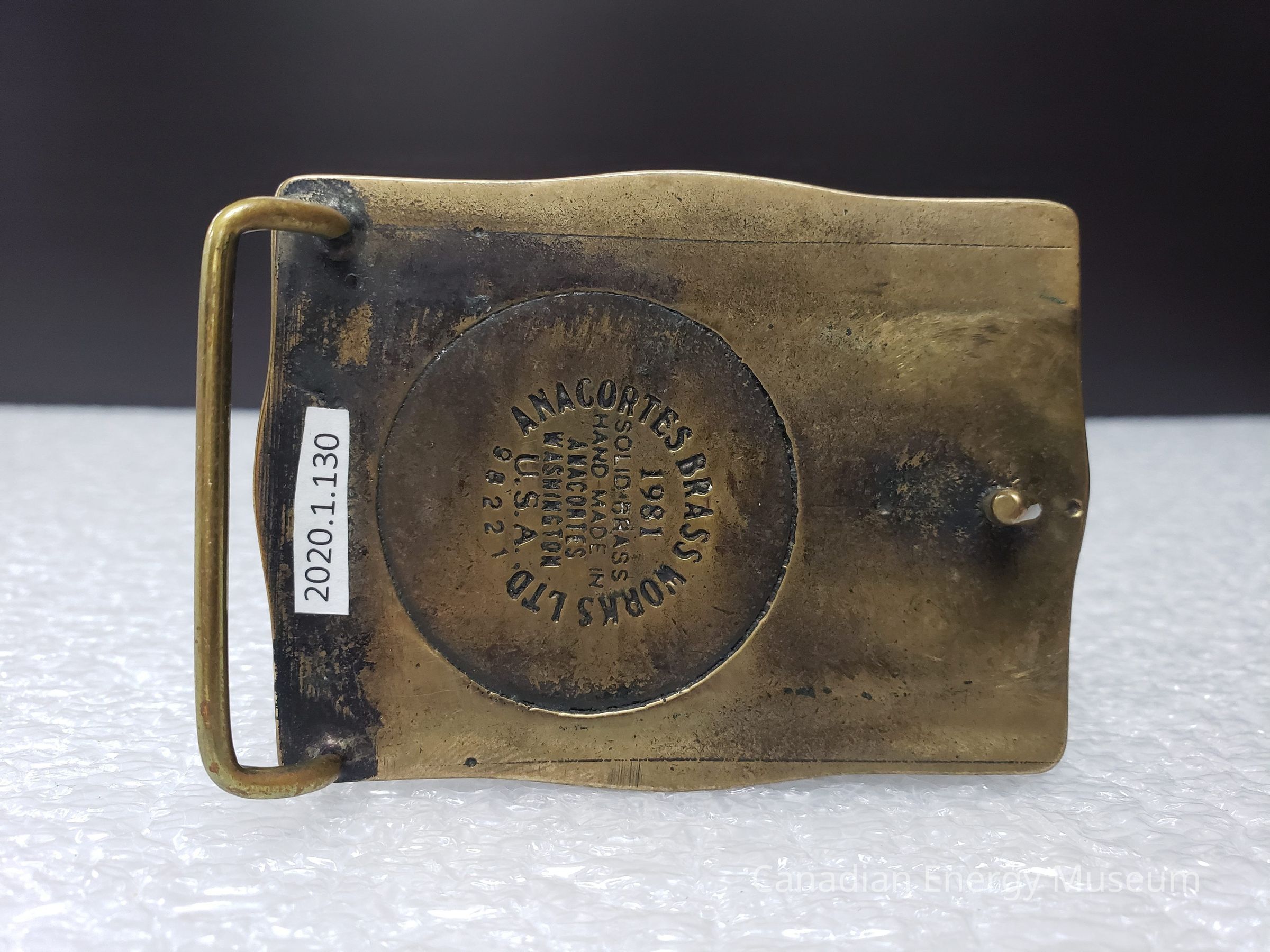 Features: An overlapped curved-rectangular and oval-shaped, cast brass belt buckle, finished in antique-bronze and bearing the imagery of oil equipment and text. The buckle is lightly curved.