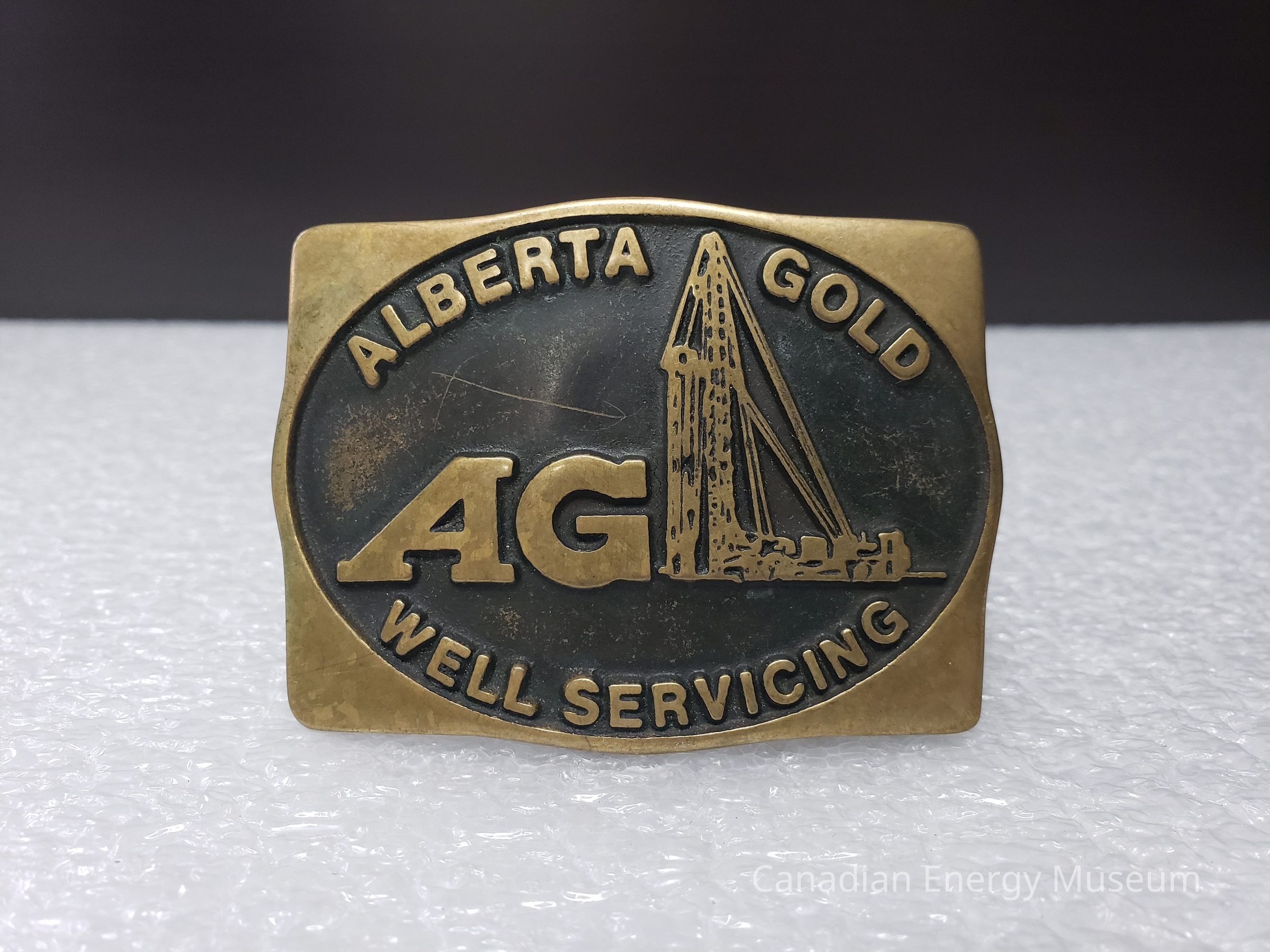 Old Description (Kelsey Dalrymple, 3 June 2020): Alberta Gold Well Servicing. Rectangular brass belt buckle with black oval in centre. Service rig beside AG in center.Collection