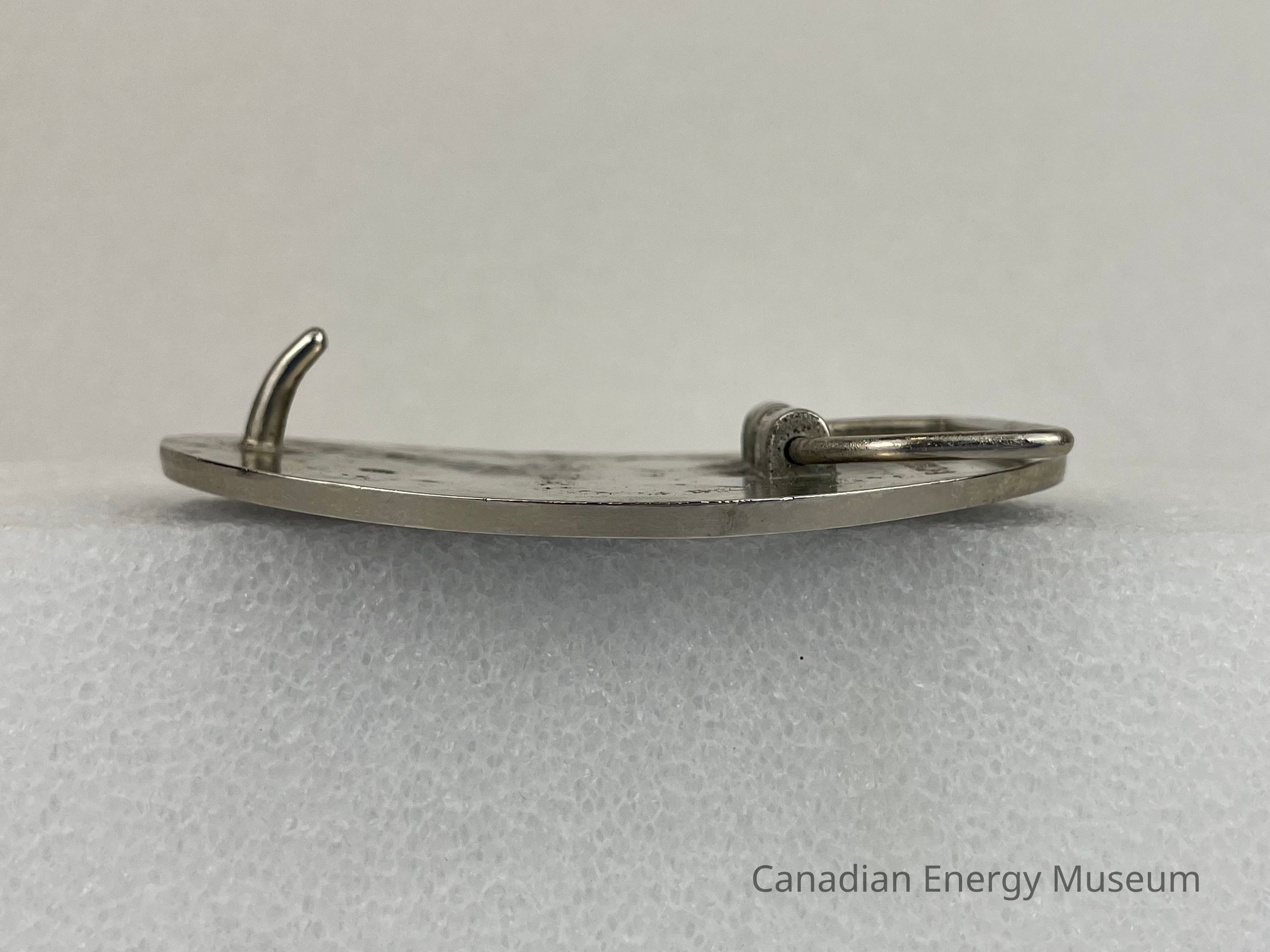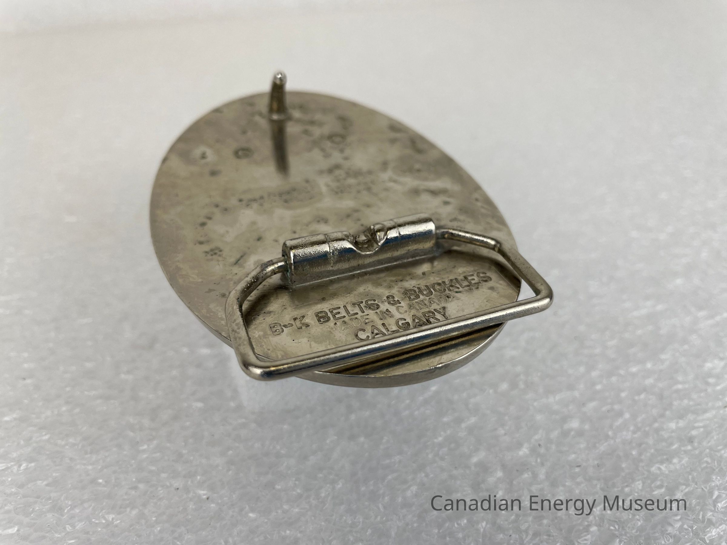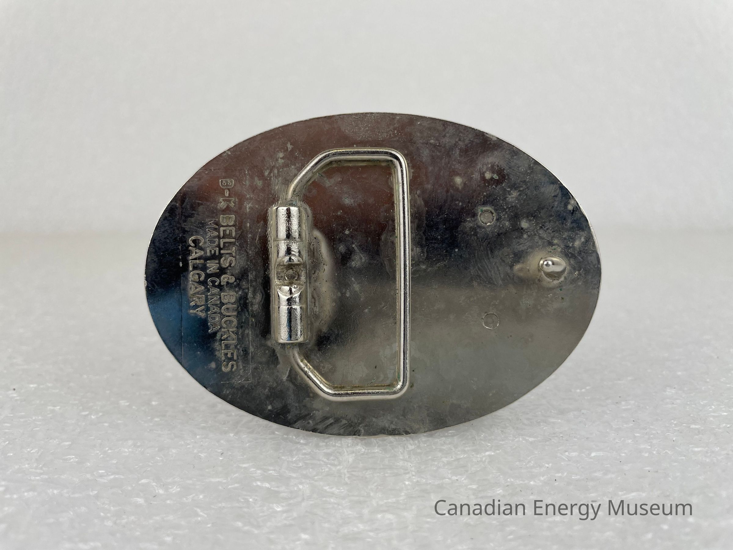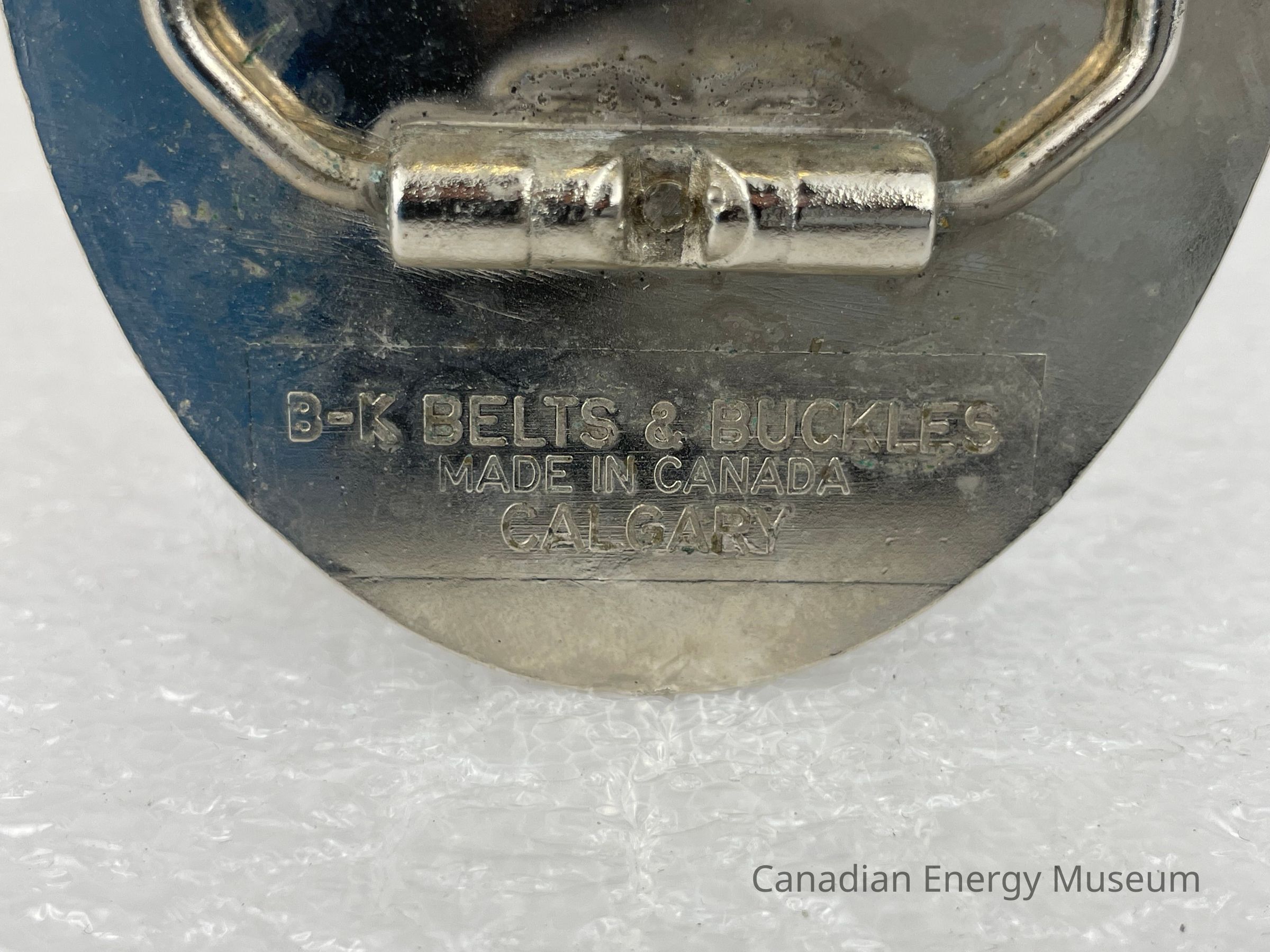 Back Elements: The back displays a smooth silver surface. The hook is a plain, thin, curved cylinder body. The hinge is a rounded trapezoid shape and is attached by two rounded cylinders. The back features a debossed text to the left of the hinge reading, "B-K BELTS & BUCKLES / MADE IN CANADA / CALGARY".Collection