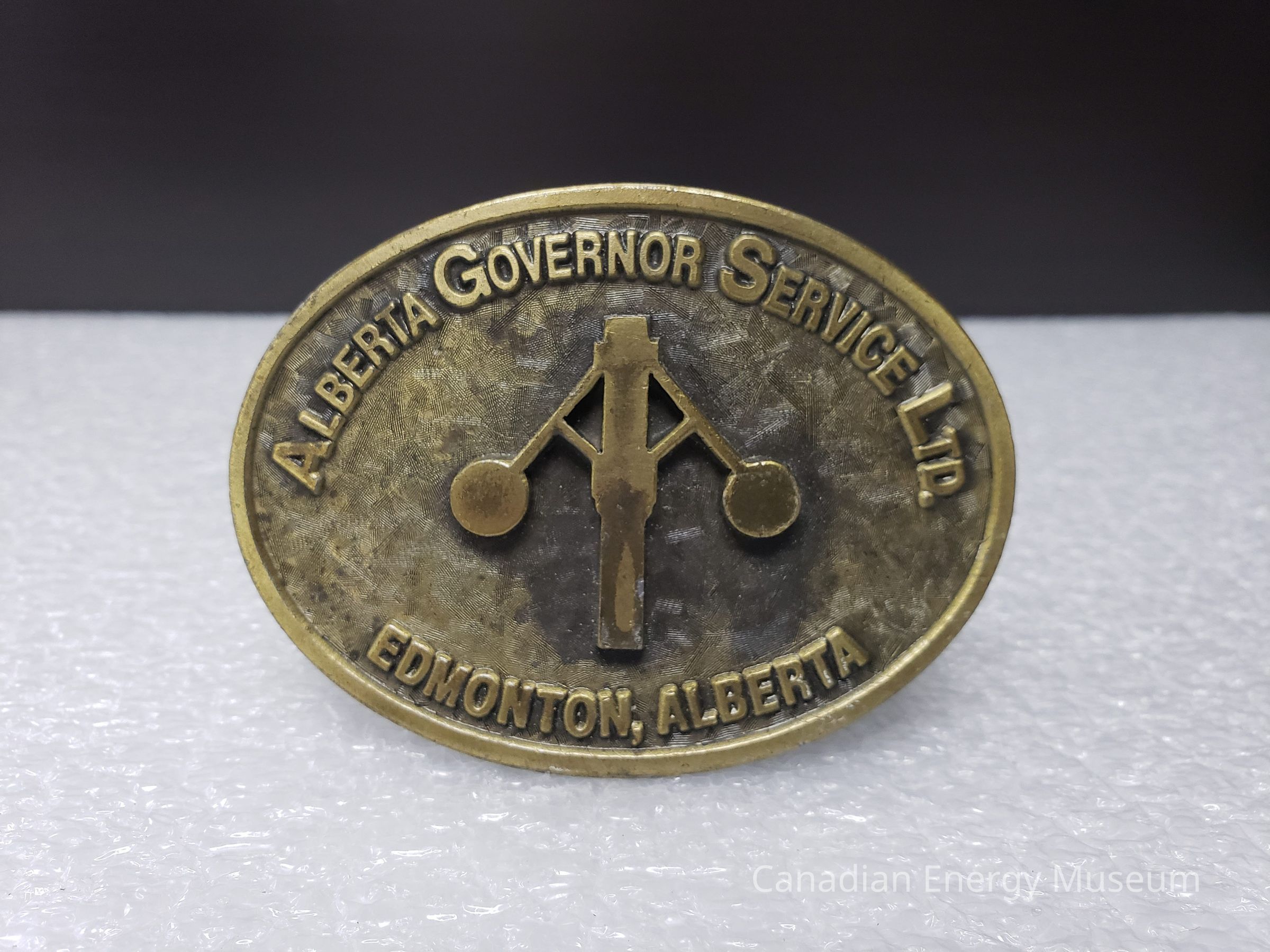 Old Description (Kelsey Dalrymple, 3 June 2020): Alberta Governor Service Ltd. Edmonton, Alberta. Oval brass belt buckle. (Donated by Gordon McQuaig.).Collection