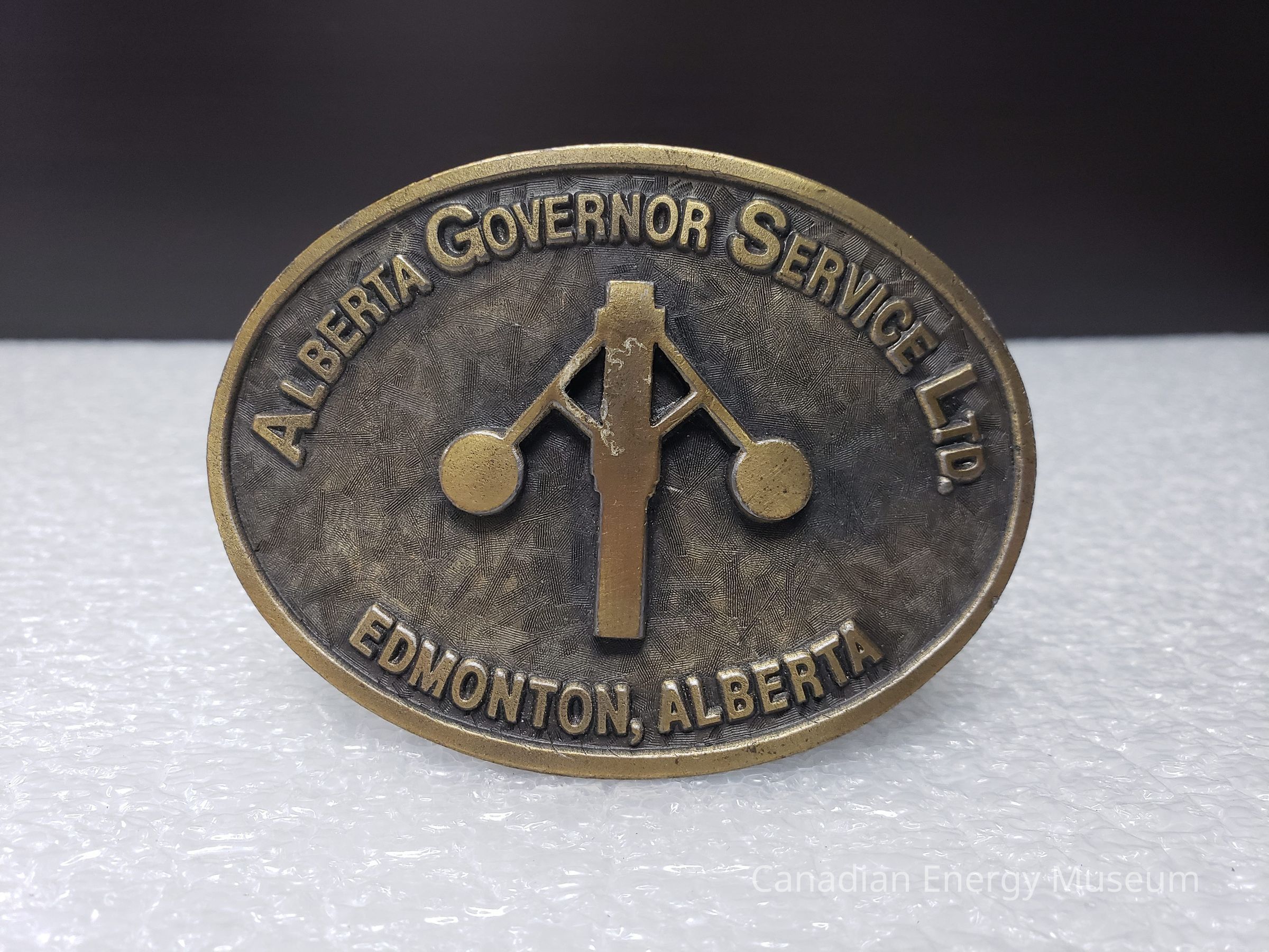 Old Description (Kelsey Dalrymple, 3 June 2020): Alberta Governor Service Ltd. Edmonton, Alberta. Brass oval belt buckle. (Donated by Jim Beamish.).Collection