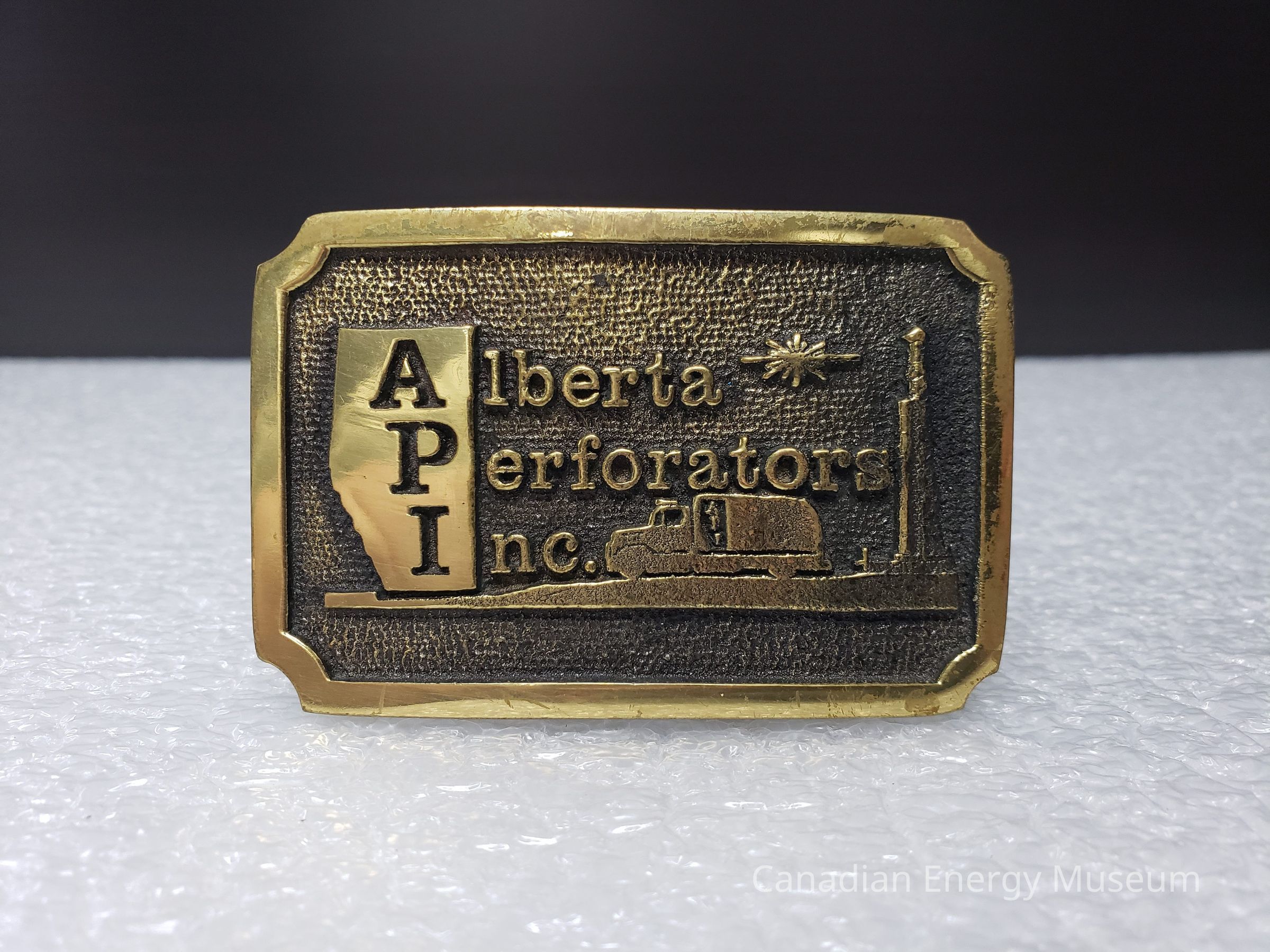 Old Description (Kelsey Dalrymple, 3 June 2020): Alberta Perforators Inc. Rectangular solid brass belt buckle. Service truck in centre.Collection