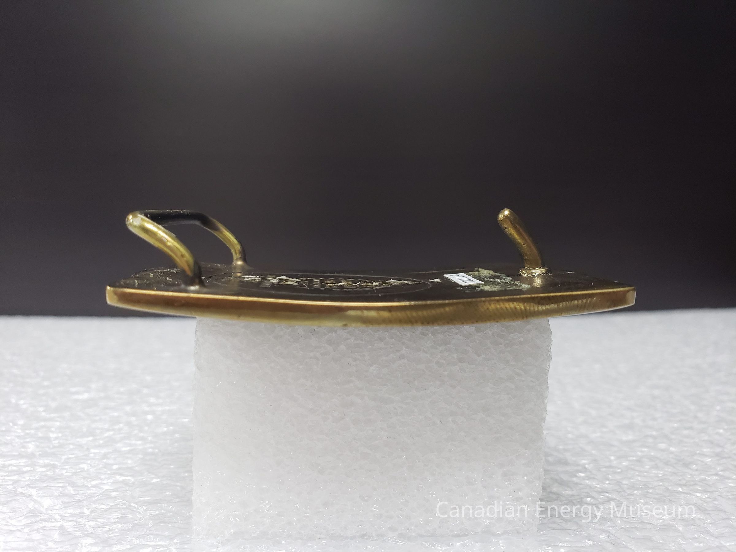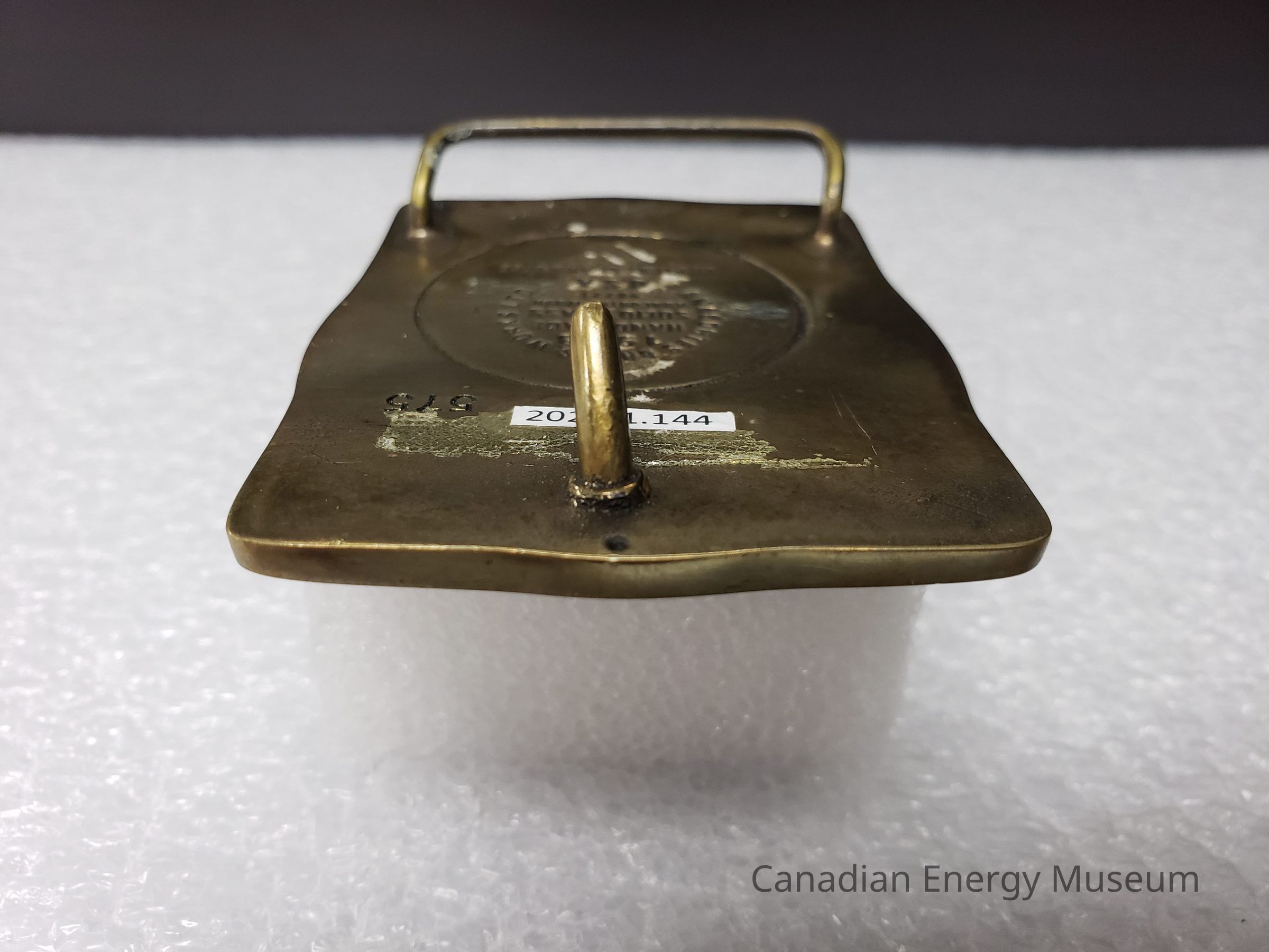 Old Description (Kelsey Dalrymple, 3 June 2020): Amoco Canada - Dome Petroleum Merger September 1988. Rectangular brass belt buckle. #575. (Donated by Jim Beamish).Collection