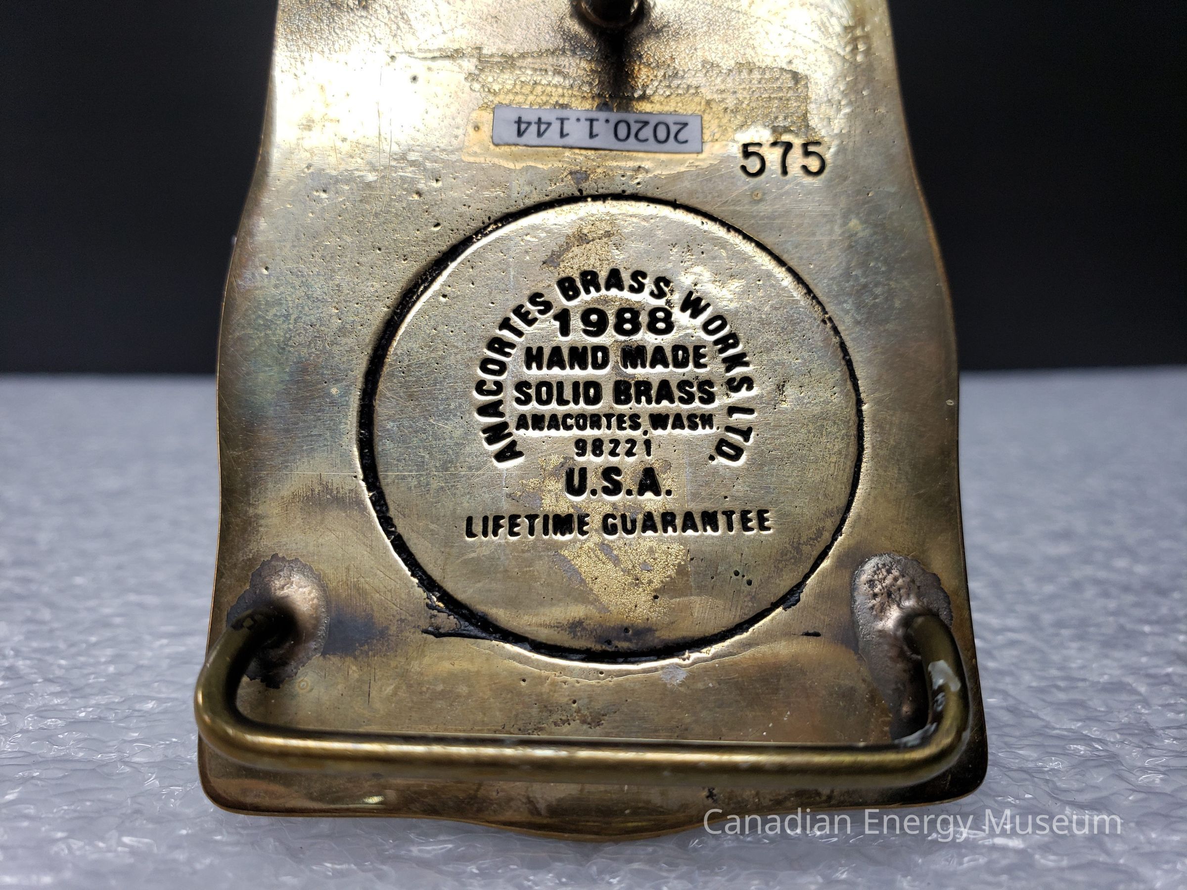 Back Elements: The back is smooth, and has a raised, stationary hinge that meets at two points (top and bottom), and a curved hook. Between is a debossed ring with the following text inside "ANACORTES BRASS WORKS LTD. (in a circle around other text); 1988; HAND MADE; SOLID BRASS; ANACORTES, WASH; 98221; U.S.A.; LIFETIME GUARANTEE". In the upper-right of the back is also engraved "575".