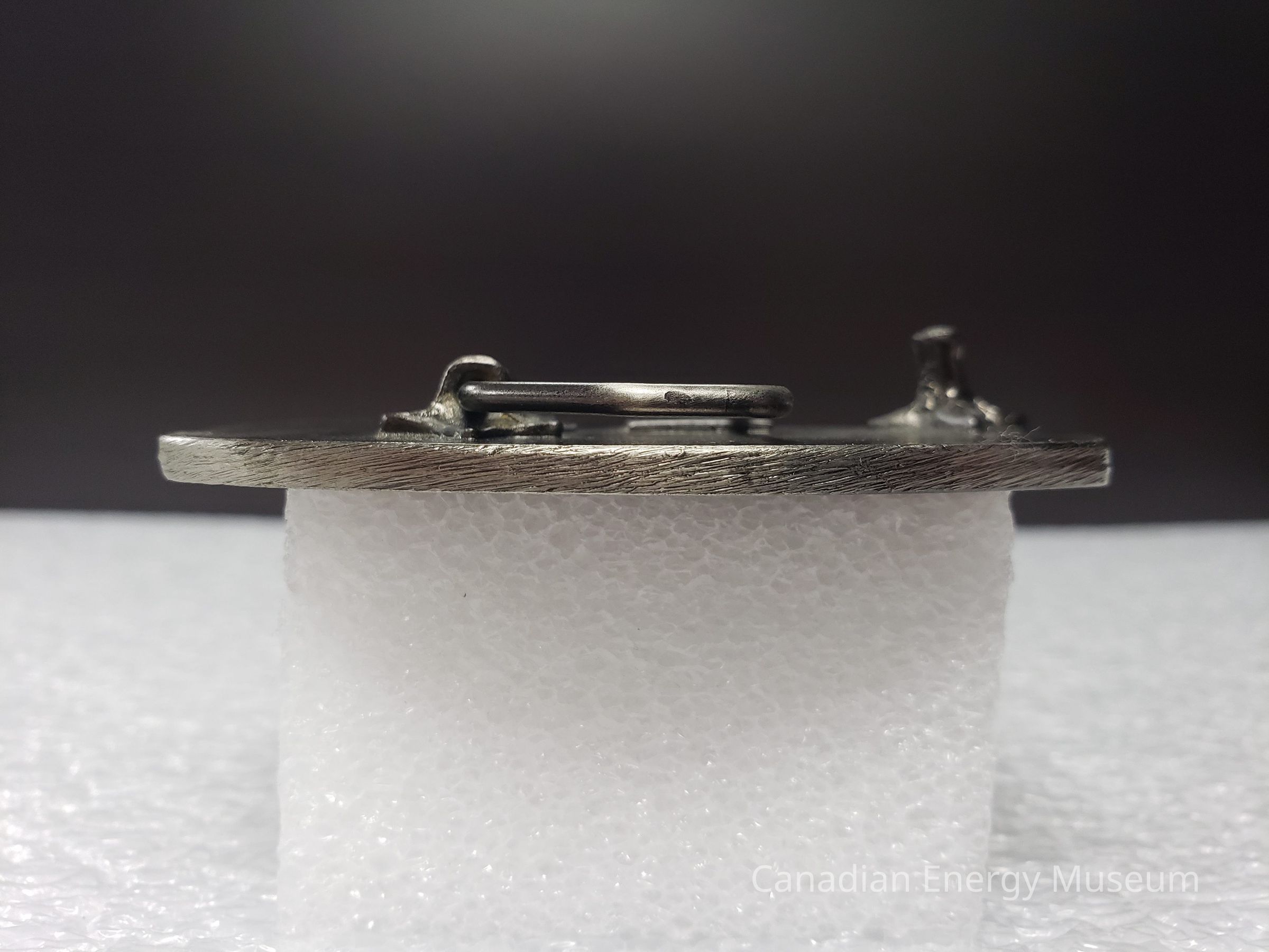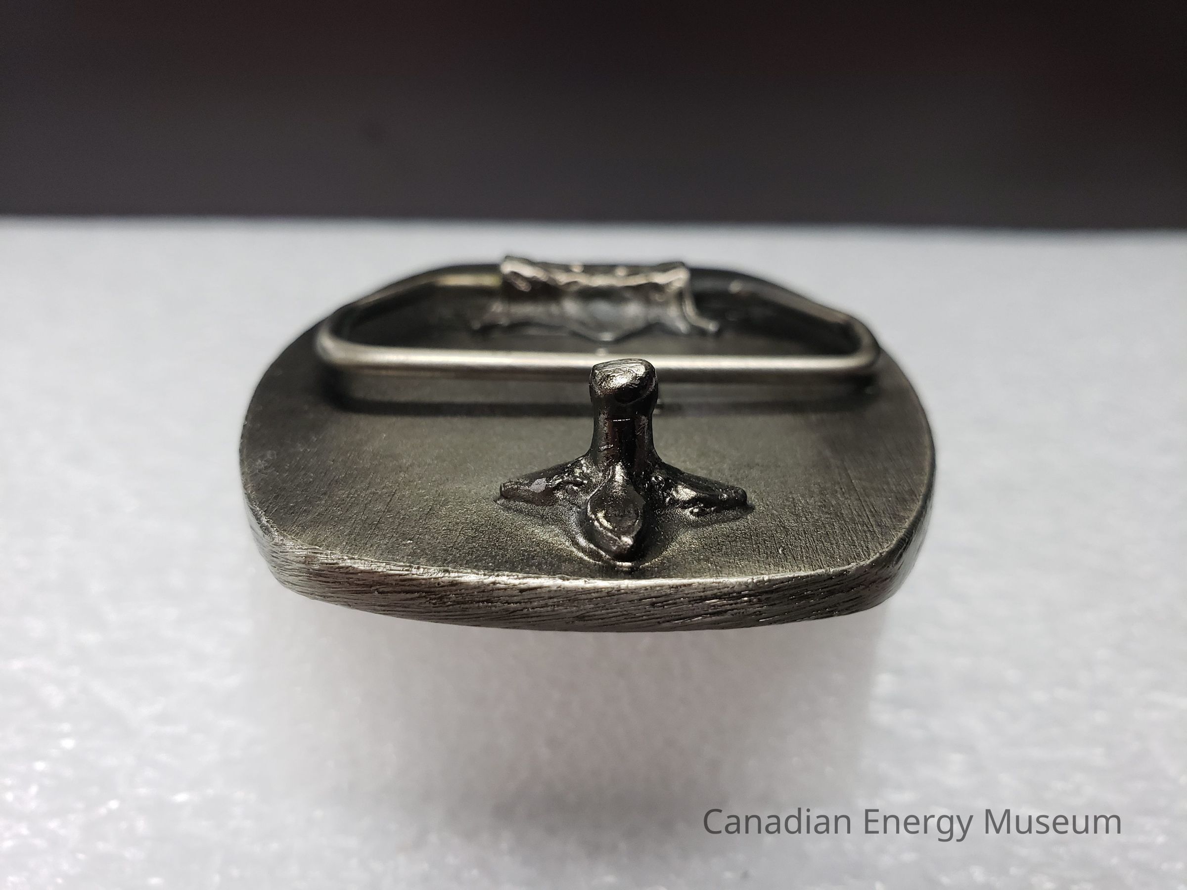 Back Elements: The back has a hinge and hook. The hinge is a trapezoidal shape, with a base decorated with ornamental plant designs, positioned to the left. In the centre is a small raised rectangle with the debossed text "MADE IN CANADA" with a stylized "AT" above (maker unknown). On the right is the hook with the same plant design base.Collection
