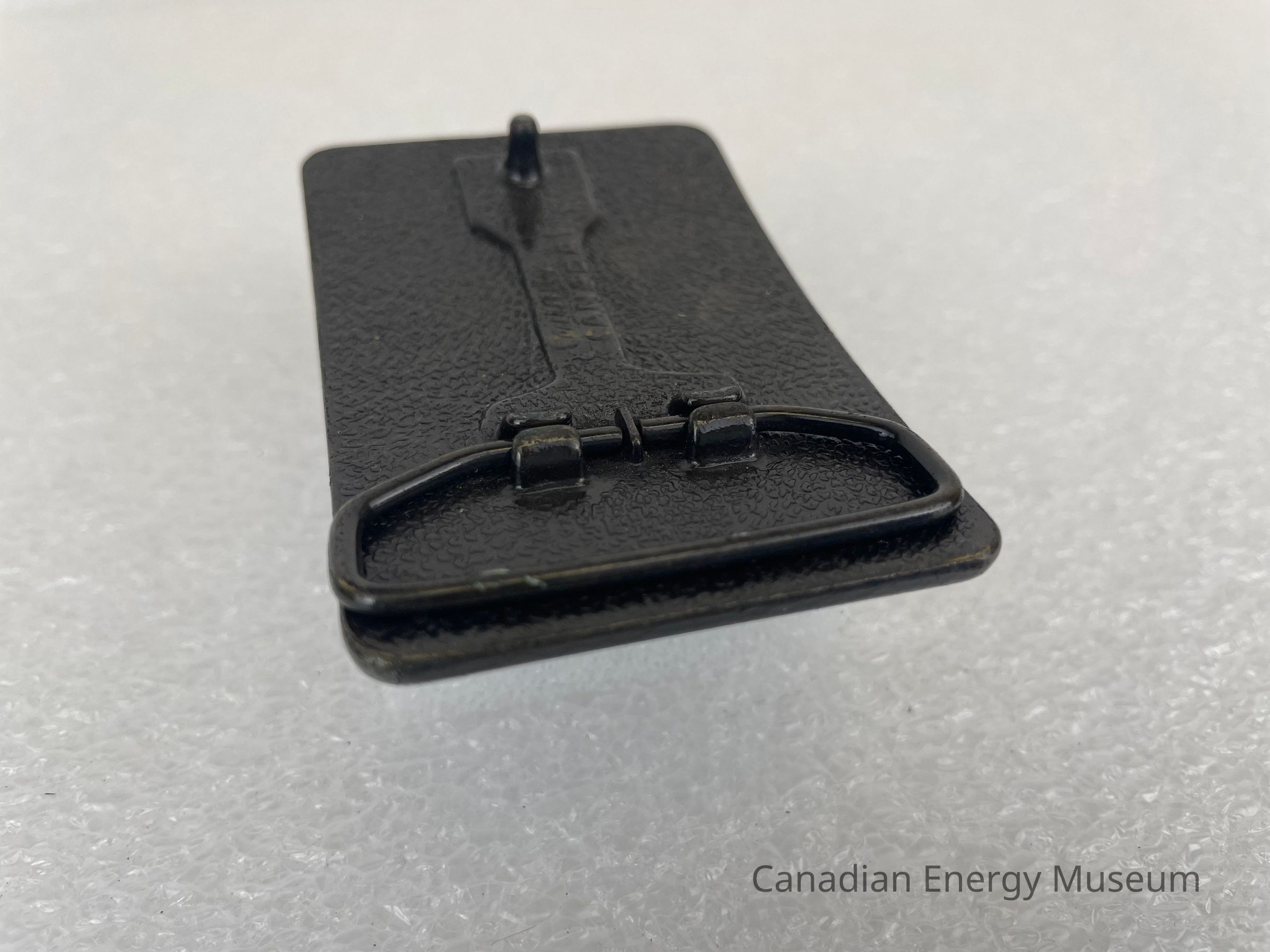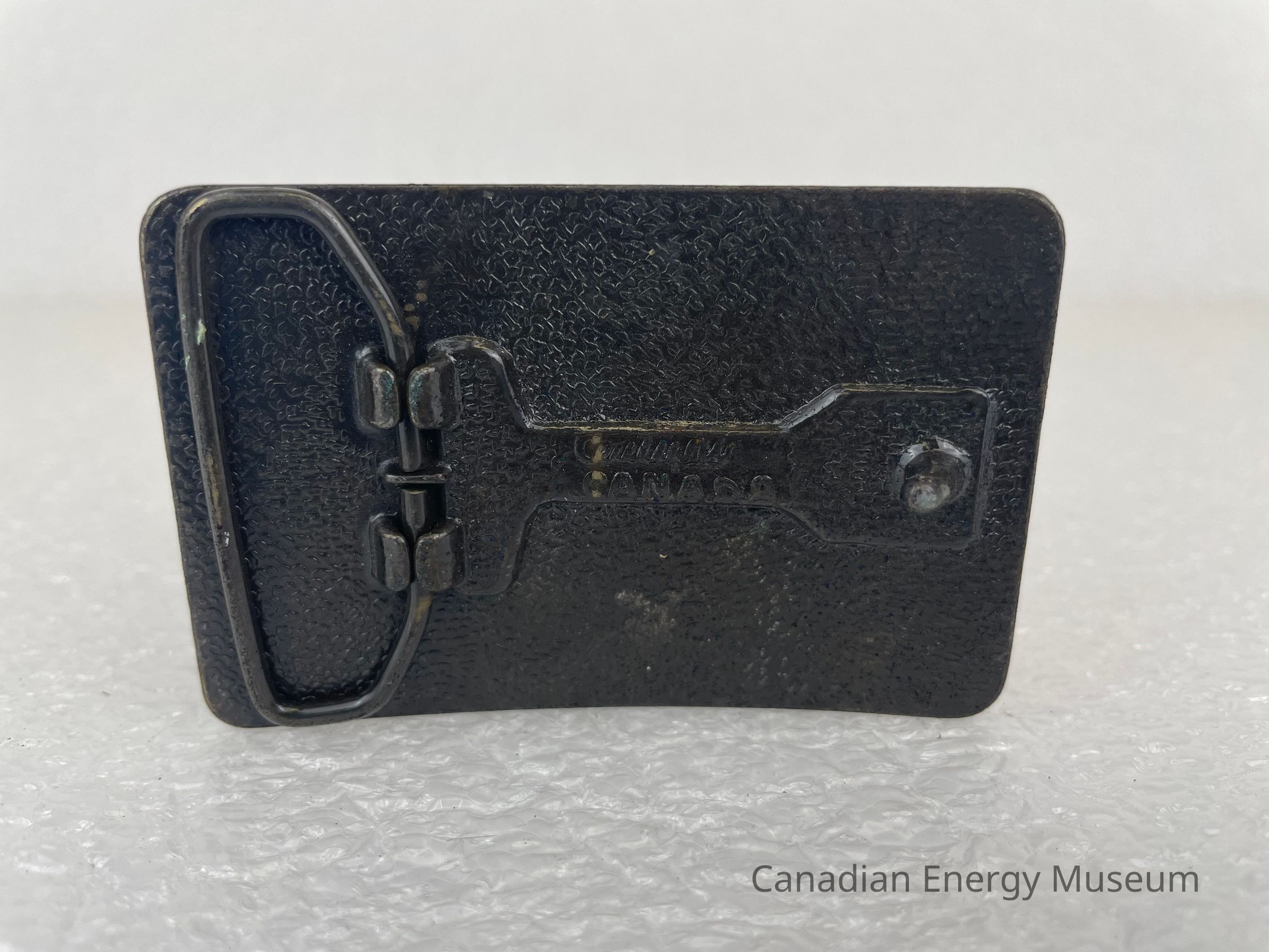 Features: A rectangular, cast metal belt buckle, finished in antique bronze. The buckle is curved, not flat.