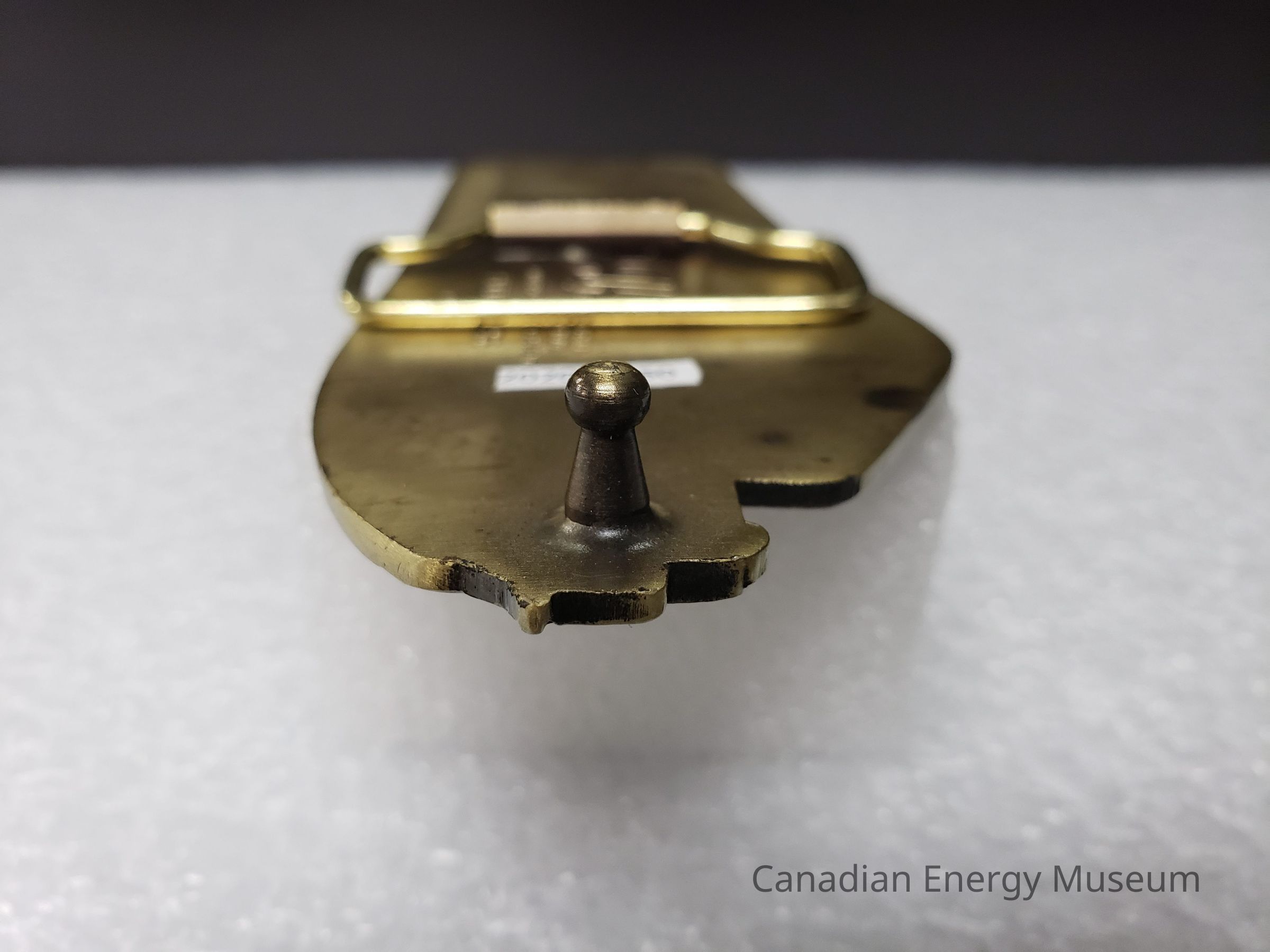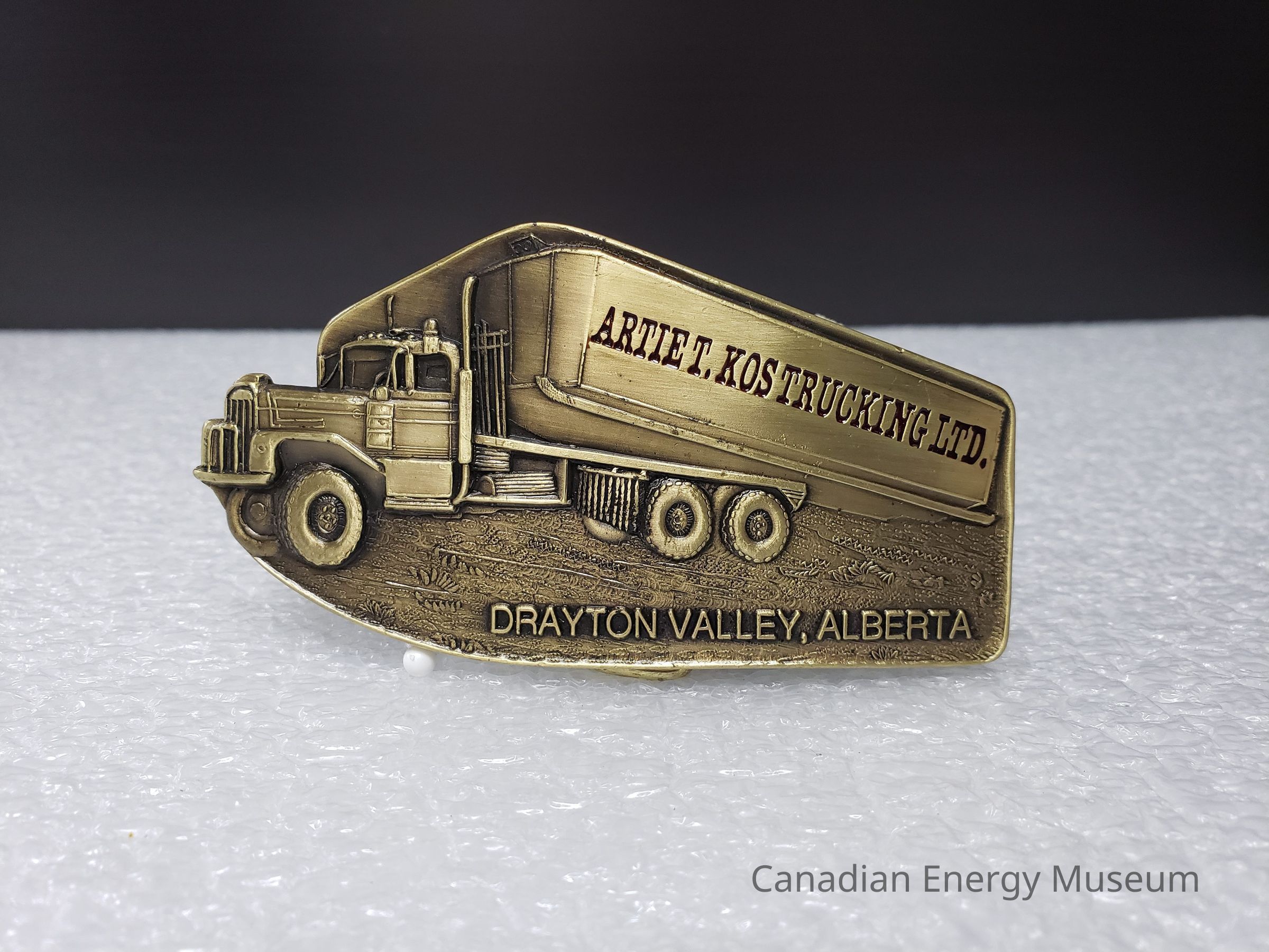 Old Description (Kelsey Dalrymple, 3 June 2020): Artie T. Kos Trucking Ltd. Drayton Valley, Alberta. Brass belt buckle in the shape of a semi truck.Collection