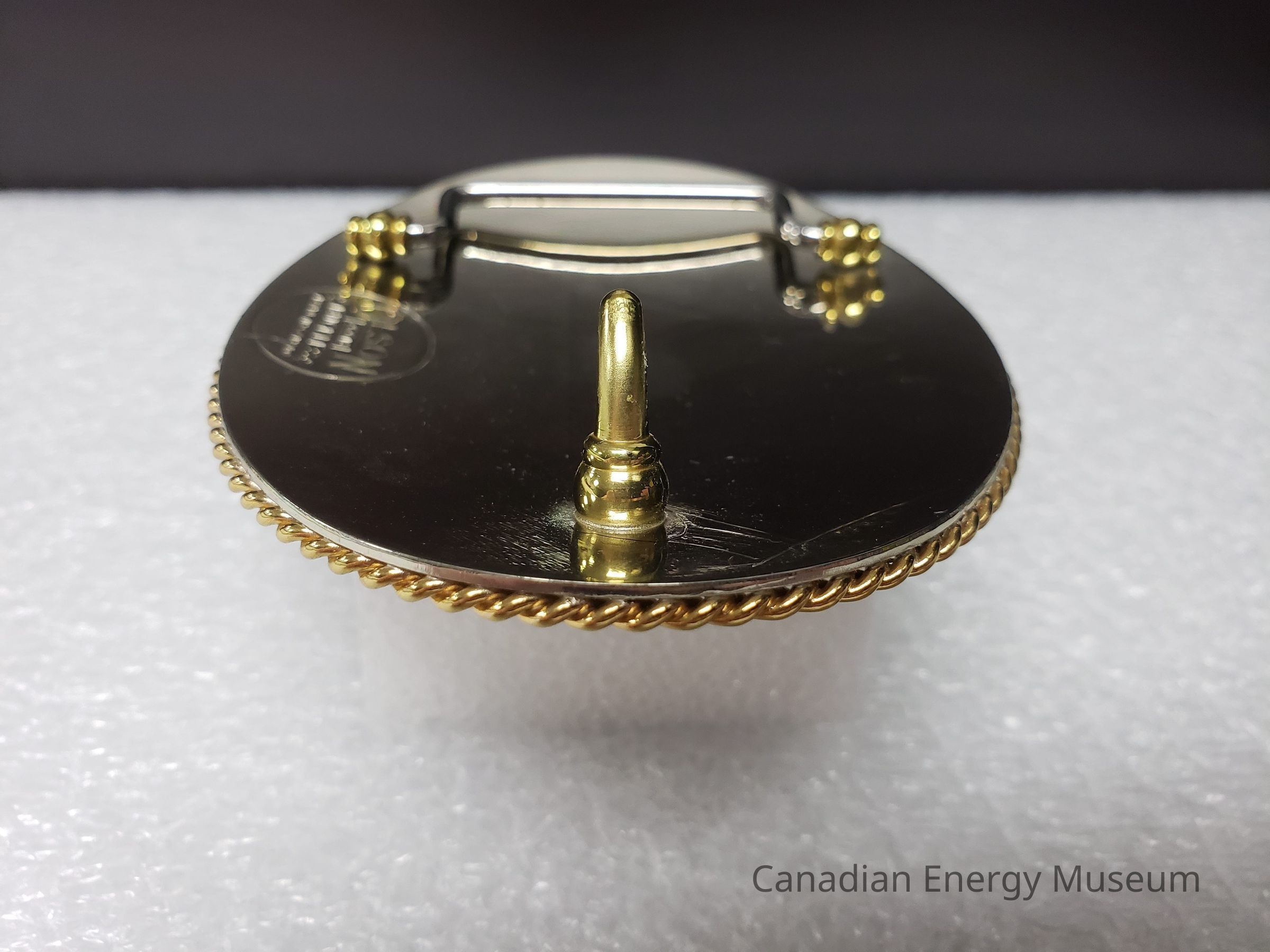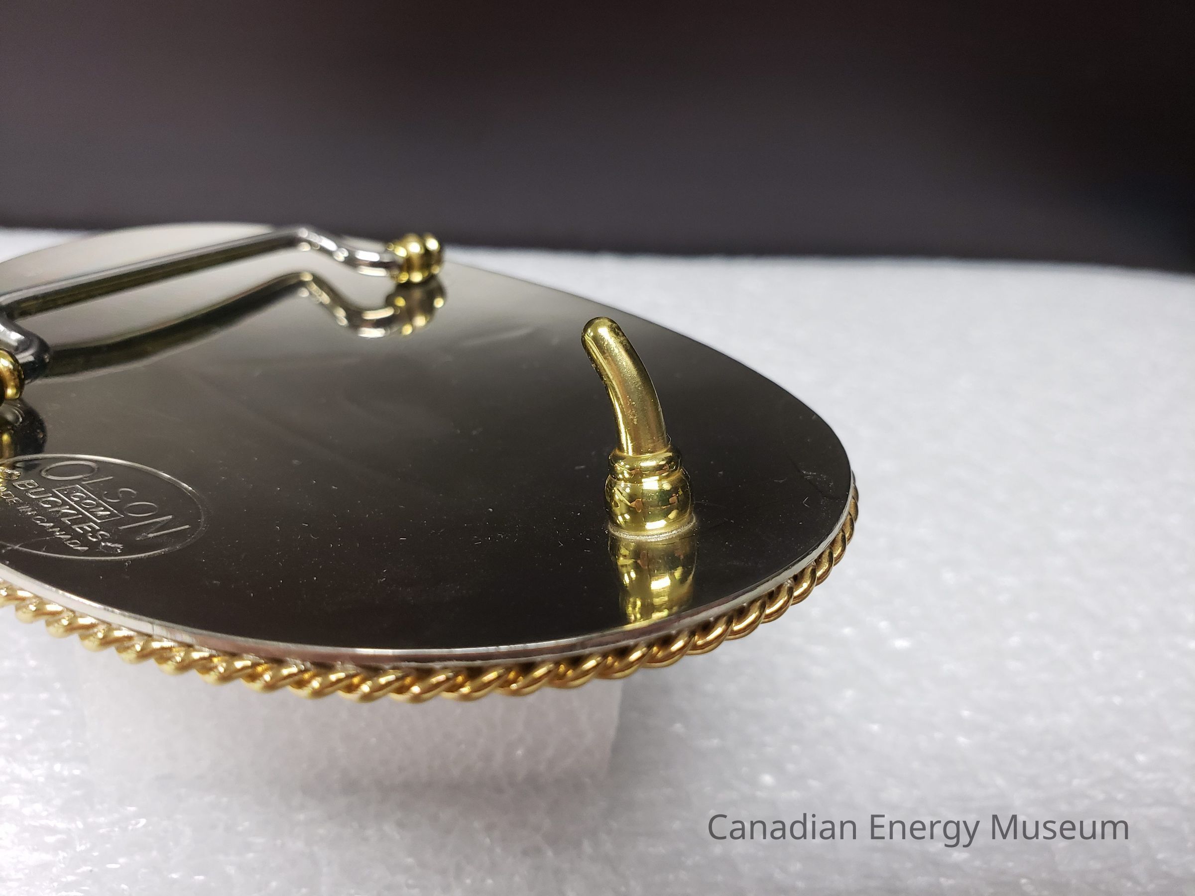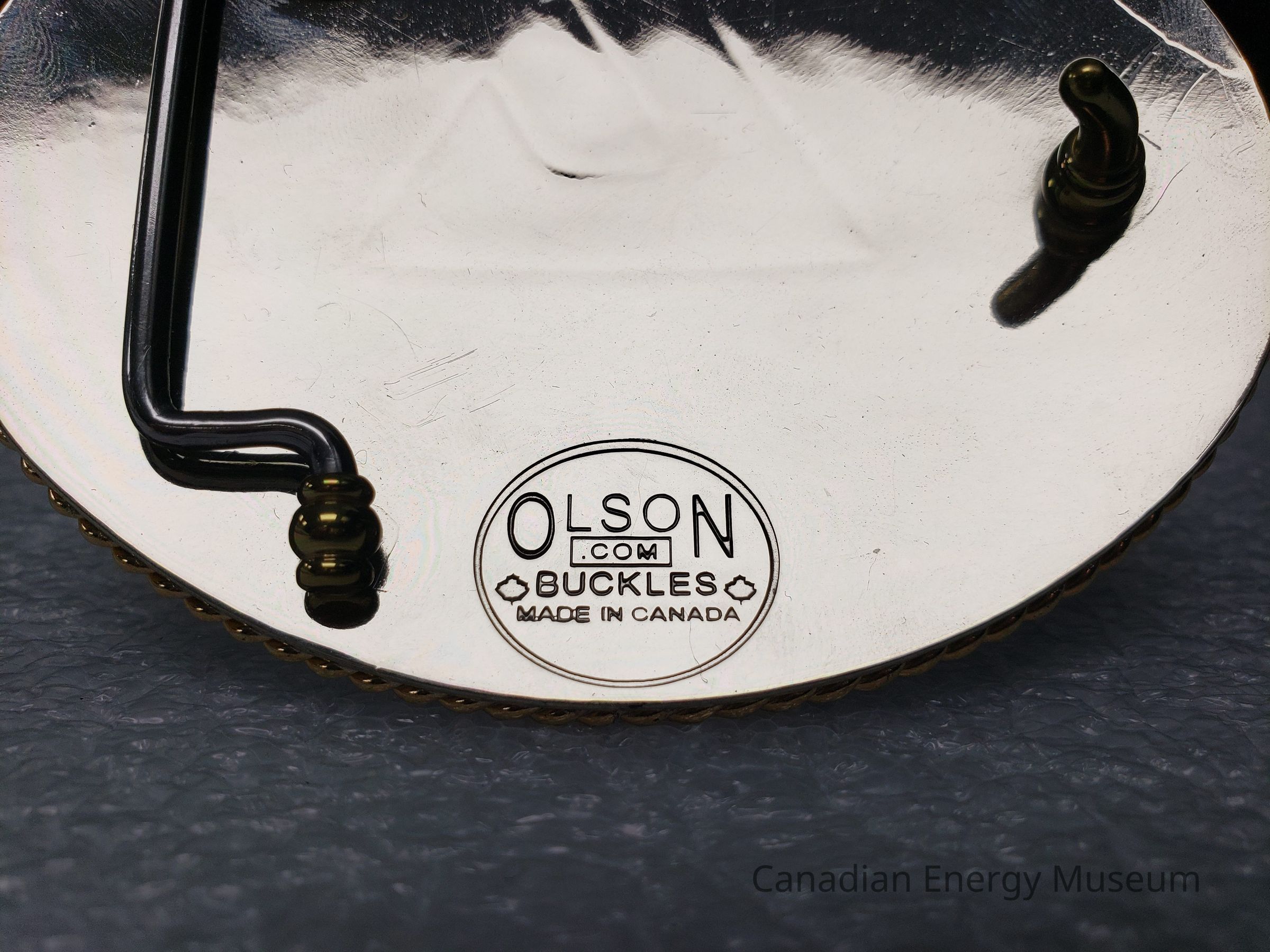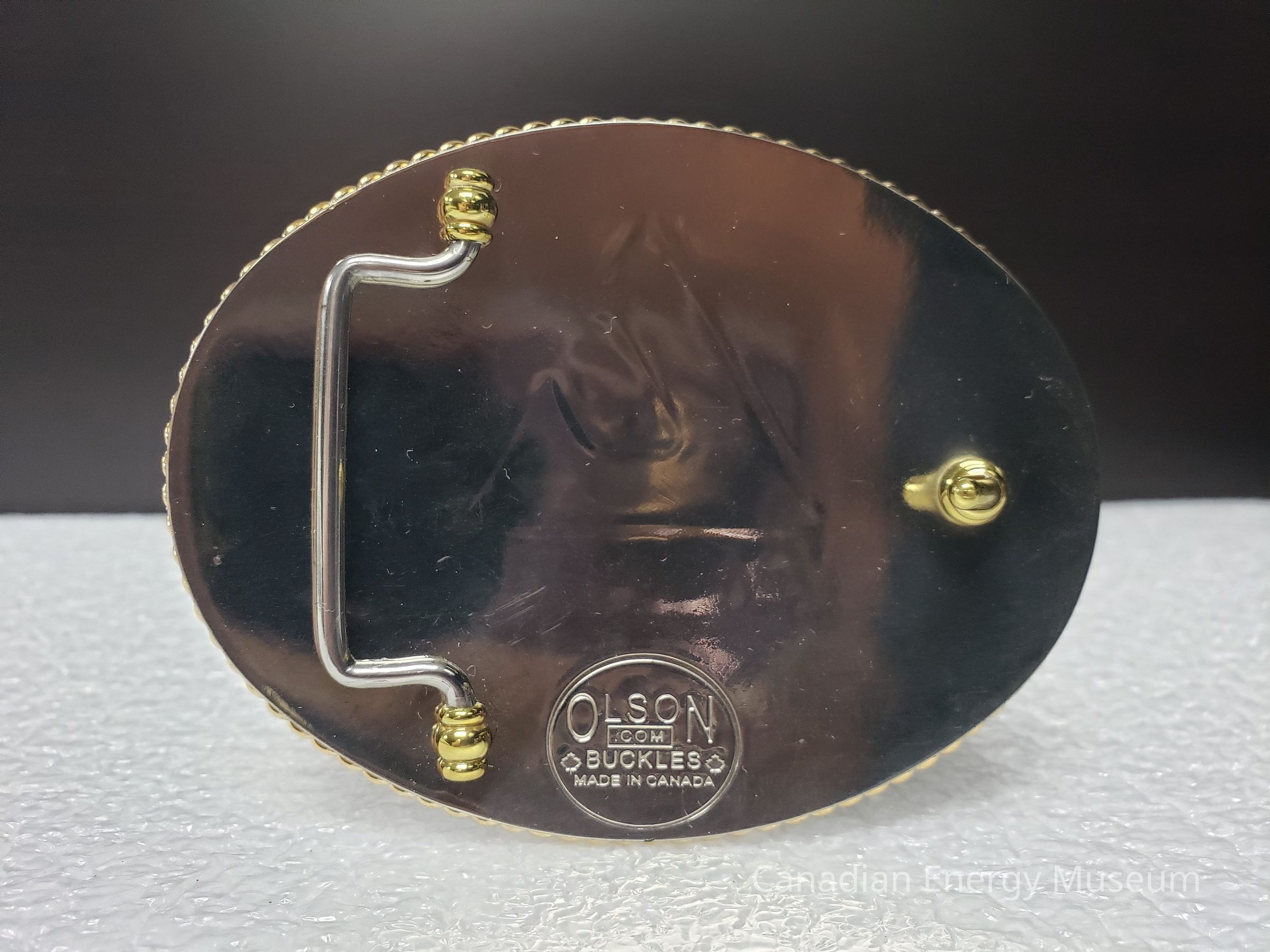 Back Elements: The back is smooth and mirrored, with an open hinge and curved hook (gold). The hinge (silver) is "U" shaped with turned-out ends that connect into two bases at the top and bottom (gold). At the bottom of the back is an impression with the maker's mark in an oval ring. Maker's mark reads "OLSON (.COM) BUCKLES; MADE IN CANADA" with outlines of maple leaves on either side of "BICKLES"Collection