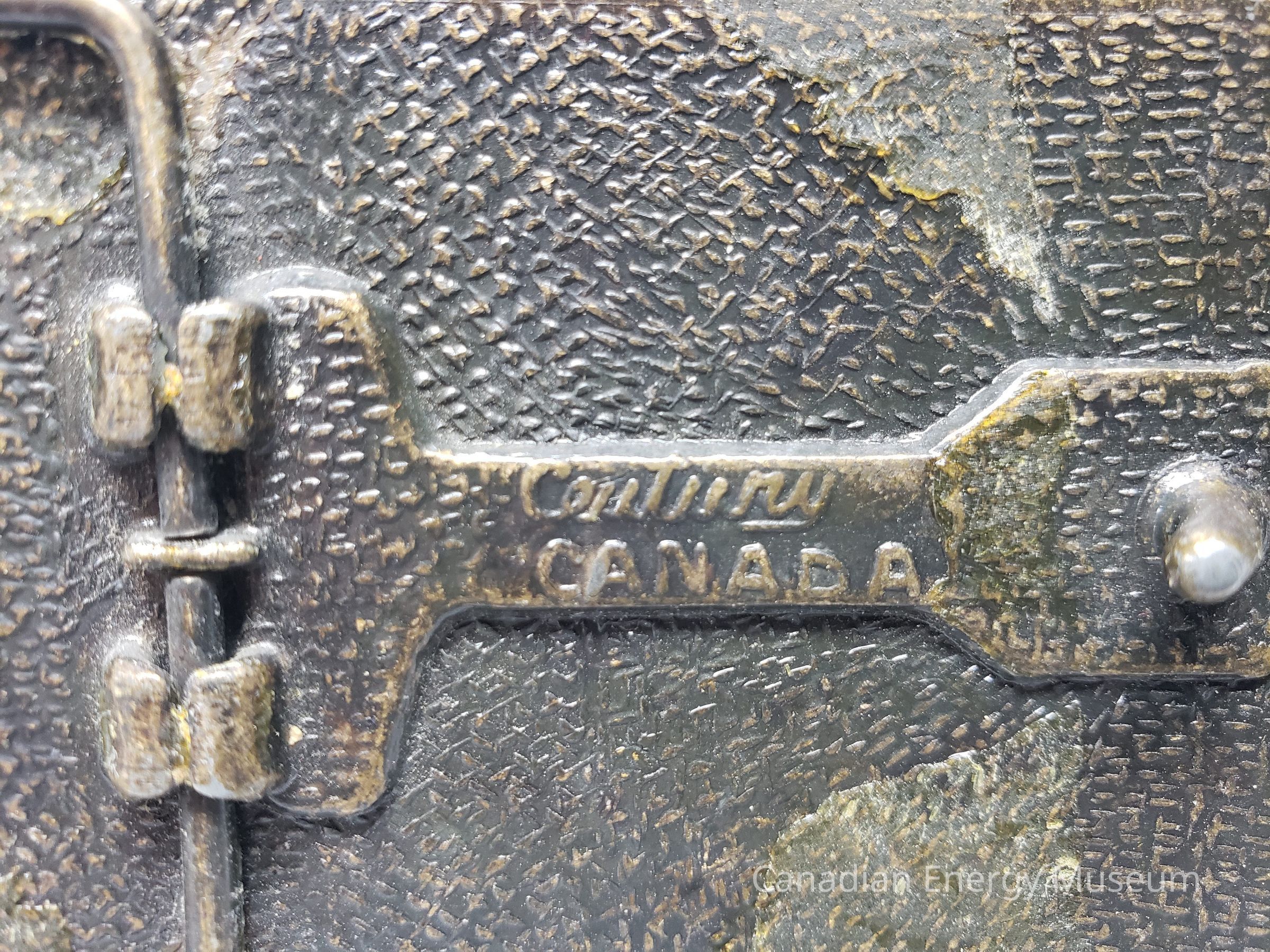 Back Elements: The back is a rice grain-like texture. In the center of the back surface there is a slightly raised area shaped sort of like a horizontal wine glass. There is a curved and rounded hook on the "cup" part. To the right of the "base" of the design is a hinge mechanism. The hinge is an irregular and elongated trapezoid attached at two points. In the very center of the back surface, on the "stem" of the wine glass type shape is a makers mark that reads "Century" in cursive, and "CANADA" in block text.