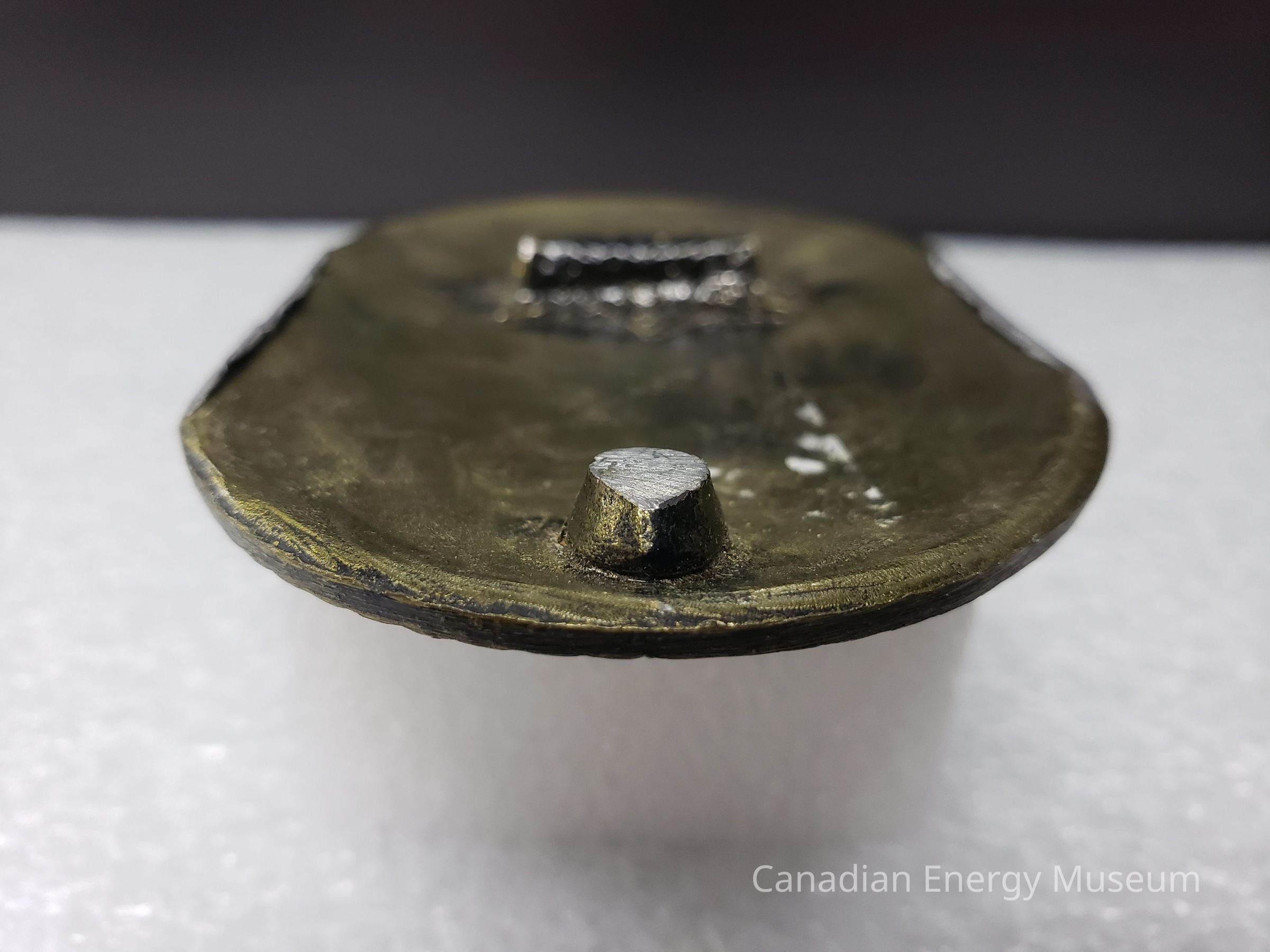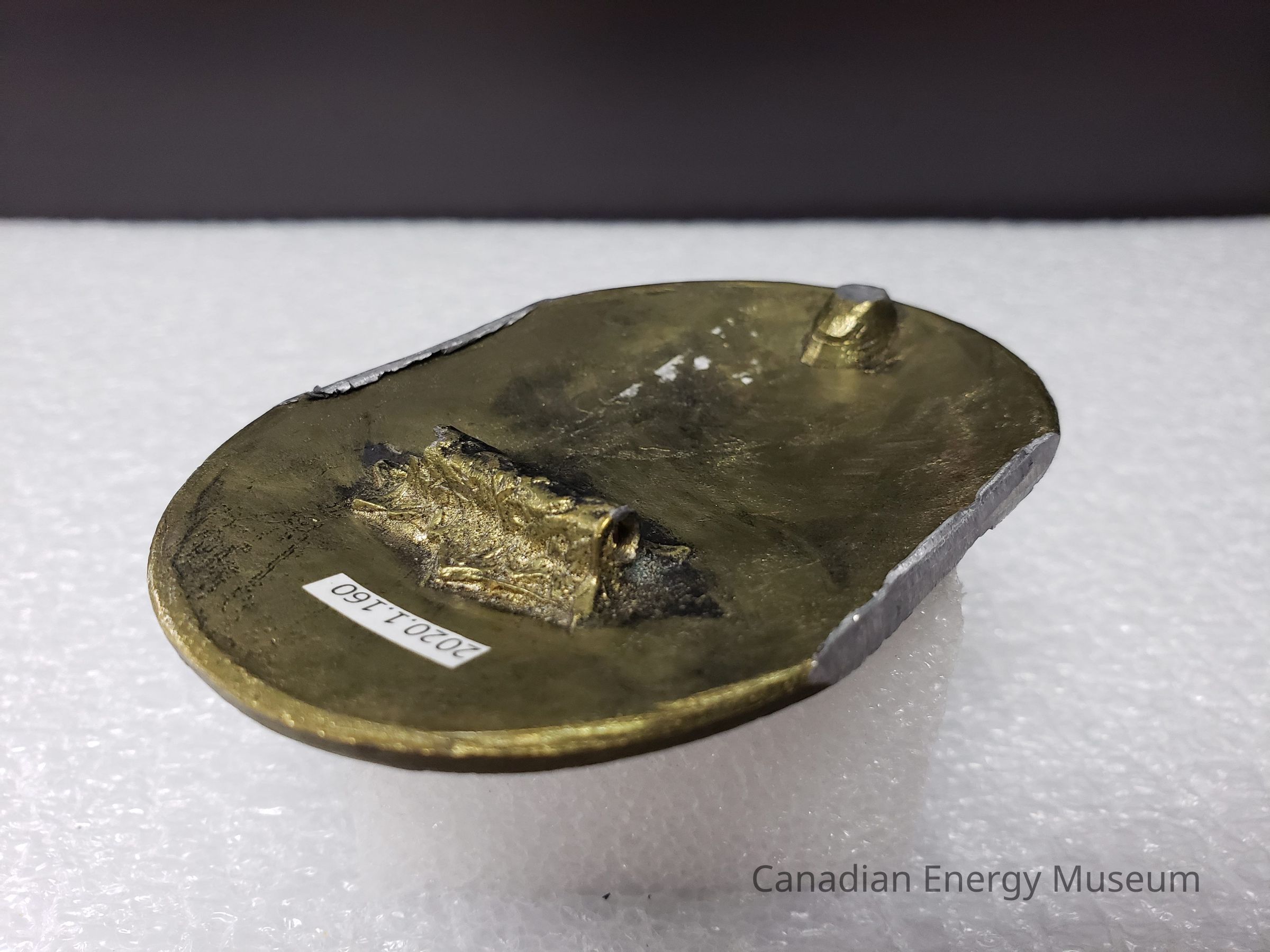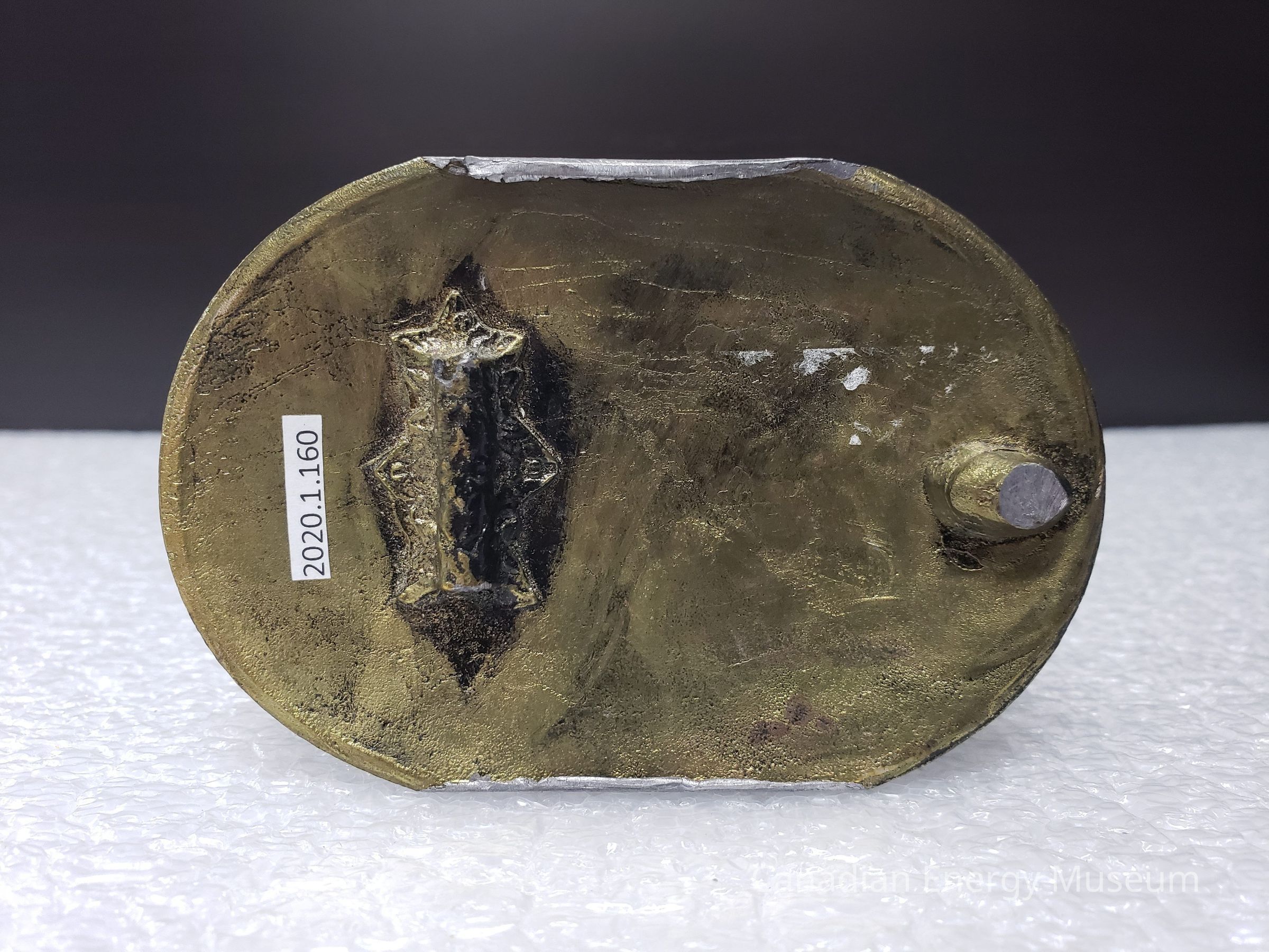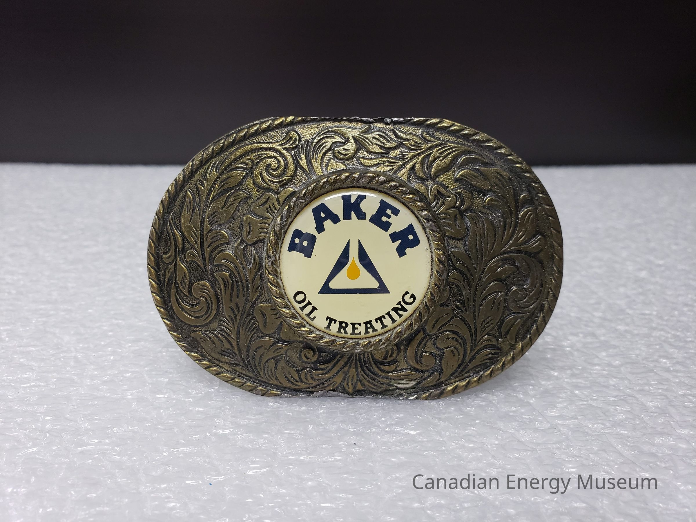 Old Description (Kelsey Dalrymple, 3 June 2020): Baker Oil Treating. Oval brass belt buckle with circular white enamel face. Blue text. Top and bottom edges have been cut away. (Donated by Gordon McQuaig).Collection