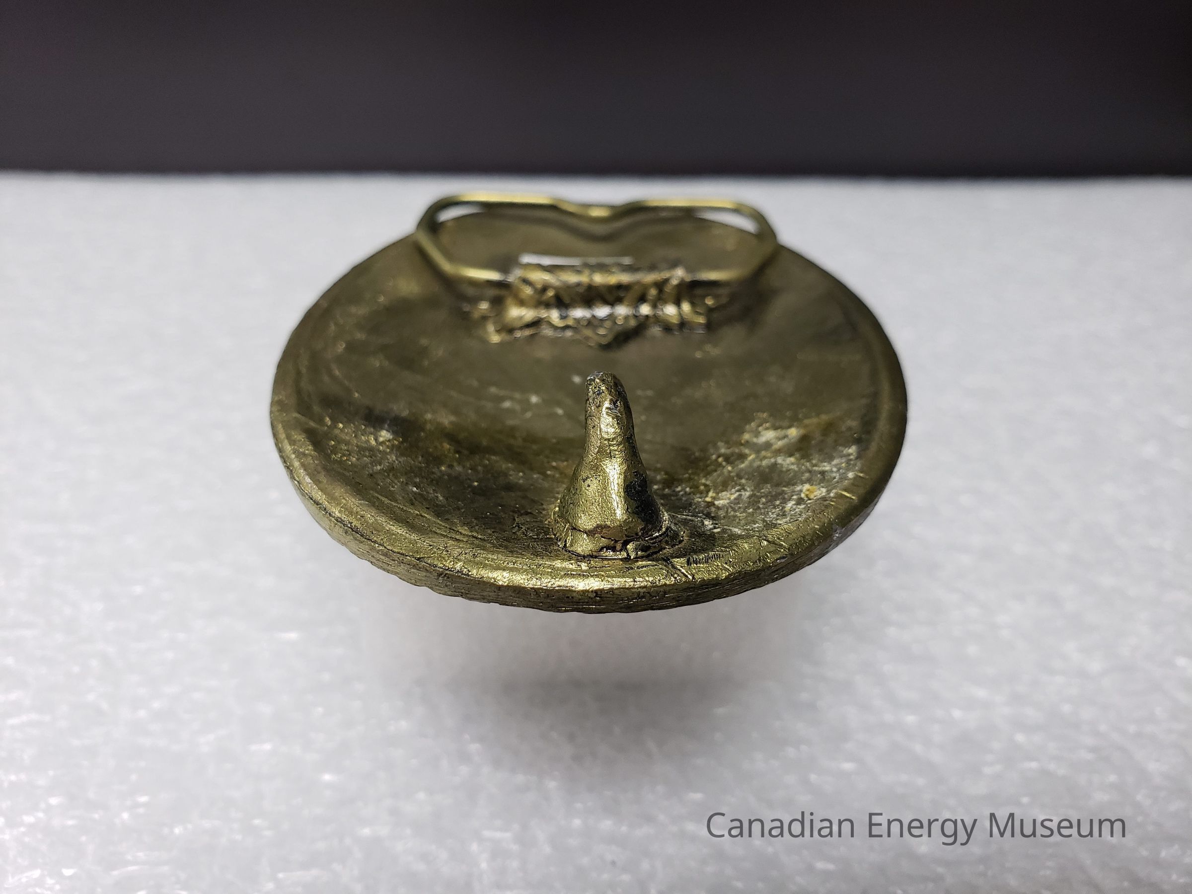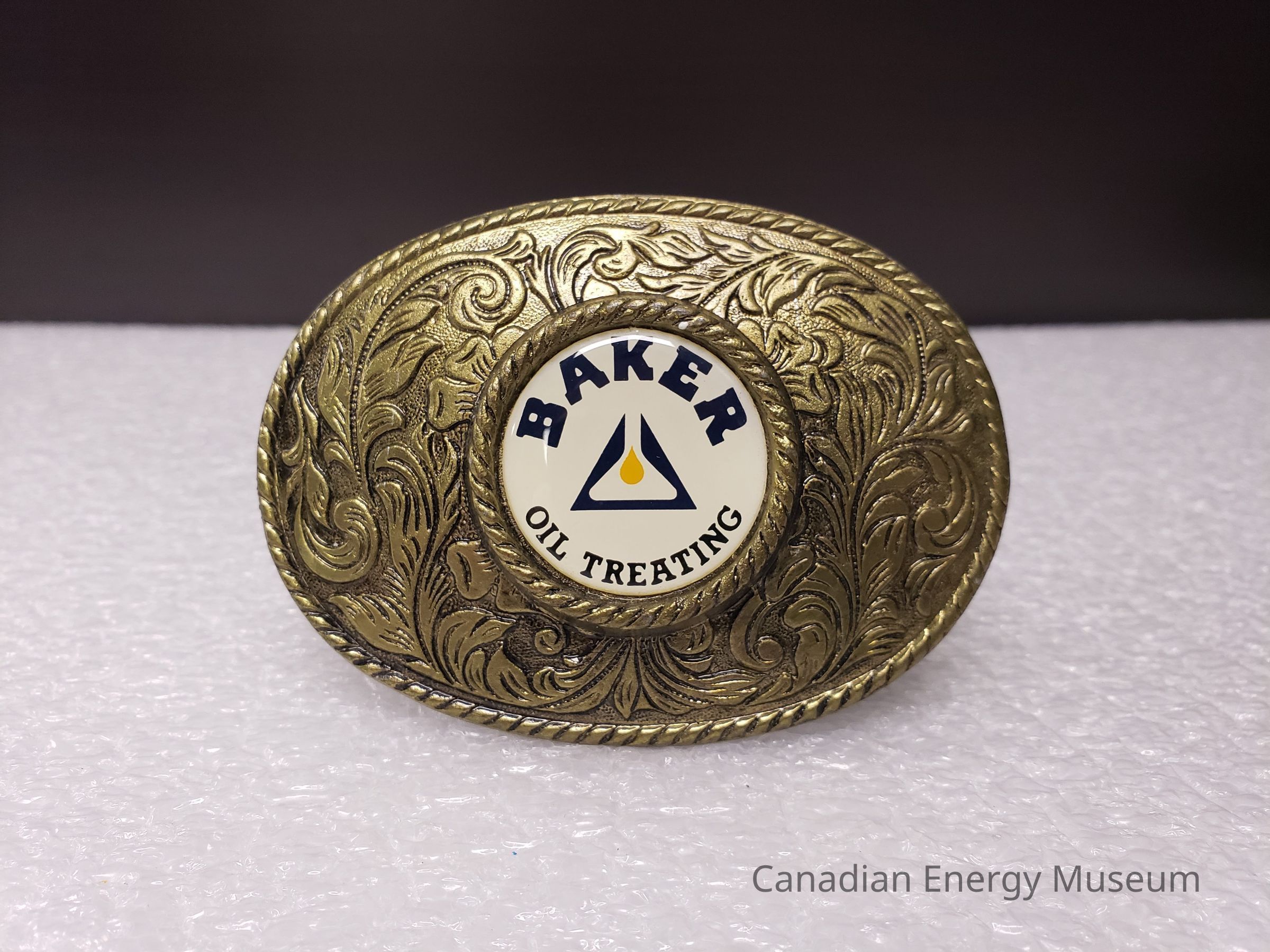 Old Description (Kelsey Dalrymple, 3 June 2020): Baker Oil Treating. Oval brass belt buckle with circular white enamel face. Blue text. (Donated by Gordon McQuaig).Collection