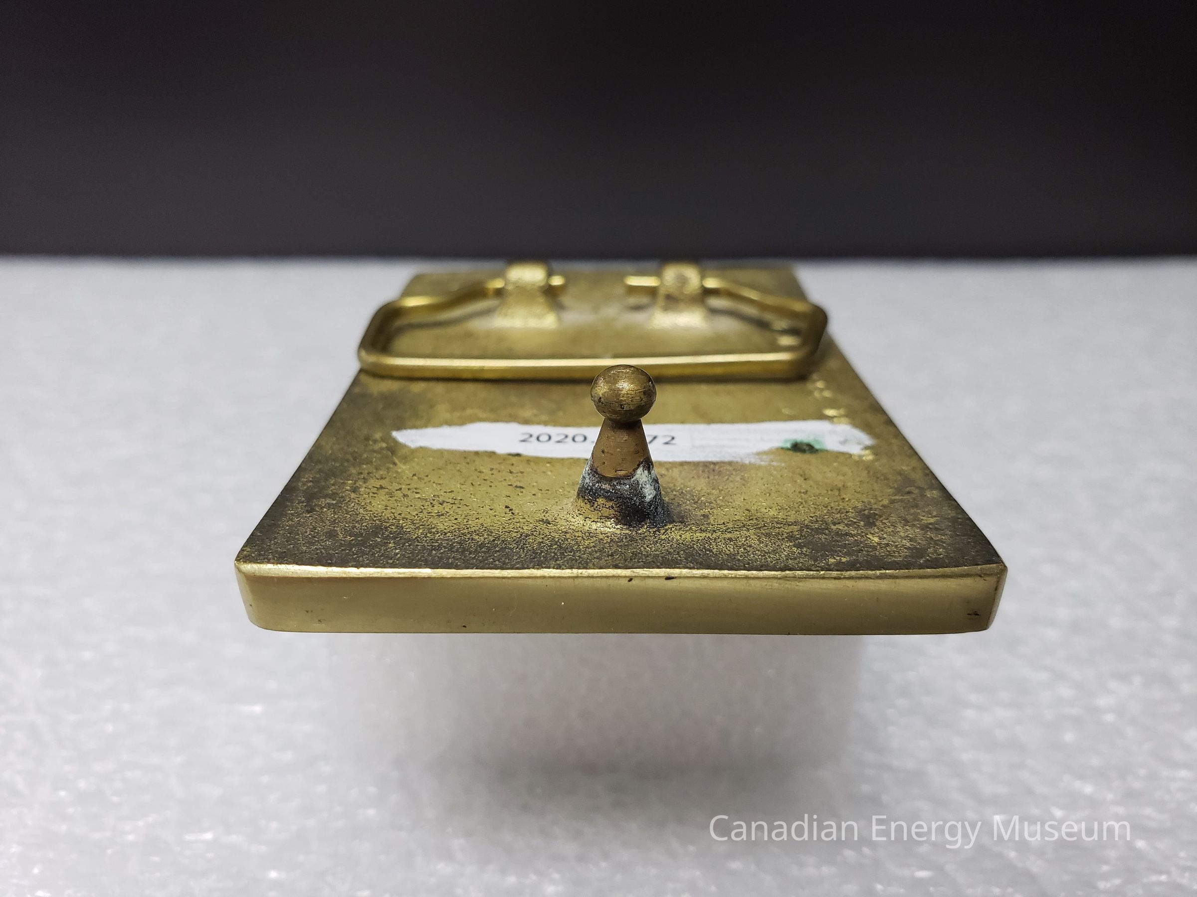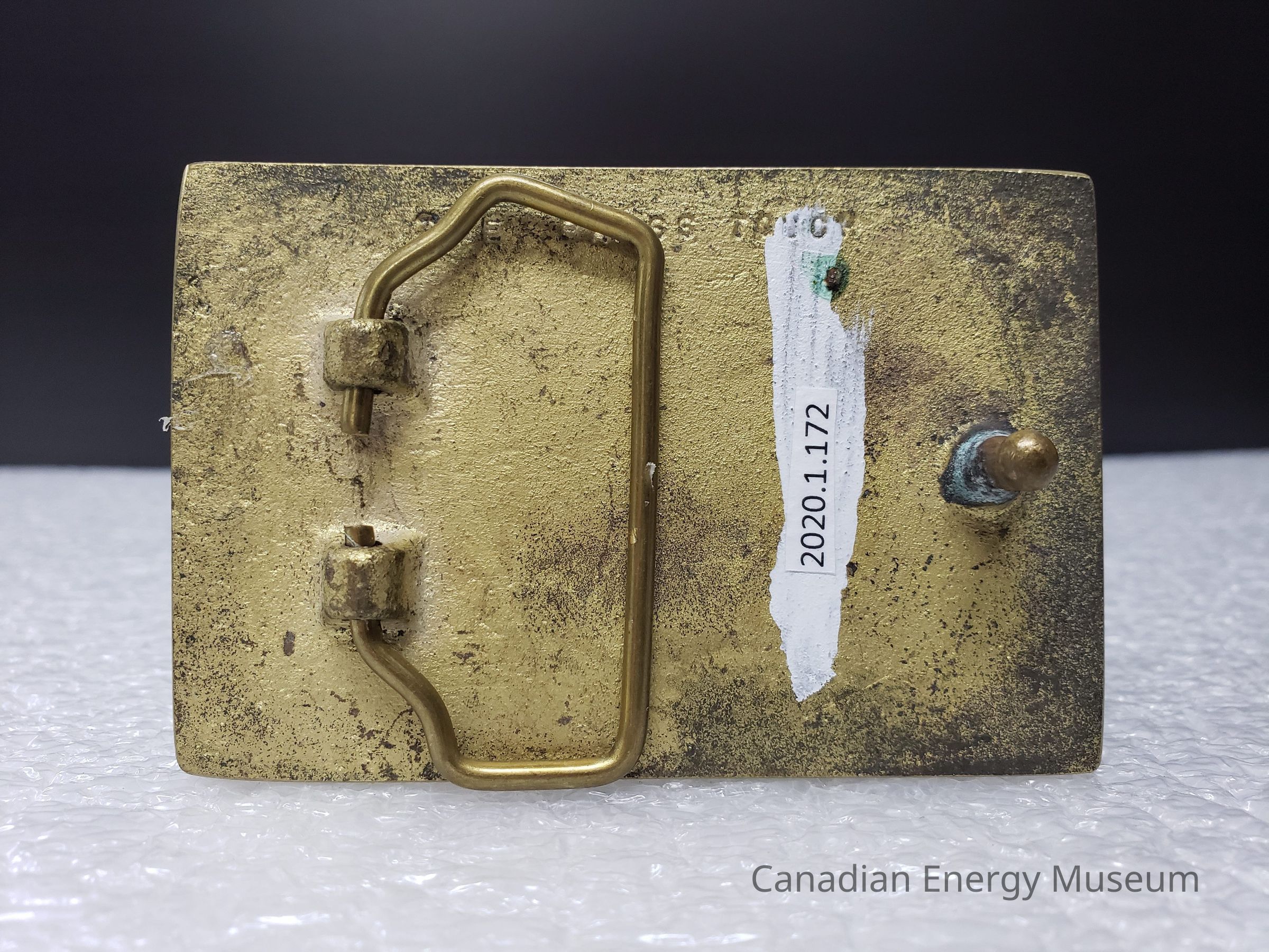 Features: A rectangular, cast brass belt buckle, with a fine sheet of metal (or plastic) mounted at the centre. The buckle has a flat front and a lightly curved back.