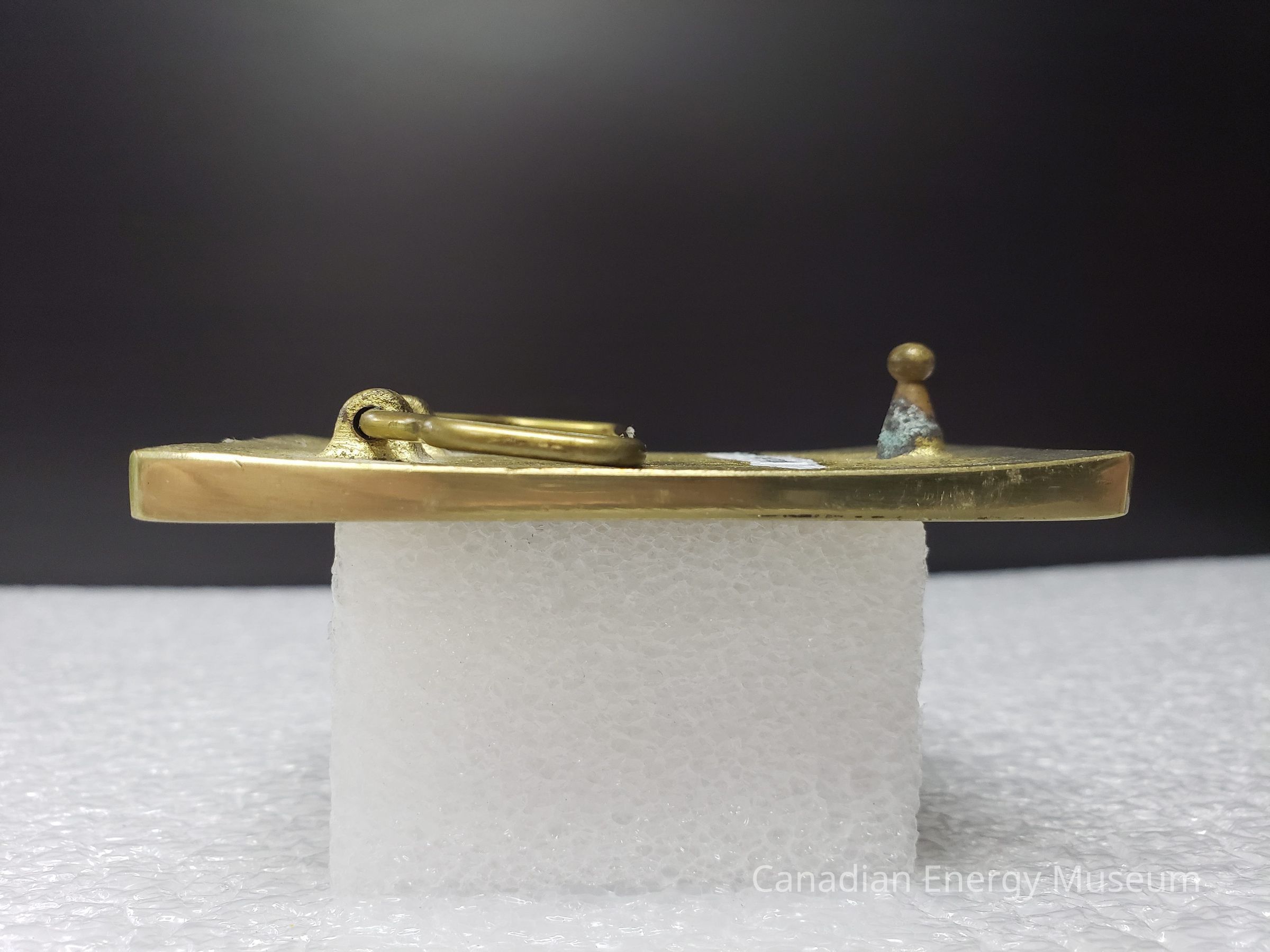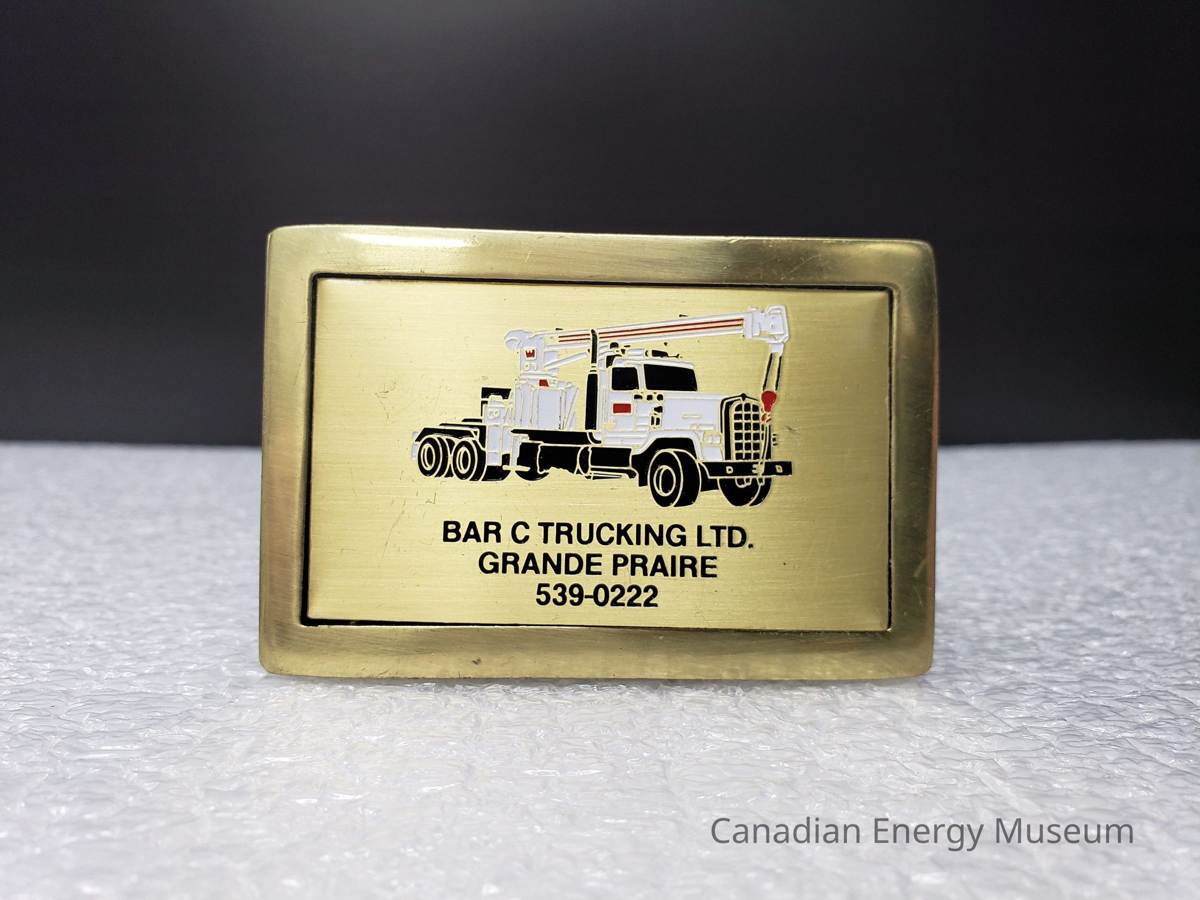 Old Description (Kelsey Dalrymple, 3 June 2020): Bar C Trucking Ltd. Rectangular brass buckle with white truck on face.Collection