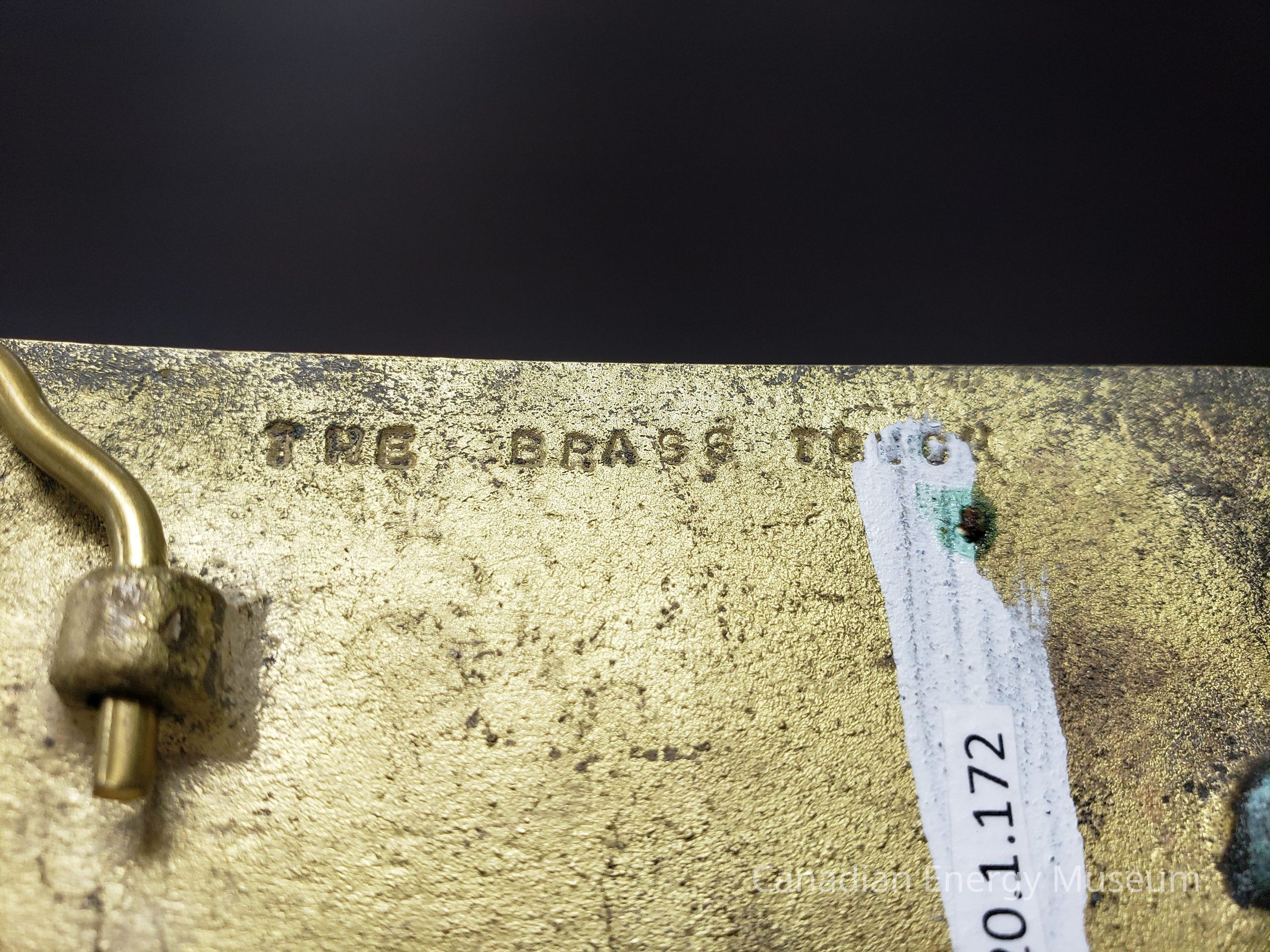 Back Elements: The back is unfinished, with an irregular hexagonal hinge connected to a two-point base; and a cone-shaped hook with a ball top. Along the top is debossed the text "THE BRASS TOUCH".