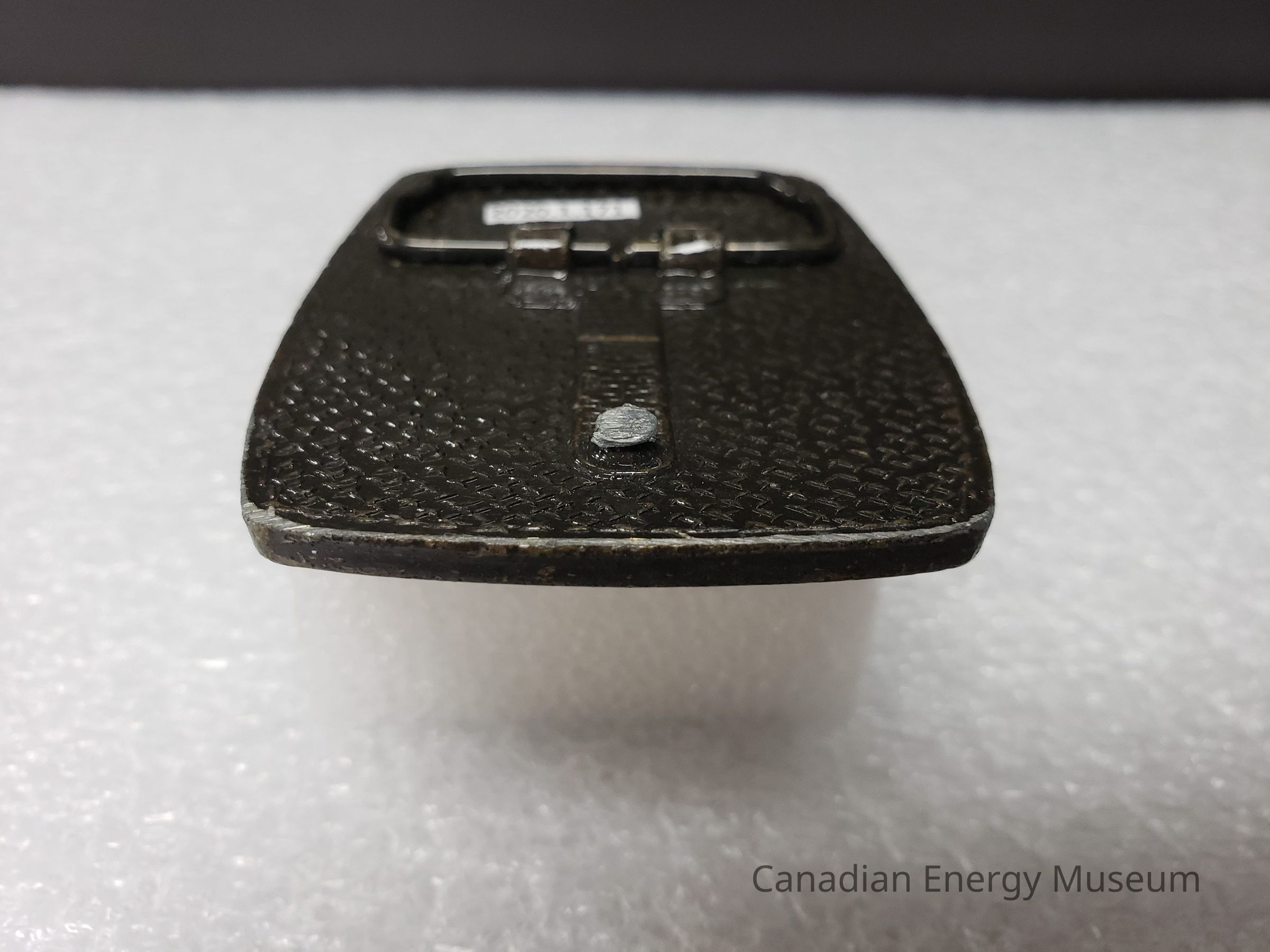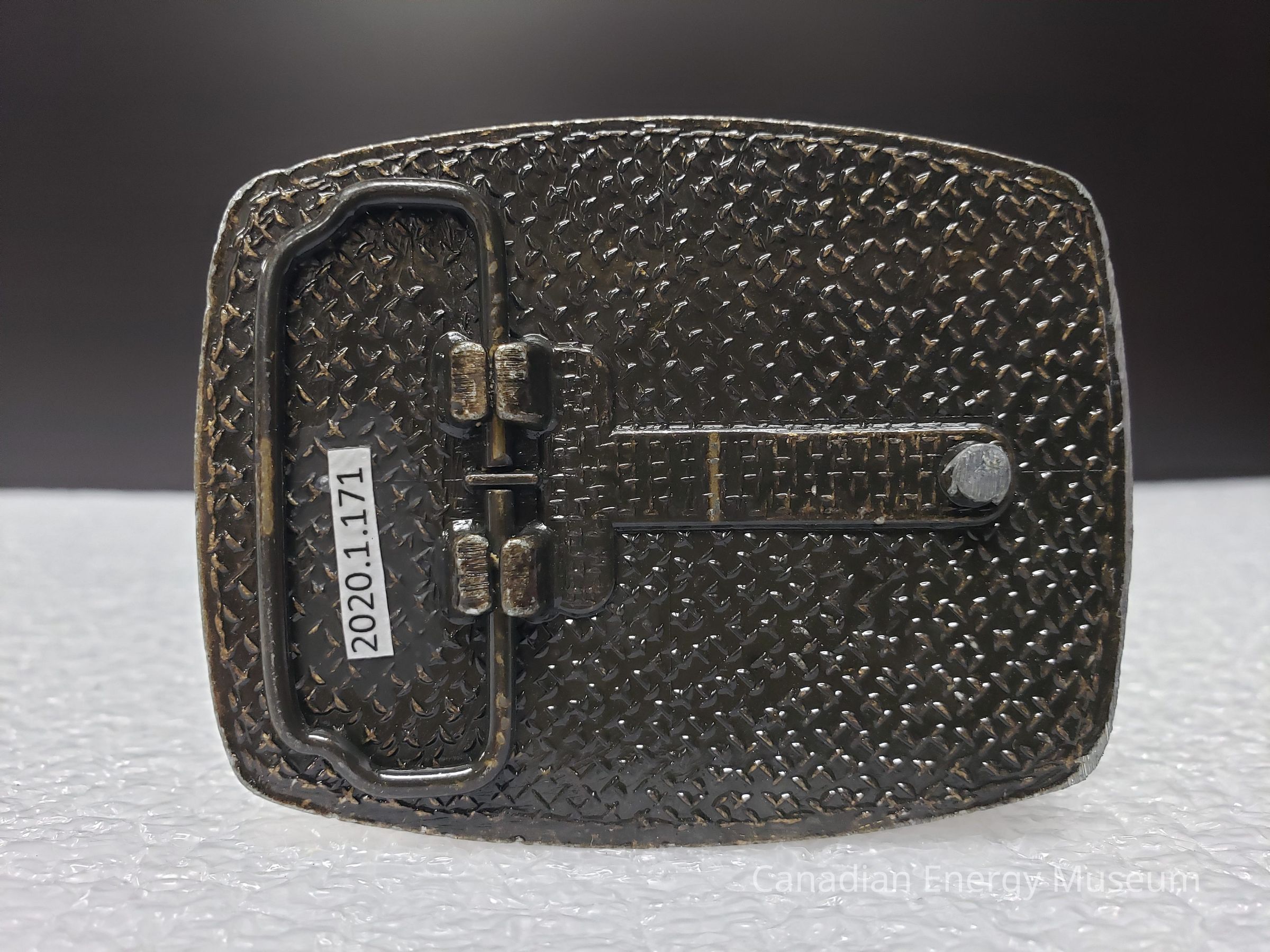 A bulged rectangle belt buckle, branded to Barban Pipe Handlers Ltd. Intentionally damaged, hook removed.