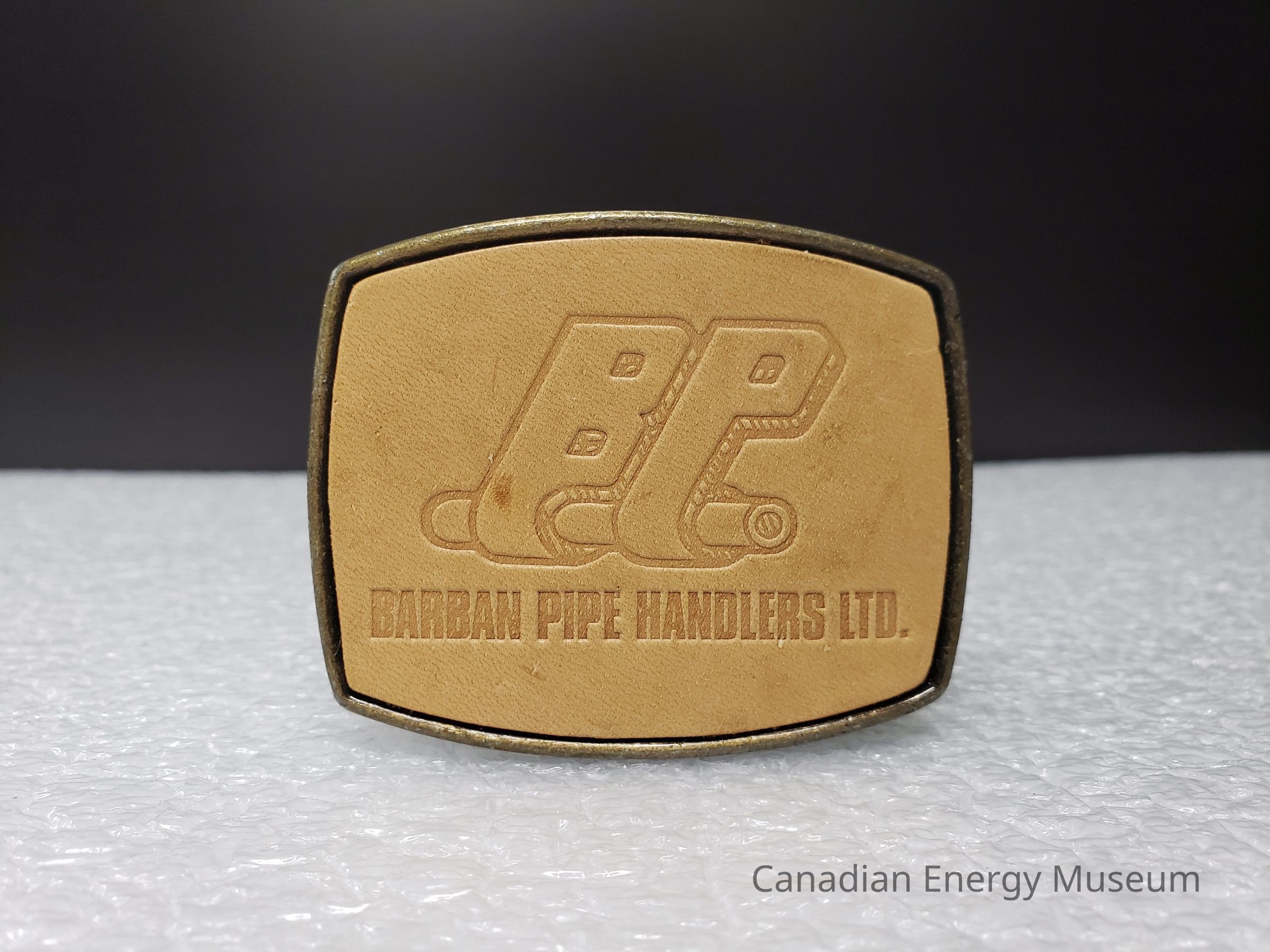 Old Description (Kelsey Dalrymple, 3 June 2020): Barban Pipe Handlers Ltd. Rectangular brass buckle with leather face. BP is wrapped around a pipe. (Donated by Bob Barnett).Collection