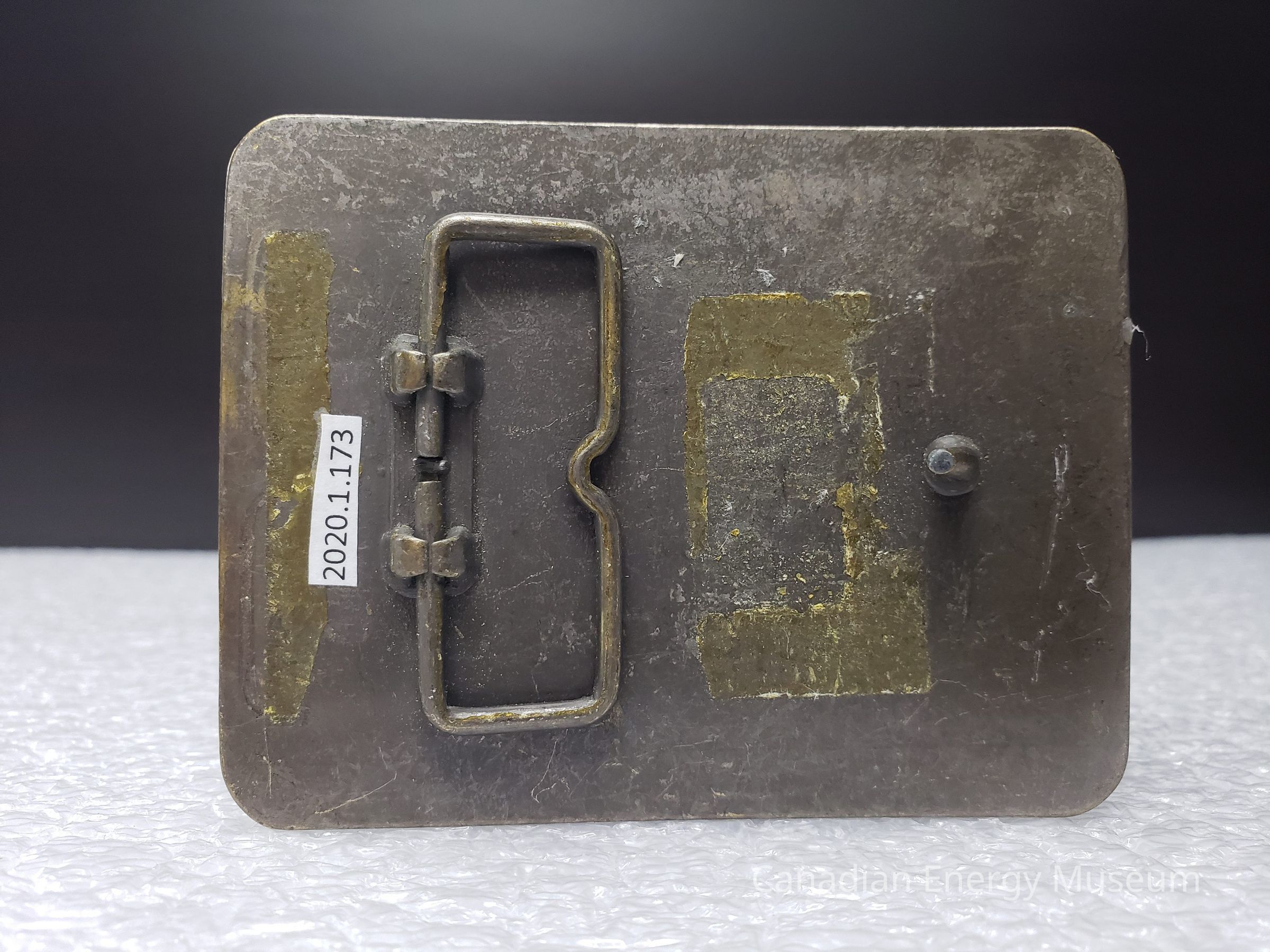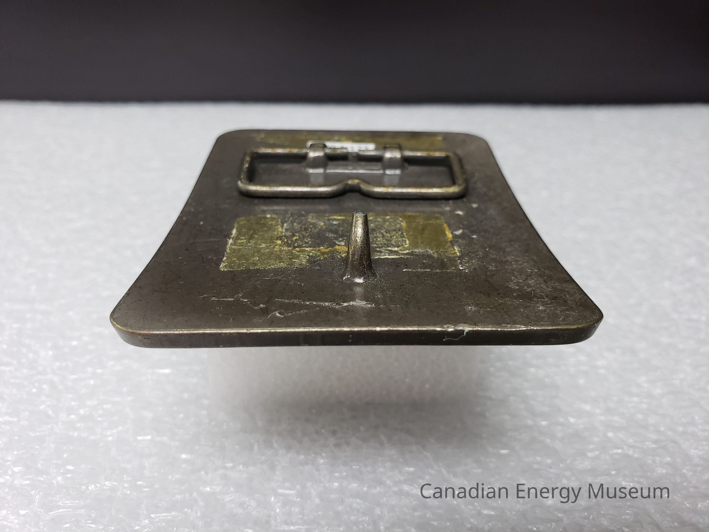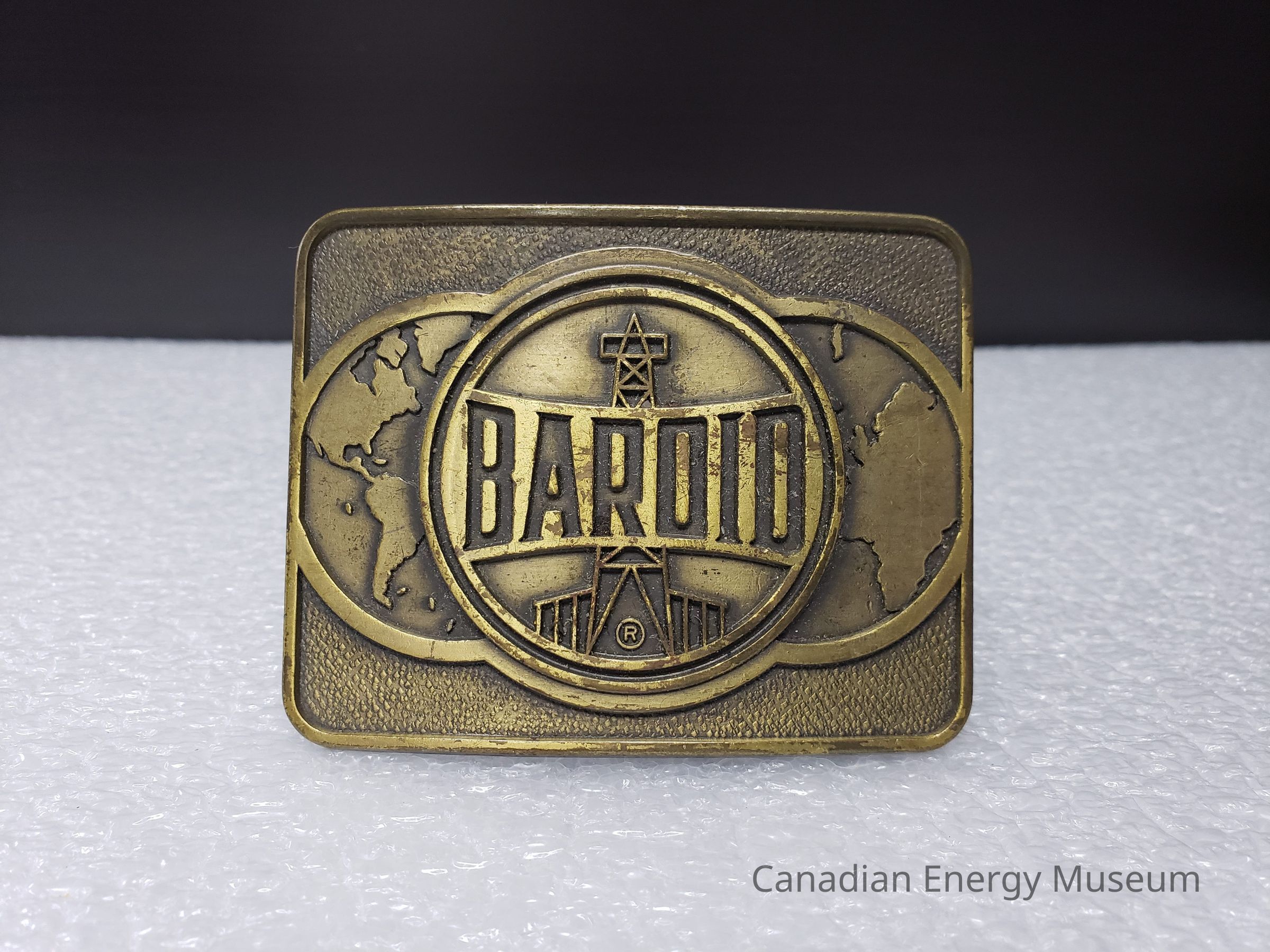 Old Description (Kelsey Dalrymple, 3 June 2020): Baroid. Rectangular brass belt buckle with globes and rig on face (Donated by Gordon McQuaig).Collection