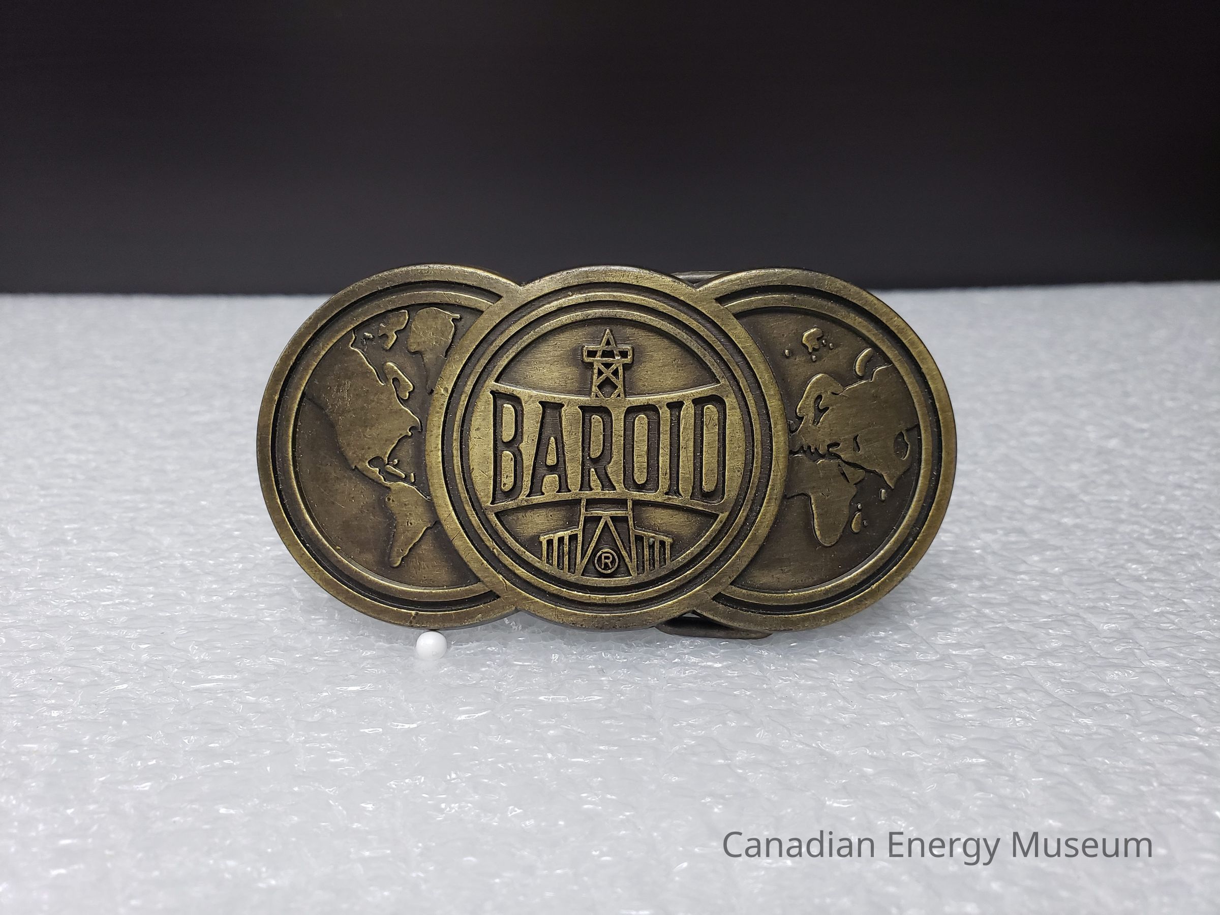 Front Design: The shape/design of the buckle is comprised of three overlapping circles. The centre circle has a triple ring border (2mm outer, 1mm middle, 1mm inner), with the concave curved block text "BAROID" across the middle, and an oil rig design in the background. A 'Registered' symbol (®) can be seen in the base of the oil rig design. Behind, and to either side, are additional circles (a crescent shape is visible of each) with double ring borders (2mm outer, 1mm inner). Within the borders are lightly raised globe designs (left is the American continent, right is the African continent and part of Europe).