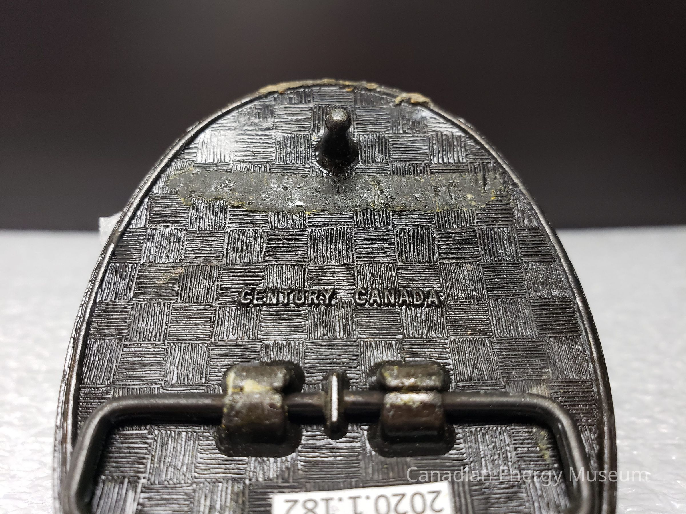Back Elements: The back has a checkered pattern with an alternating line texture inside each square. Around the edge is a lightly raised twin-ring border. The hook is rounded and curved, and the hinge is an elongated trapezoid connected to the buckle at two points. Between these elements is the slightly raised text "CENTURY CANADA".