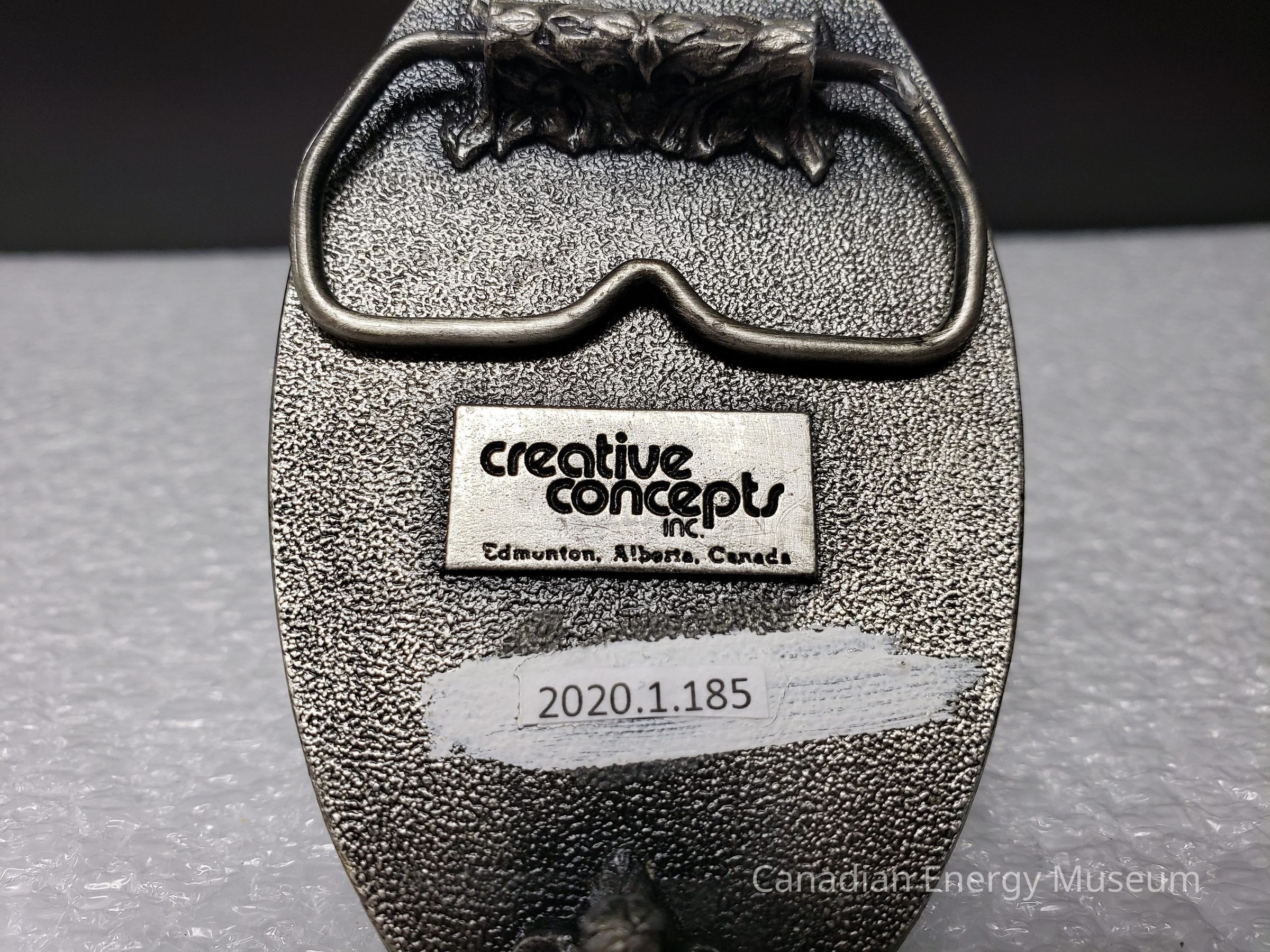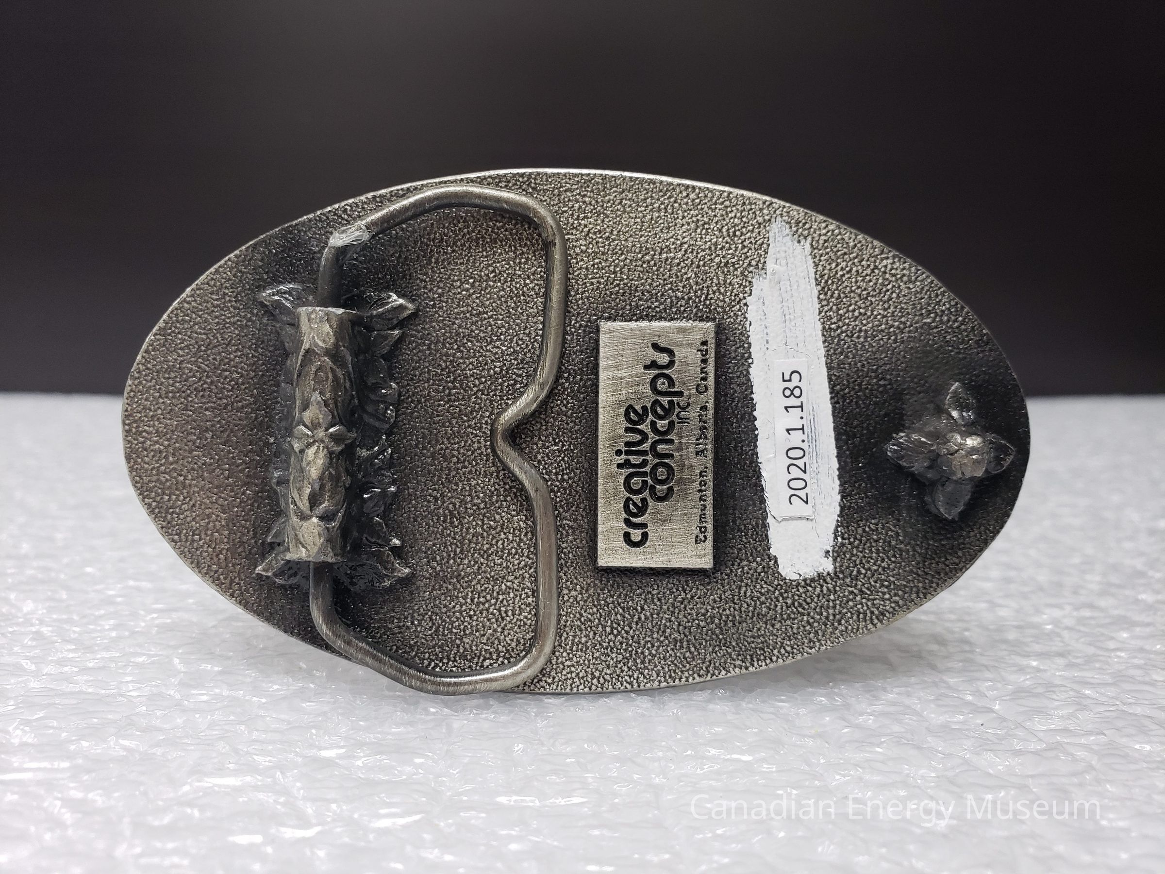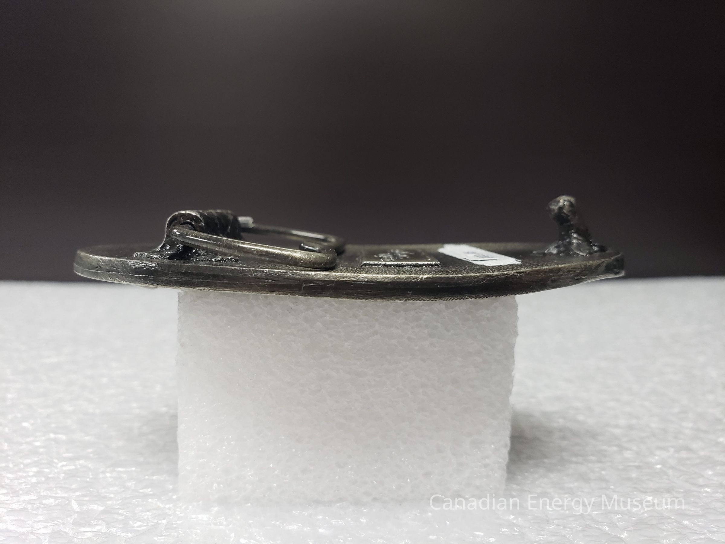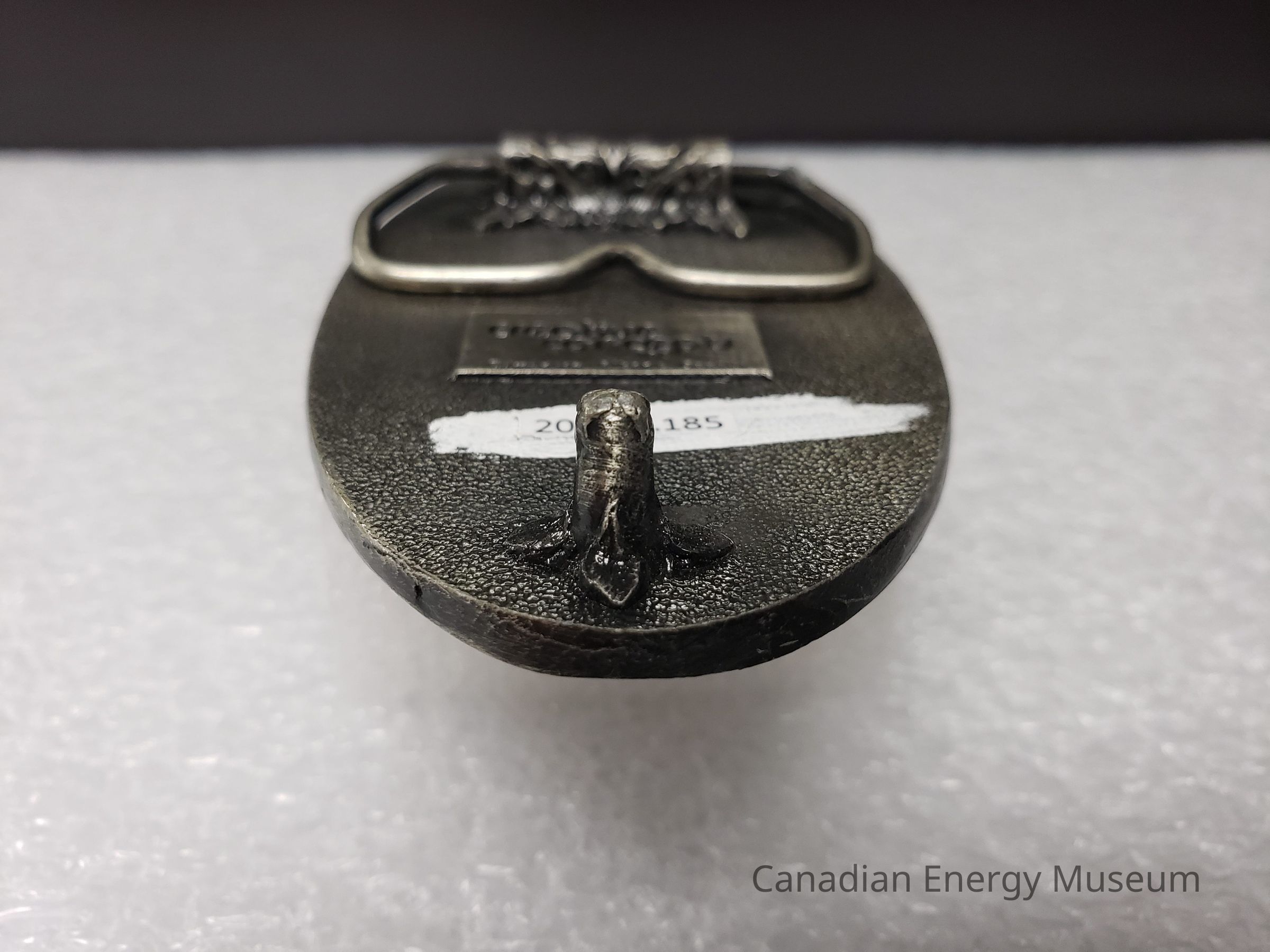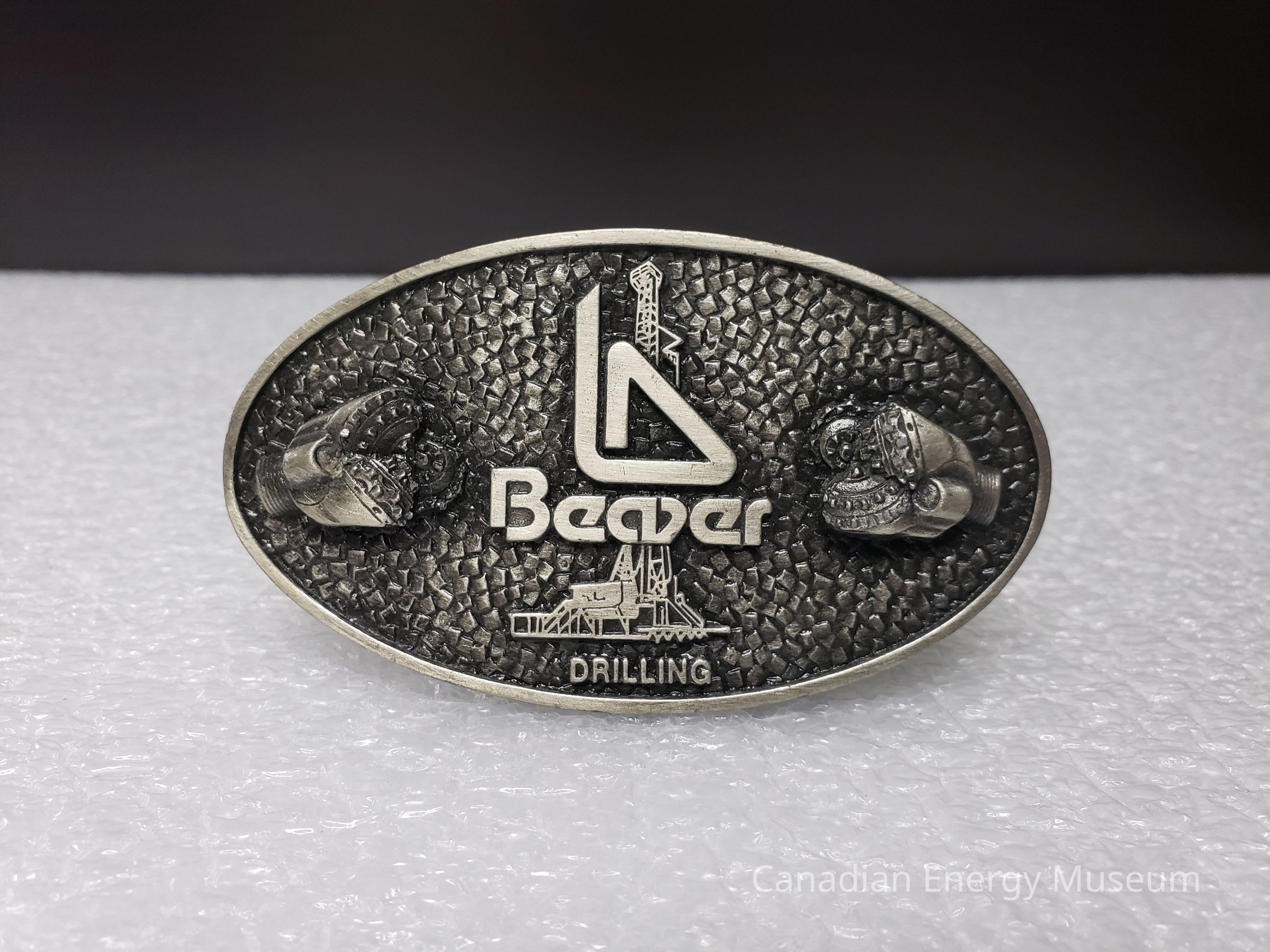 Old Description (Kelsey Dalrymple, 3 June 2020): Beaver Drilling. Oval pewter belt buckle. Drill bit on either side, rig in center.Collection