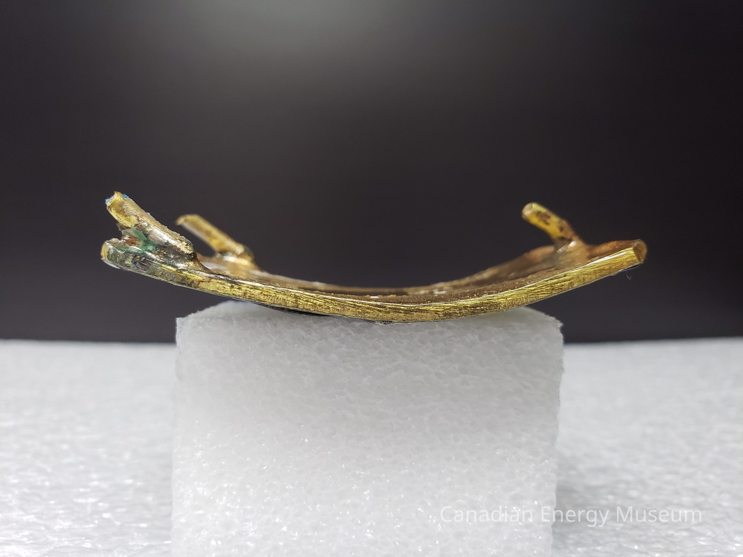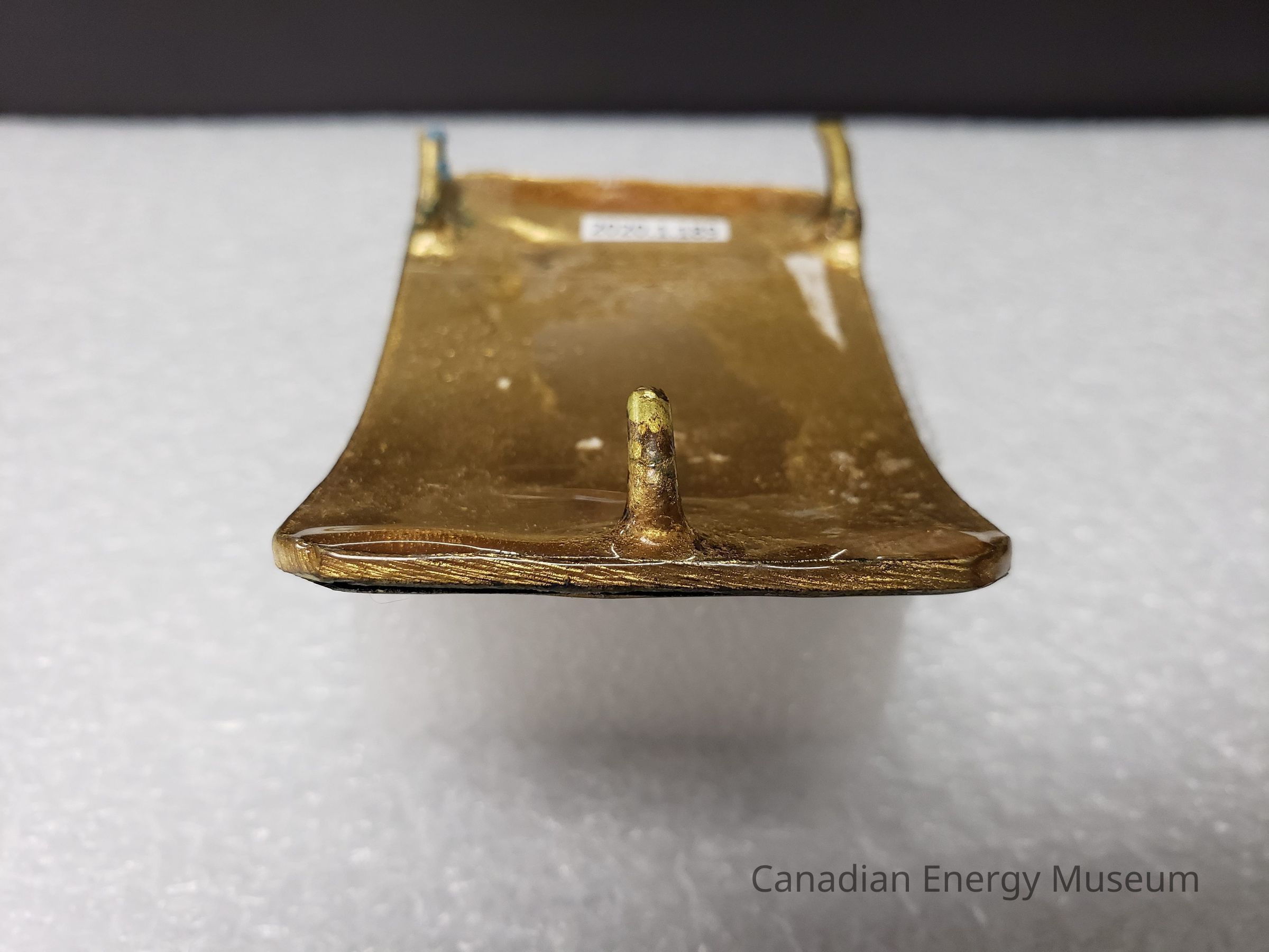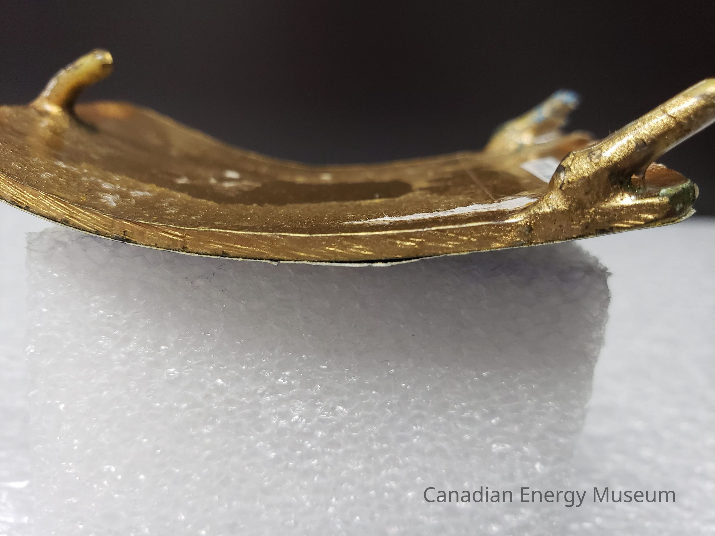 Back Elements: The back has a smooth texture and appears to have been painted in gold over a brass base. To the right is a curved hook, and the broken stumps of what was a stationary hinge to the left. No maker's mark.