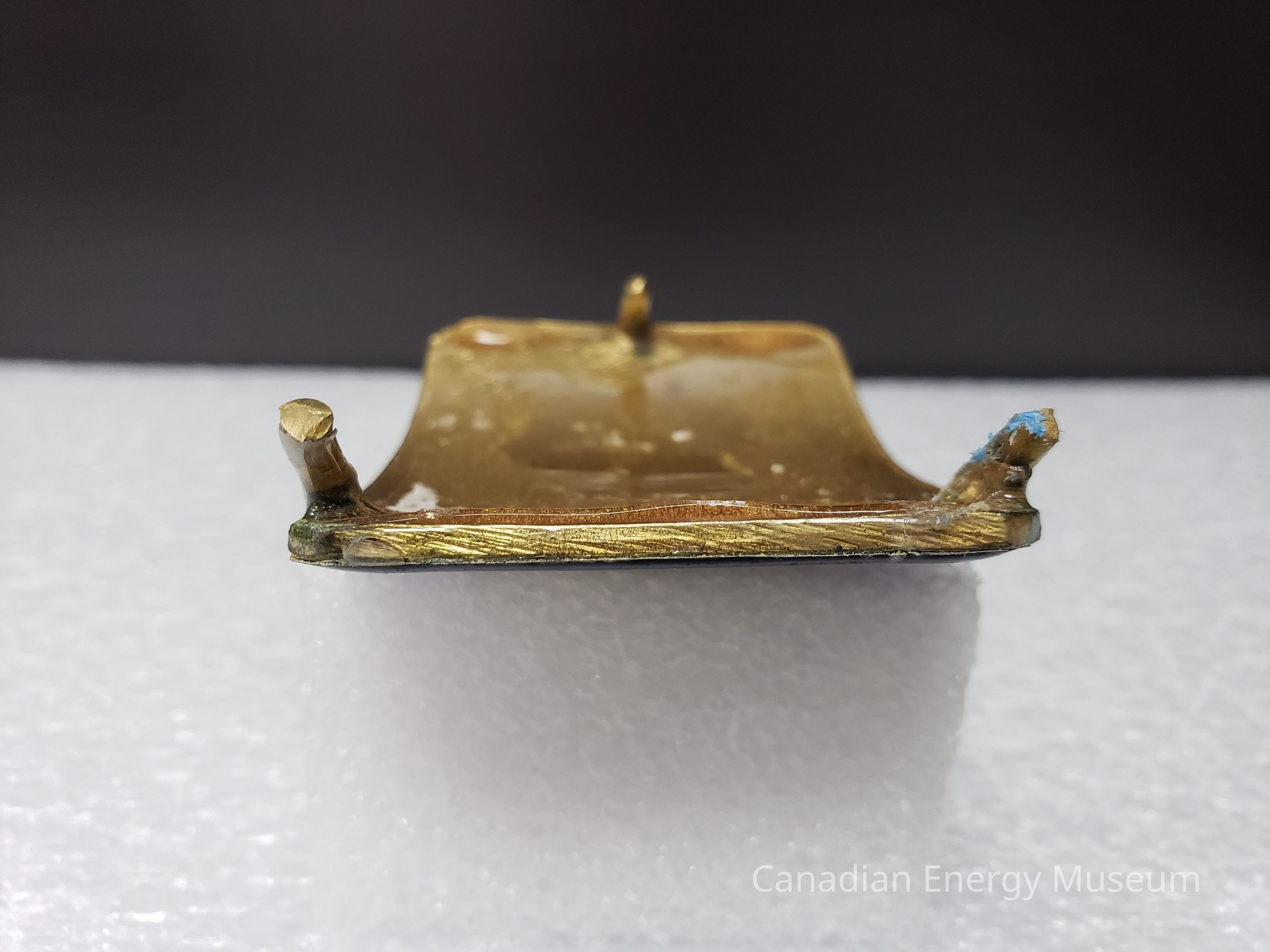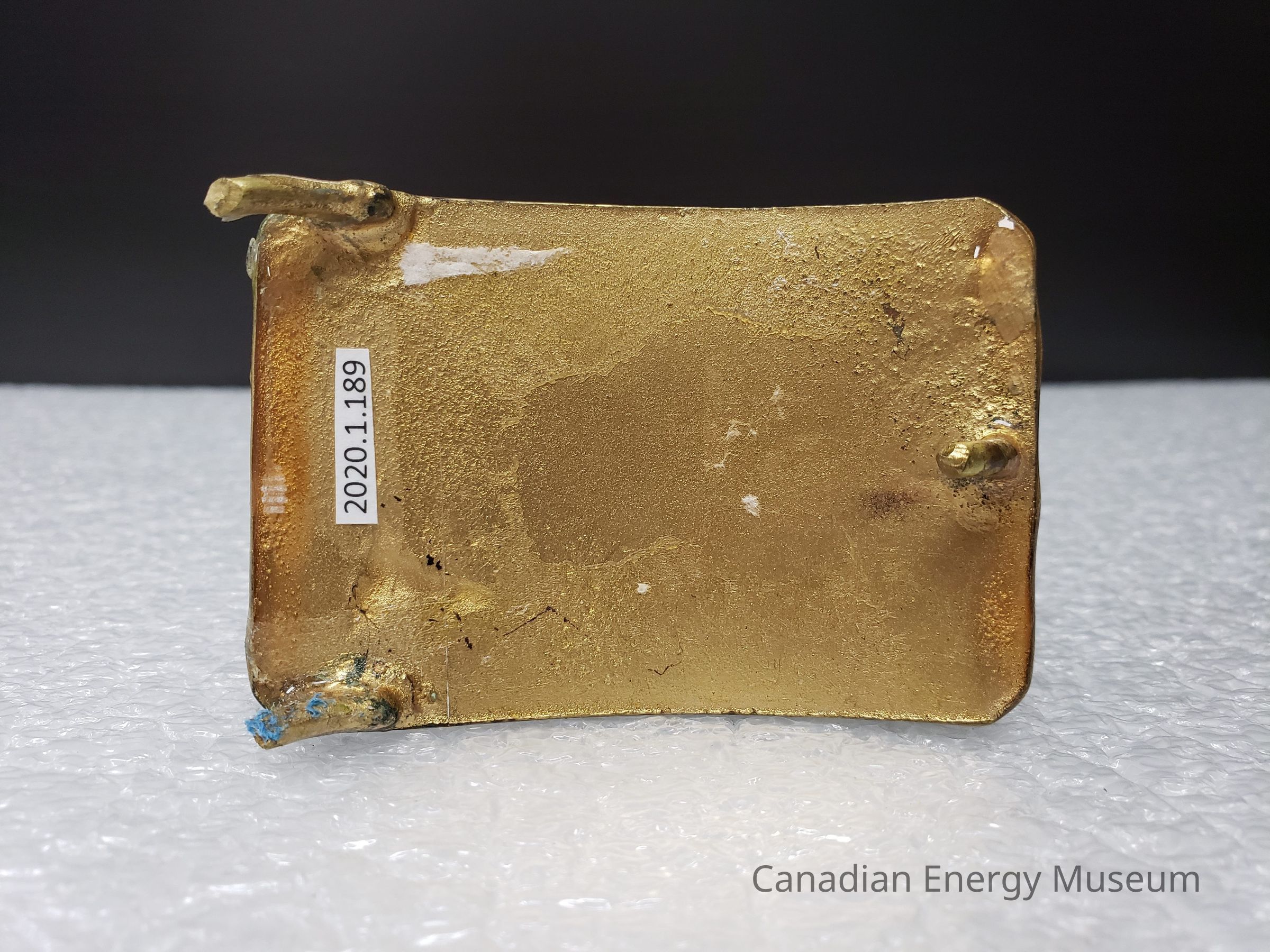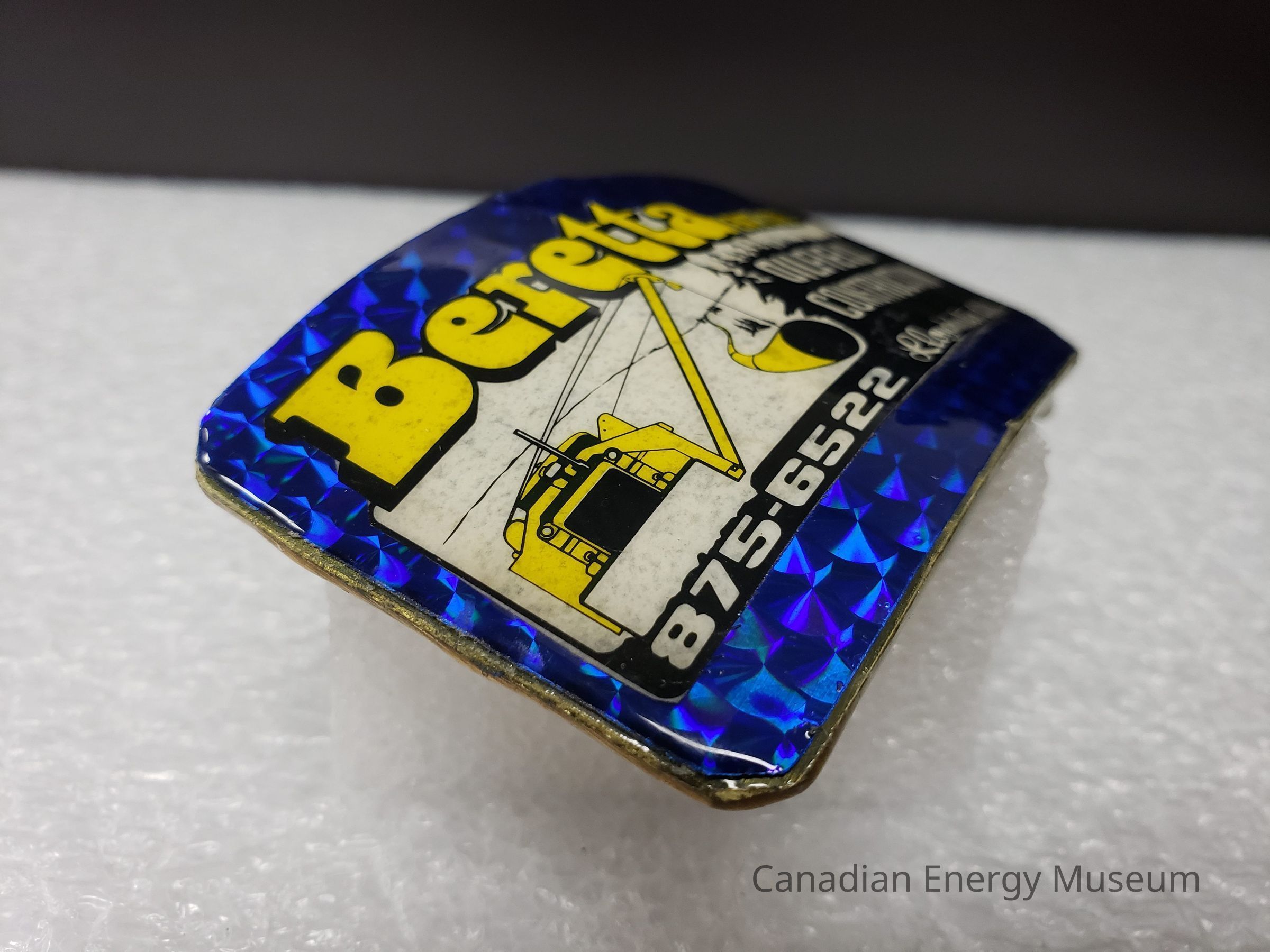 Old Description: (Kelsey Dalrymple, 3 June 2020) Beretta Ent. Ltd. Oilfield Construction. Rectangular brass buckle with blue enamel face. Sticker with logo attached to front (Donated by Gordon McQuaig).Collection
