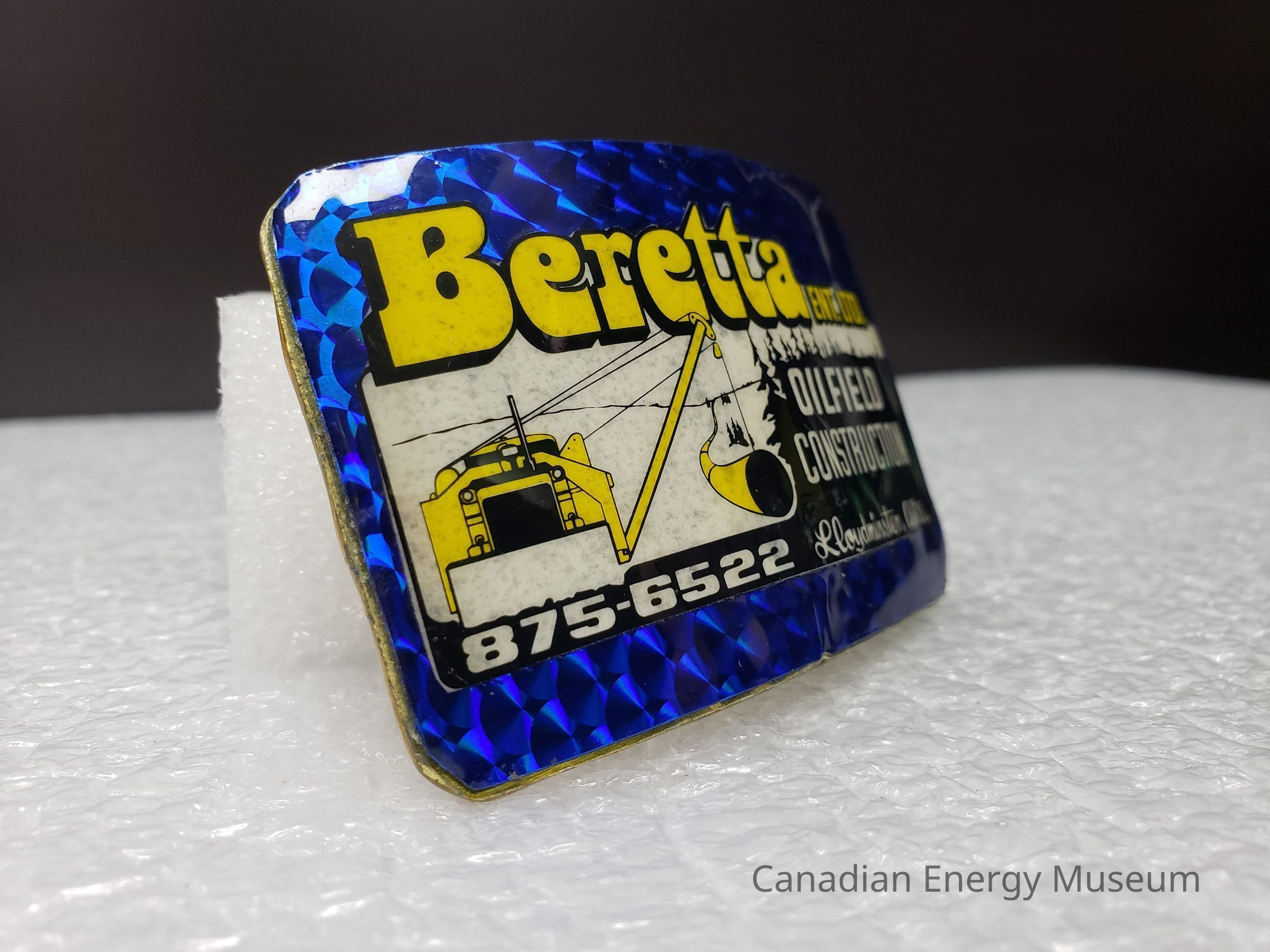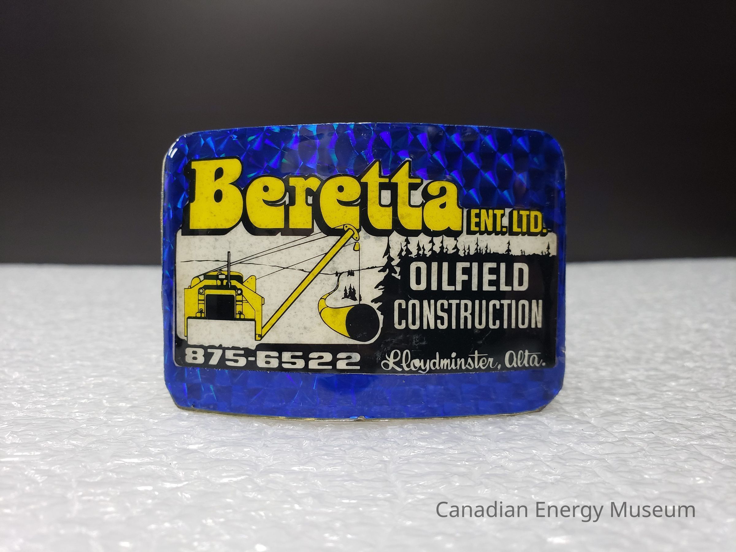Front Design: Laminated over the front surface of the buckle is a sheet of blue holographic paper/plastic, with a circular design. The edges have been trimmed to match the shape of the buckle. Placed on top of the holographic sheet is a printed design branded to "Beretta Ent. Ltd." The design is an elongated, horizontal rectangle, with "Beretta" in large bubble-styled text breaking the silhouette of the rectangle at the top-left, and "ENT. LTD." in smaller text tot he right. The rectangle section is white, with a black forest silhouette to the right side and along the base. In the black section is written "OILFIELD; CONSTRUCTION; Lloydminster, Atla" to the right, and "875-6522" at the bottom left. In the left portion of the rectangle is a yellow and black piece of machinery laying pipe. The pipe extends off into the background where it meets with a simple line suggestion of rolling hills. This whole design has been carefully cut out and overlaid over the holographic background, then a coating of some sort of clear sealant has been applied.