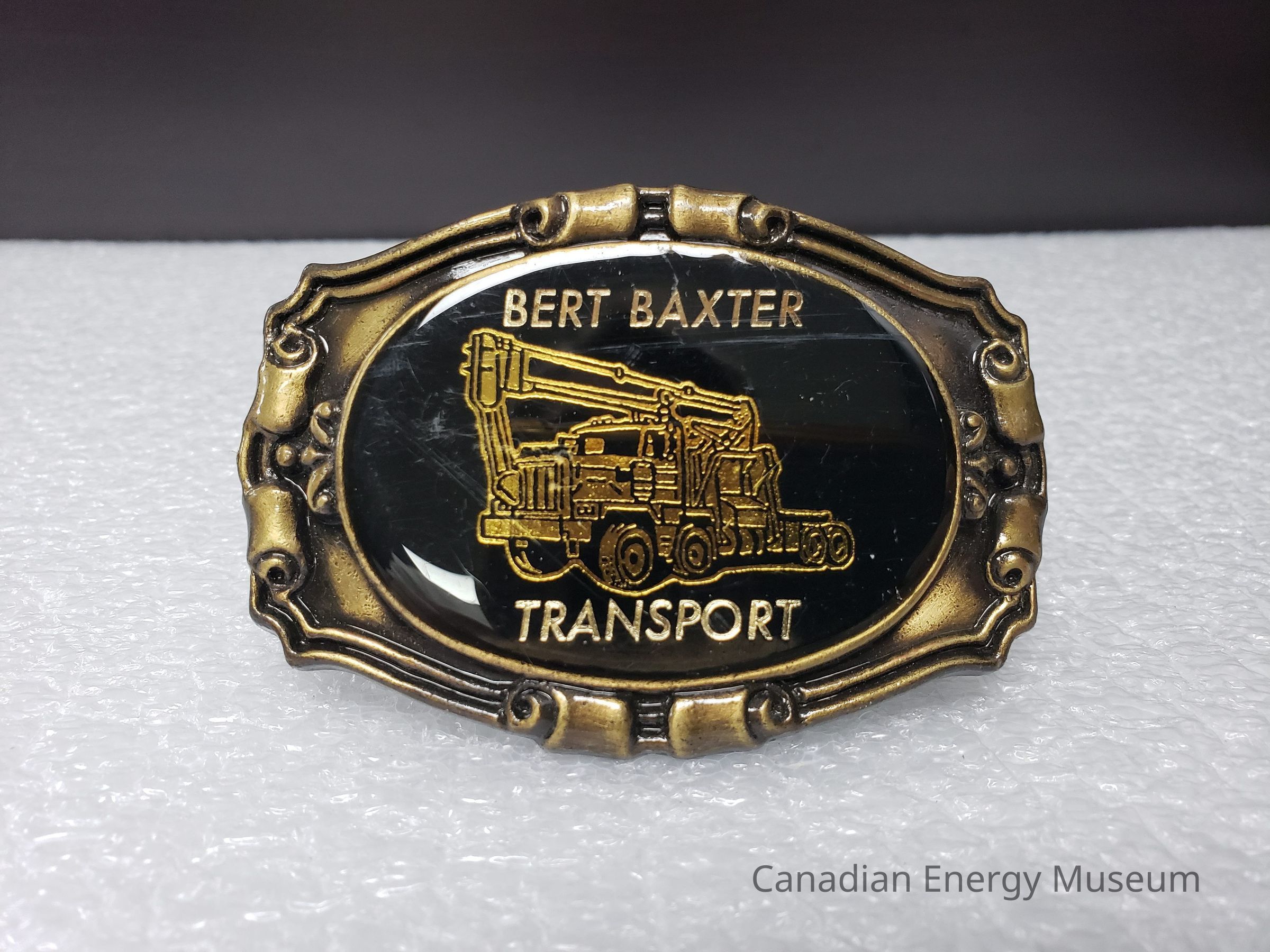 Old Description (Kelsey Dalrymple, 3 June 2020): Bert Baxter Transport. Brass belt buckle with black enamel face. Yellow semi on face.Collection