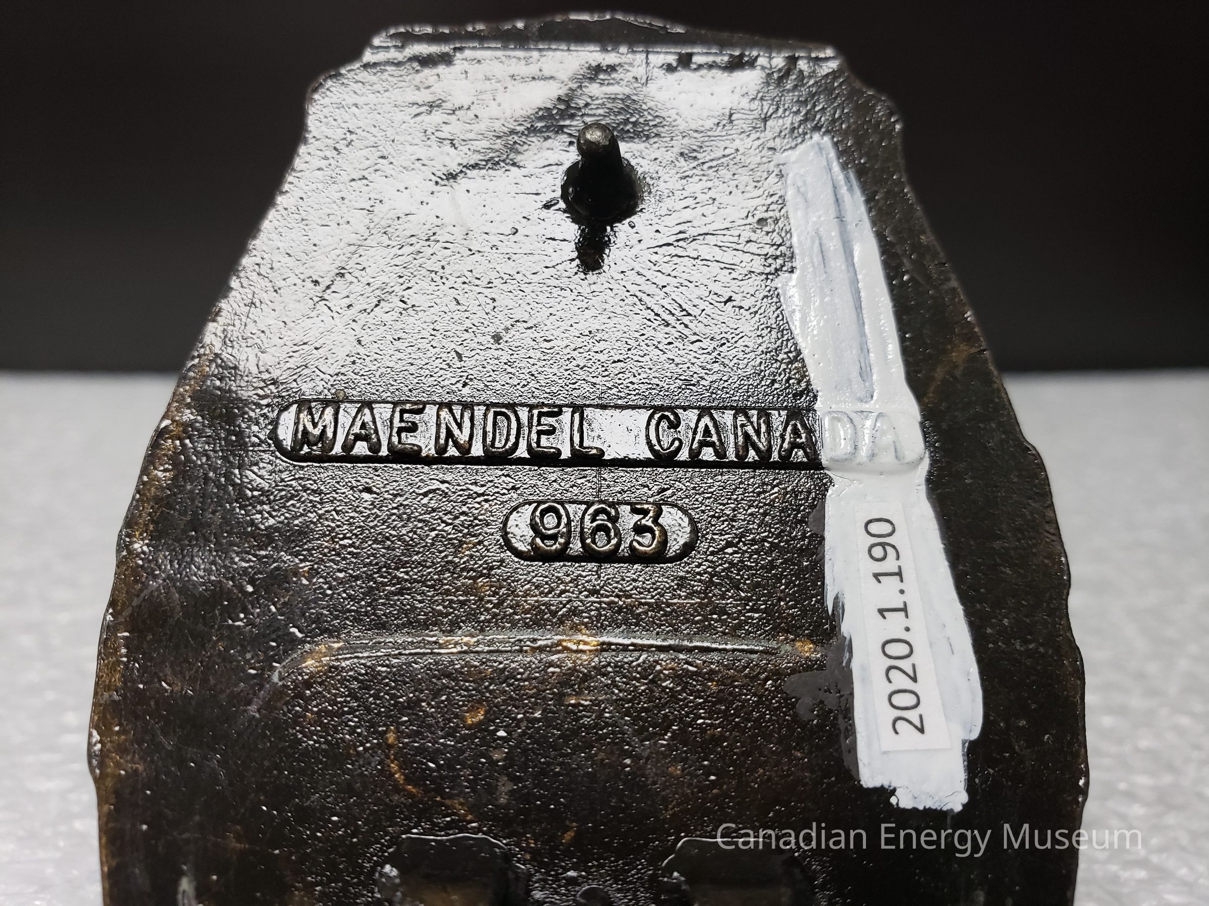 Back Elements: The back is dark-brown with a smooth texture. Included are a curved, tapered hook (right) and an irregular hexagonal-shaped hinge attached at two points. Between these elements are two vertical rounded strips (one long, one short) with the raised text "MAENDEL CANADA" (long on right) and "963" (short on left).