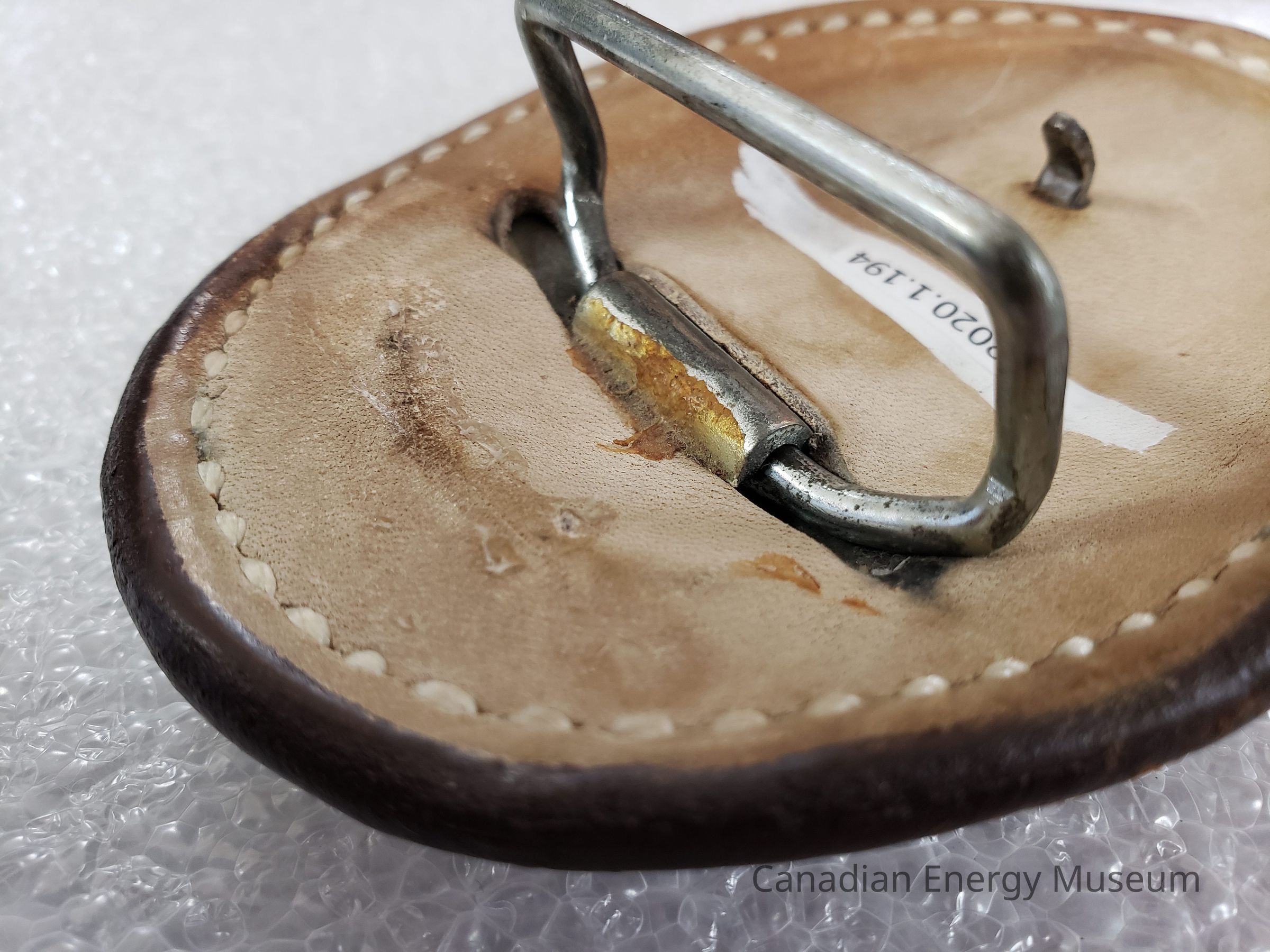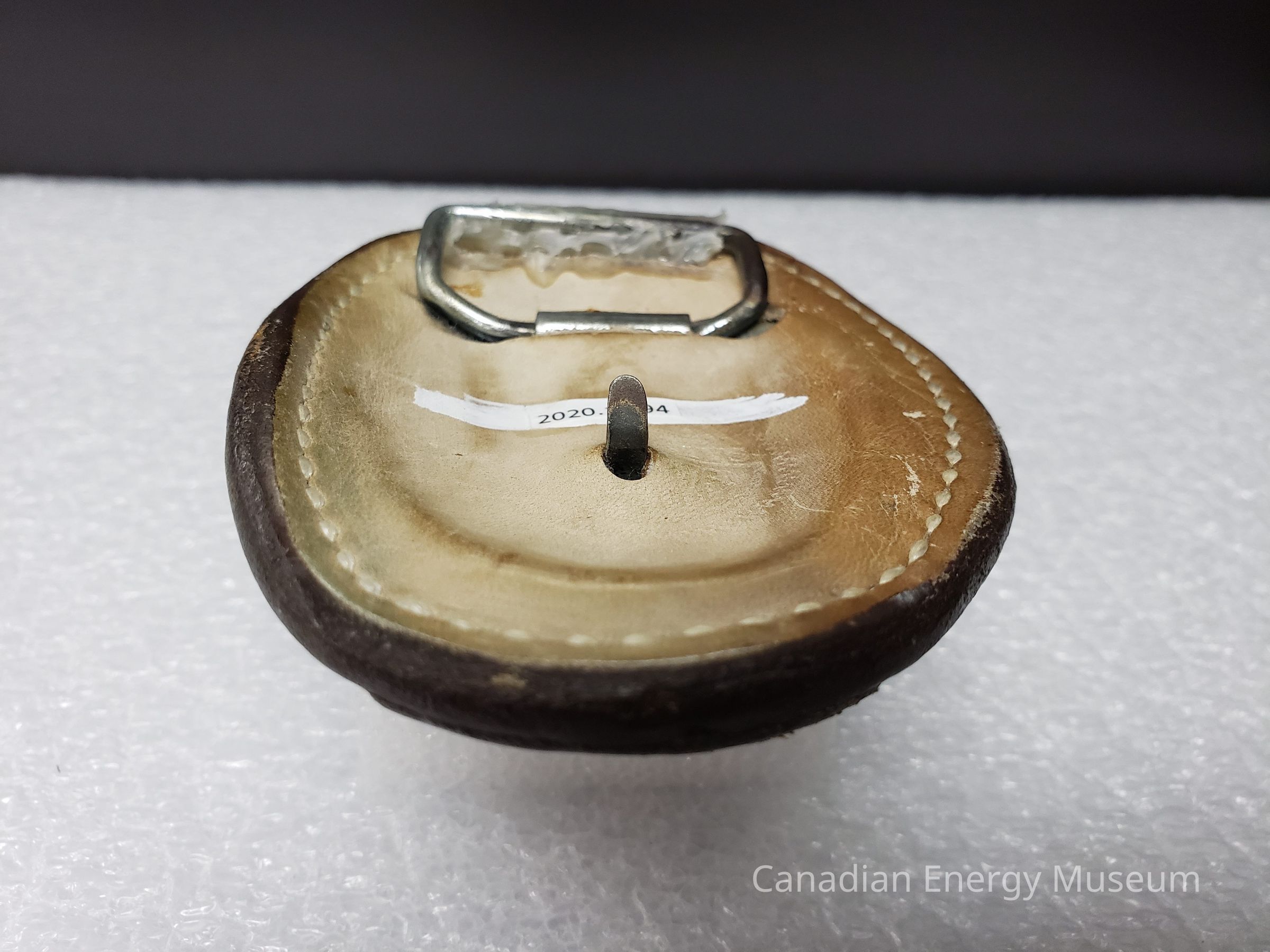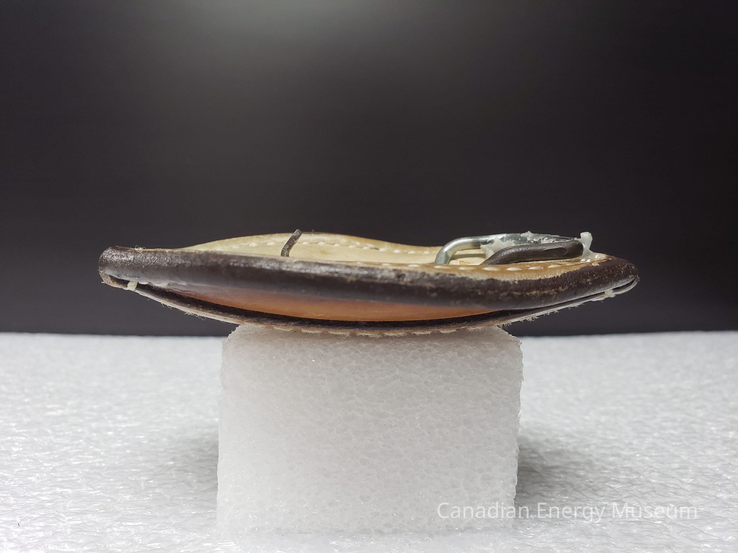 Back Elements: The back is covered with a lighter coloured leather, also stitched around the border with cream thread. A faint, circular maker's mark can be seen pressed into the leather, overlapping the hook. However, other than a triangular burst border and overall shape, the details cannot be made out. Beneath the leather cover appears to be a oval metal plate, slightly small than the overall area of the leather. Holes in the leather have been made, through which the hook and hinge are exposed. The hook is flat and curved inward. The hinge is an irregular hexagon, lightly bent, attached via a rounded, cylindrical base.