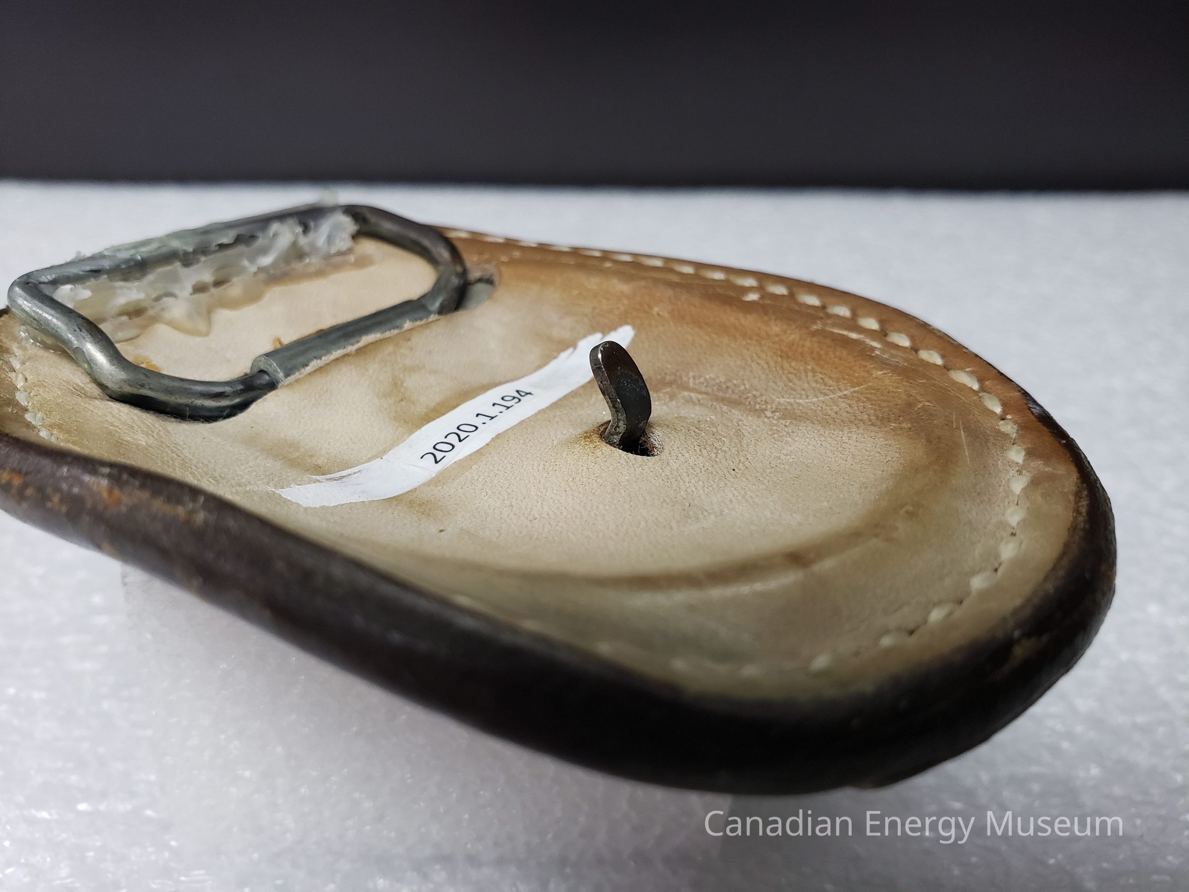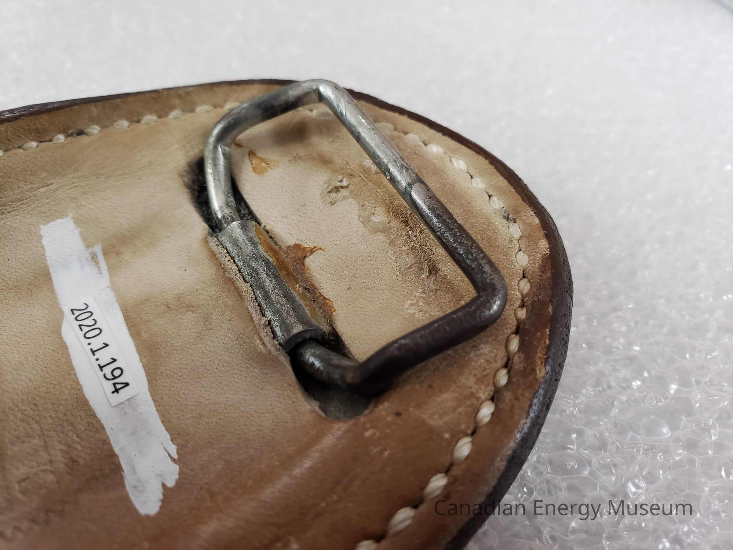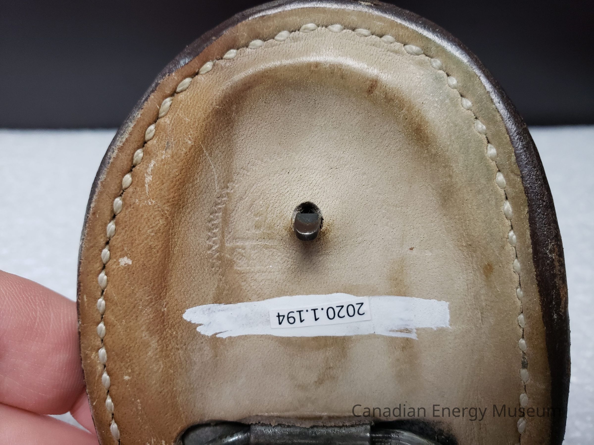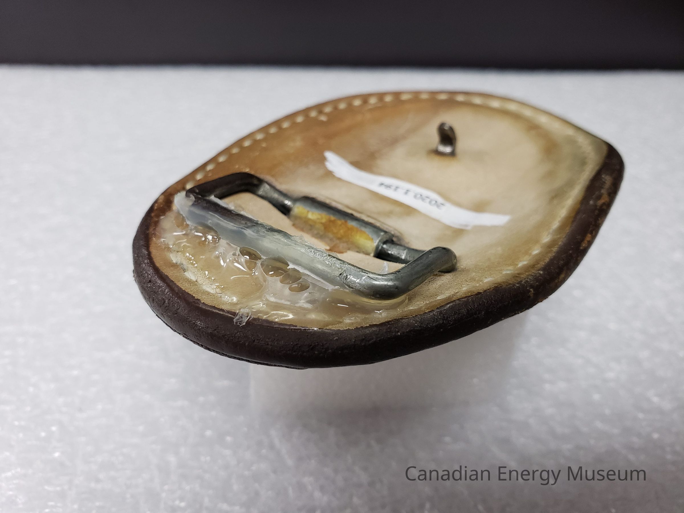 Back Elements: The back is covered with a lighter coloured leather, also stitched around the border with cream thread. A faint, circular maker's mark can be seen pressed into the leather, overlapping the hook. However, other than a triangular burst border and overall shape, the details cannot be made out. Beneath the leather cover appears to be a oval metal plate, slightly small than the overall area of the leather. Holes in the leather have been made, through which the hook and hinge are exposed. The hook is flat and curved inward. The hinge is an irregular hexagon, lightly bent, attached via a rounded, cylindrical base.