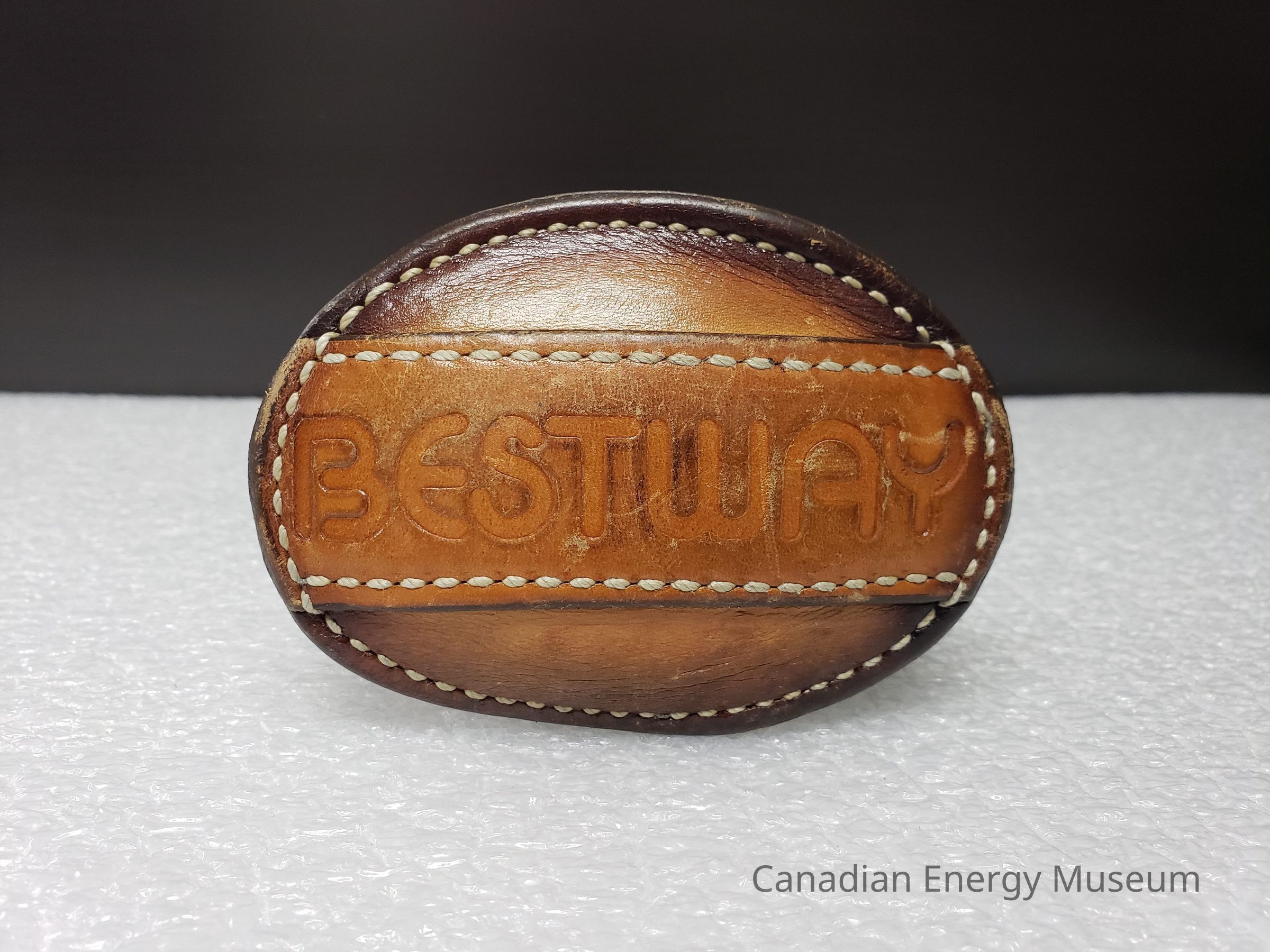 Old Description (Kelsey Dalrymple, 3 June 2020): Bestway. Oval leather belt buckle. Color of text has completely faded away.Collection
